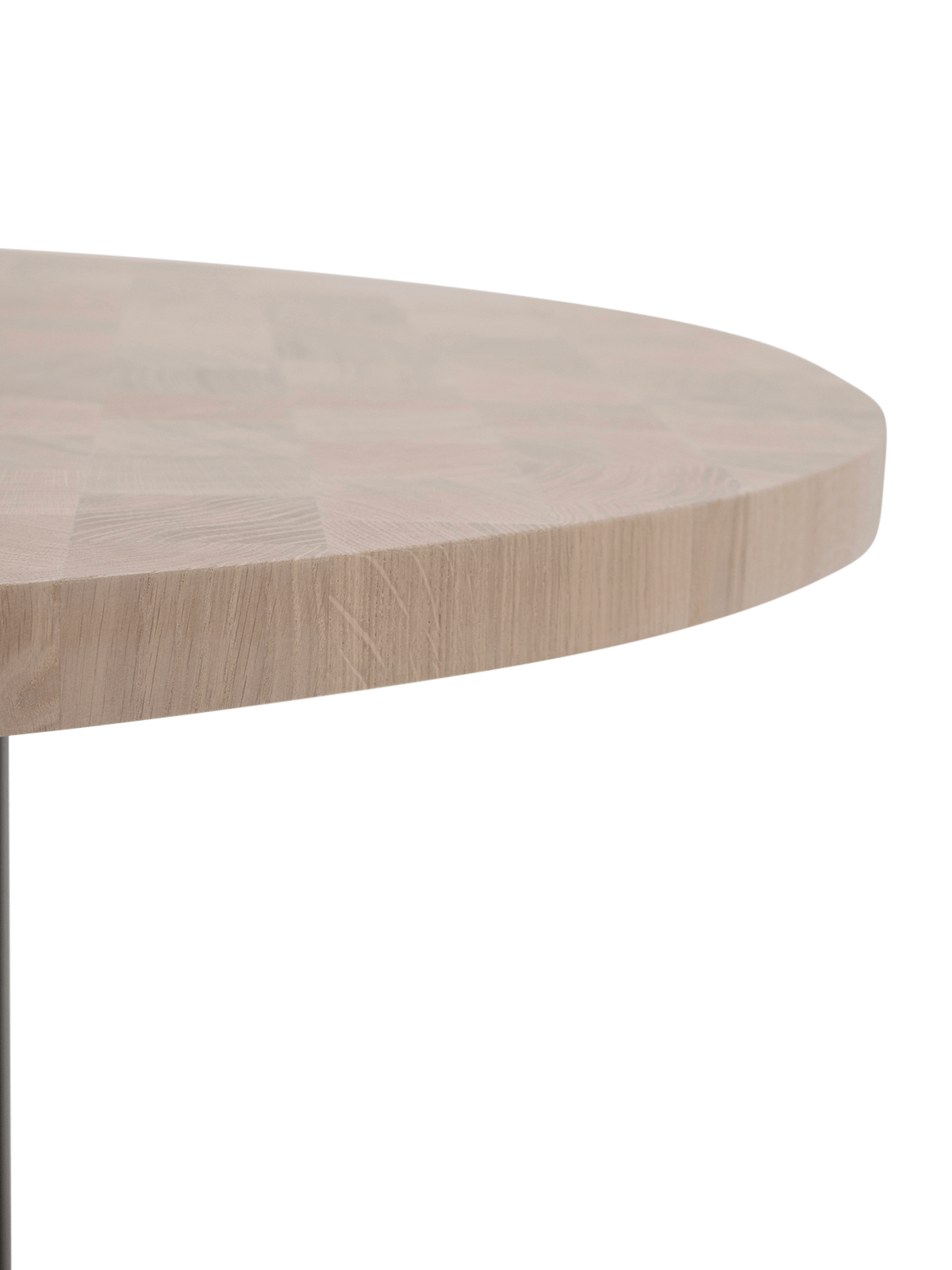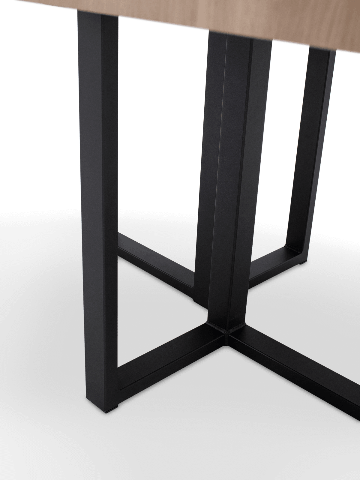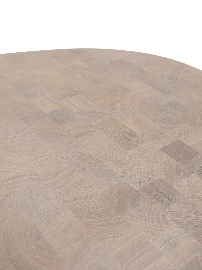 Het tafelblad is uitgevoerd in massief eikenhout en straalt pure kwaliteit uit. Met een bladdikte van 4 cm voelt Eris stevig en duurzaam aan, klaar voor dagelijks gebruik. De nerftekening en het blokpatroon in het hout geven het blad extra diepte en een natuurlijke levendigheid, waardoor elke tafel net dat tikkeltje uniek is.