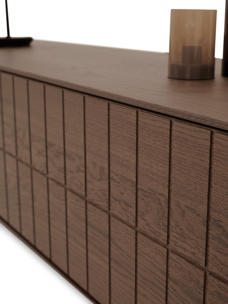 Het tv-meubel Cubio van het merk Dyyk combineert een strak ontwerp met de warme uitstraling van eikenhout. De tabacco dark gelakte afwerking geeft het meubel een diepe, rijke kleur die meteen sfeer brengt in de woonkamer. De belijning in de fronten zorgt voor een subtiel grafisch effect dat het meubel een eigen karakter geeft.