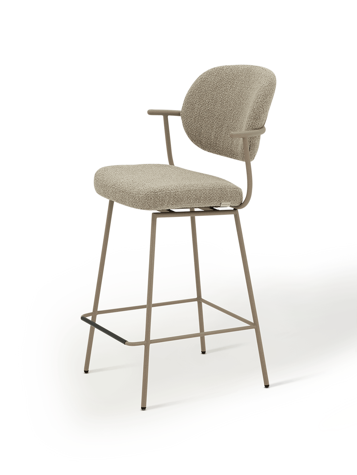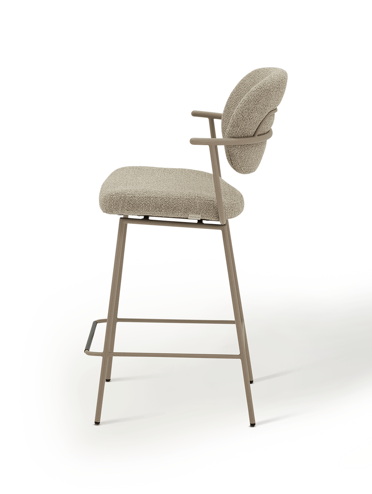 Wat deze barstoel extra interessant maakt, is de personalisatie. Je kan kiezen voor een uitvoering zonder armleuningen of met een open arm, afhankelijk van de ruimte en het comfort dat je zoekt. Voor de open arm zijn er bovendien verschillende opties: een armleggerhoes in leer of stof, een baggy armlegger in leer of stof, of een houten armlegger. Ook qua afwerking heb je veel vrijheid dankzij de ruime keuze aan stof-, leer- en lakcombinaties, zodat je de barstoel moeiteloos afstemt op jouw keuken, vloer en eethoek.