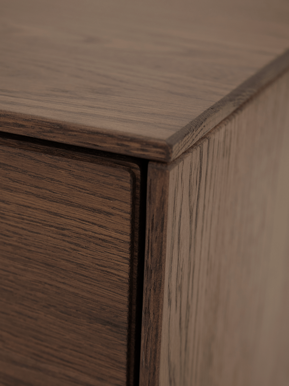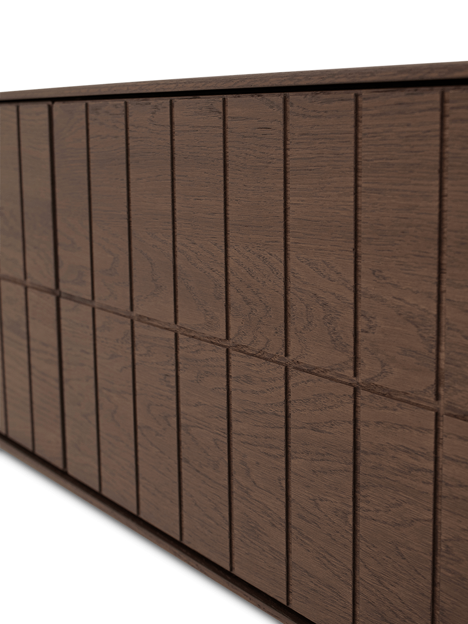Het zwevend tv-meubel Cubio van het Nederlandse merk Dyyk is een perfecte vertaling van hedendaags design. De warme dark tobacco kleur in eik fineer geeft het meubel een luxueuze en diepe uitstraling, terwijl het verfijnde verticale lijnenspel op de deuren zorgt voor een subtiele, grafische toets. Deze combinatie maakt Cubio helemaal volgens de laatste interieurtrends: warm, strak en tot in detail afgewerkt.