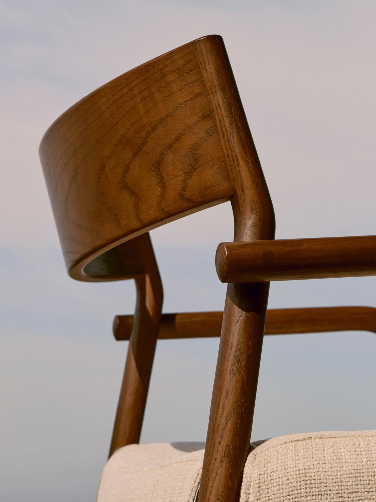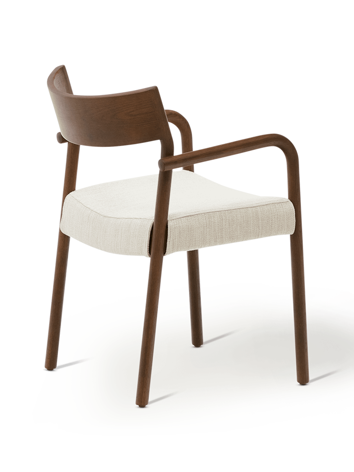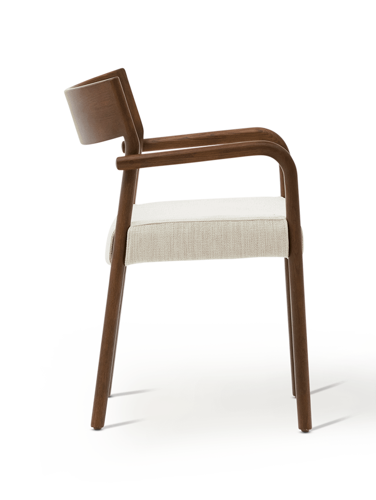 Falconera onderscheidt zich door zijn ergonomisch gevormde rugleuning en armsteunen, die subtiel aansluiten op de zithoogte voor optimaal comfort. De slanke, afgeronde poten dragen bij aan een lichte uitstraling en benadrukken het verfijnde karakter van het ontwerp.
