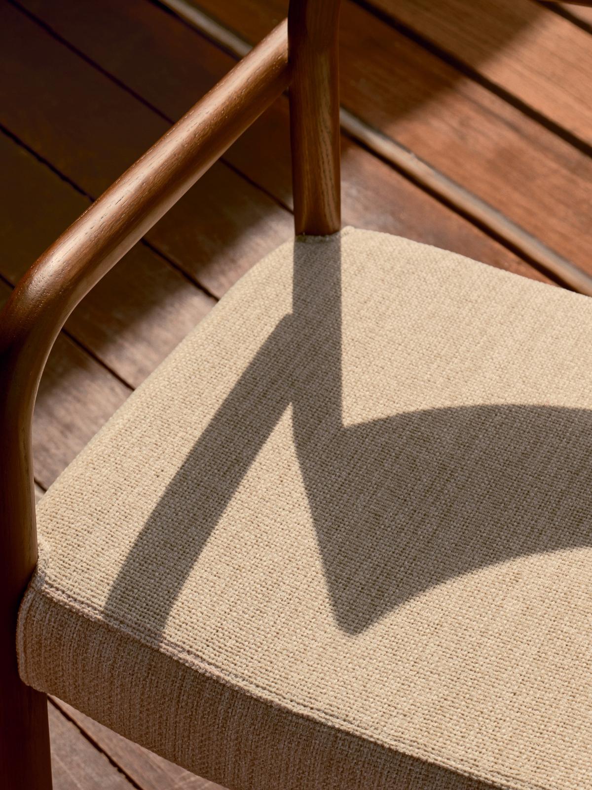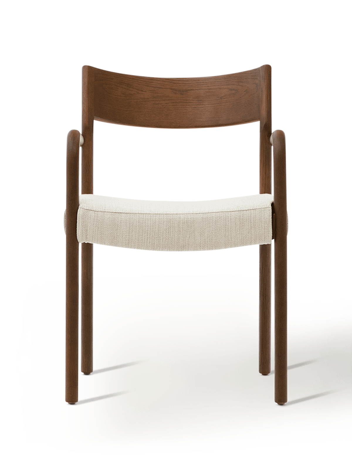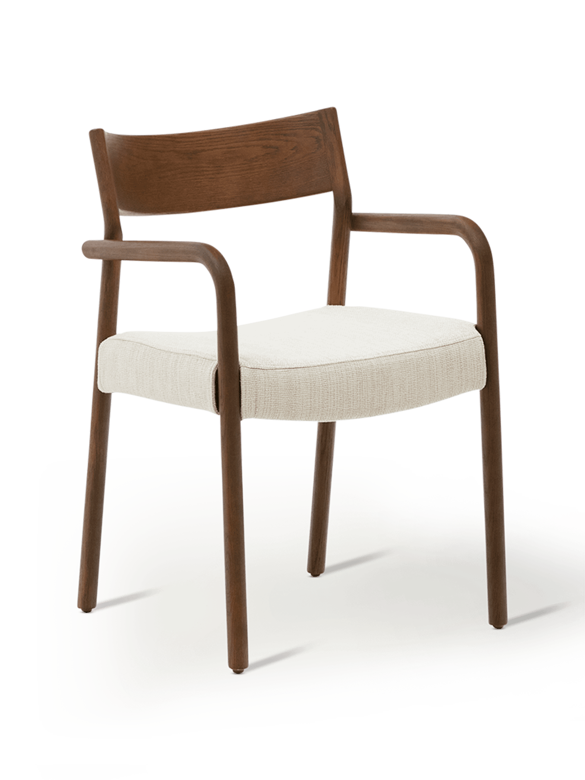Falconera onderscheidt zich door zijn ergonomisch gevormde rugleuning en armsteunen, die subtiel aansluiten op de zithoogte voor optimaal comfort. De slanke, afgeronde poten dragen bij aan een lichte uitstraling en benadrukken het verfijnde karakter van het ontwerp.