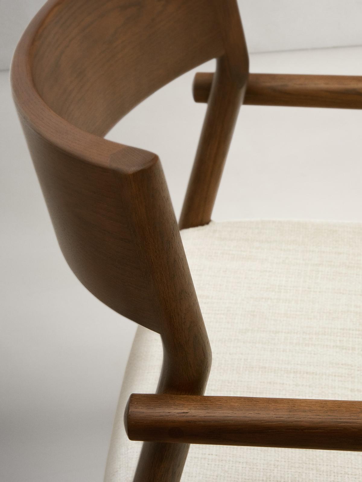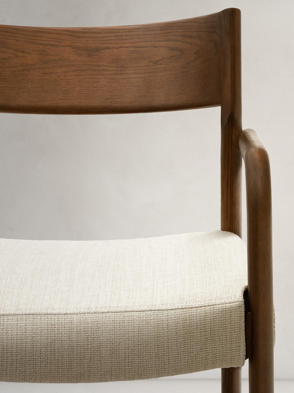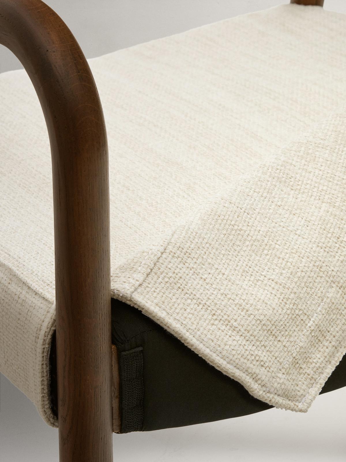 De stoel is vervaardigd uit massief eikenhout met walnootafwerking (FSC Mix Credit) – een garantie voor duurzaamheid en kwaliteit. De zichtbare houtnerf versterkt de natuurlijke charme, terwijl de beige chenille zitting zorgt voor een uitnodigend en comfortabel zitgevoel. De afneembare hoes maakt het onderhoud eenvoudig, zodat de stoel zijn frisse uitstraling behoudt, ook bij dagelijks gebruik.