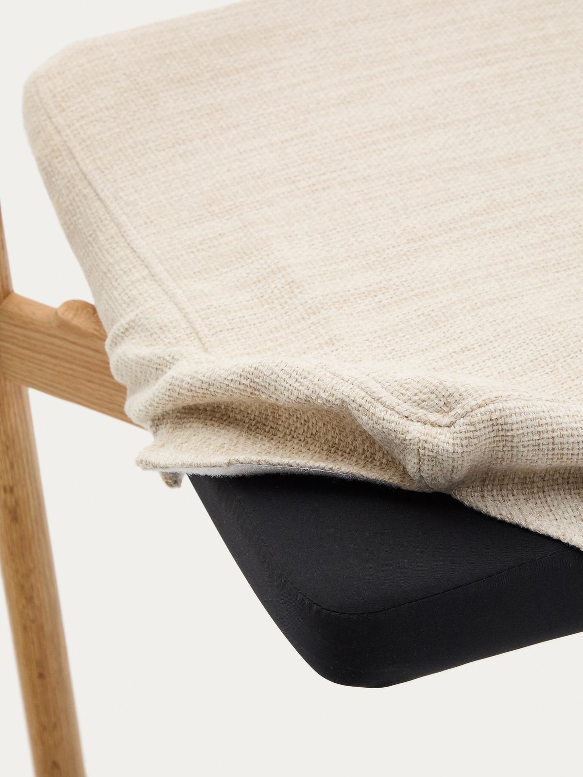 Het onderstel van de Alocs stoel is gemaakt van massief eikenhout (FSC Mix Credit) — duurzaam, sterk en met een prachtig zichtbare nerfstructuur. De zitting is bekleed met beige chenille, een zachte en comfortabele stof. De afneembare hoes maakt de stoel bovendien praktisch in onderhoud, ideaal voor dagelijks gebruik.