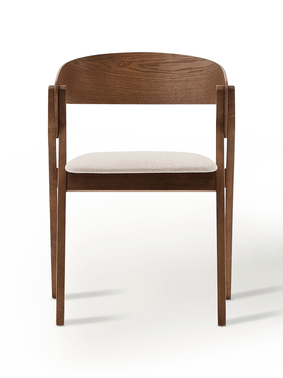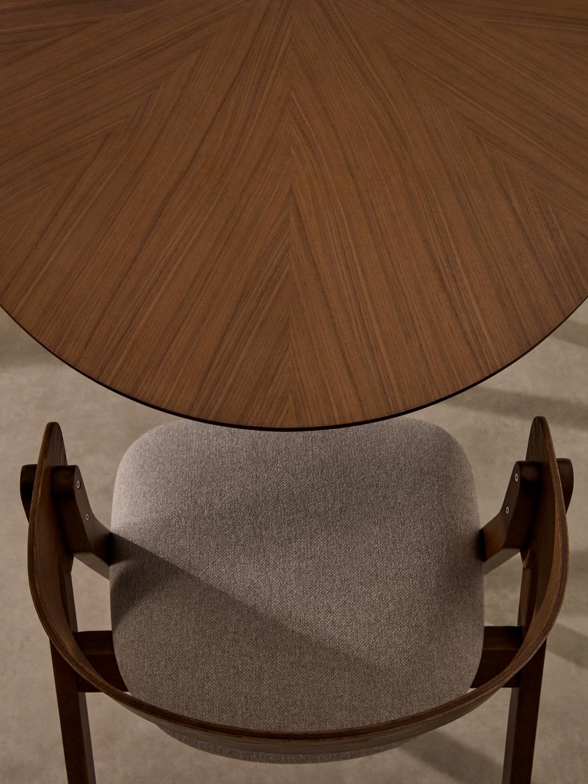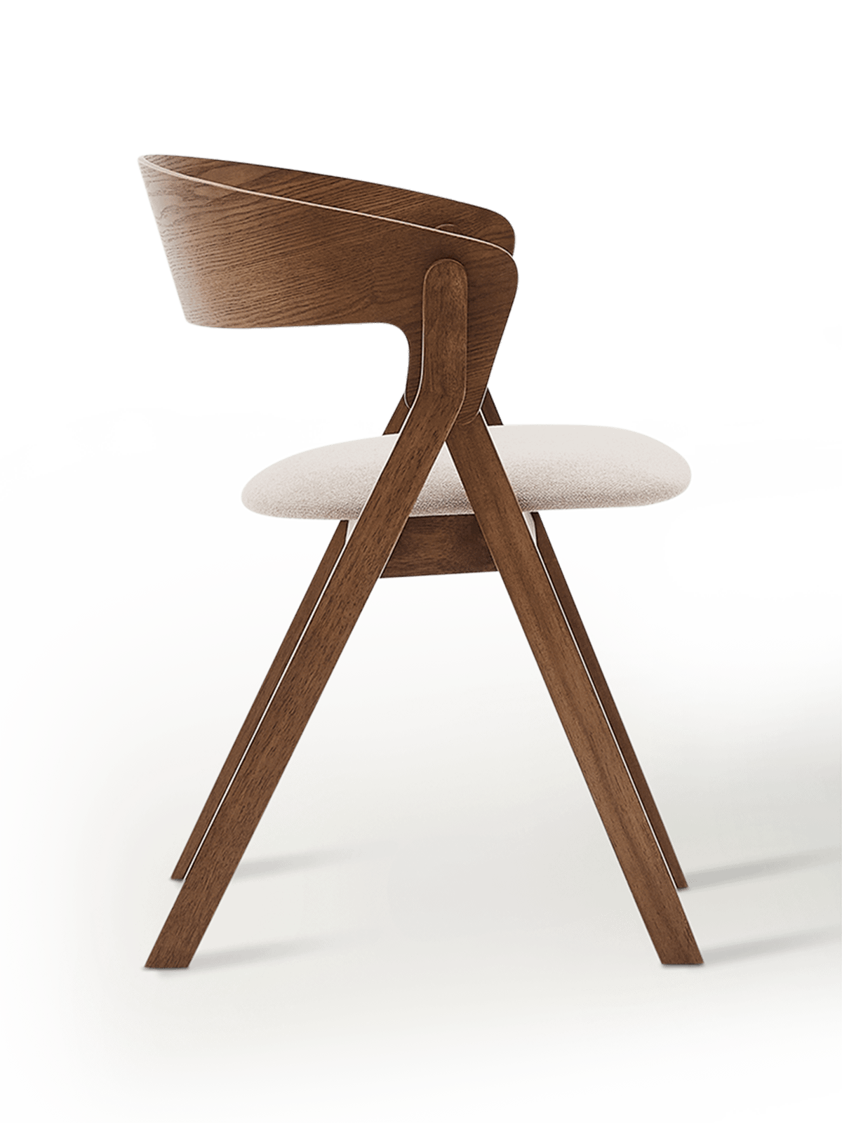 Godia stoel van essenhoutfineer met een wengé afwerking en beige chenille