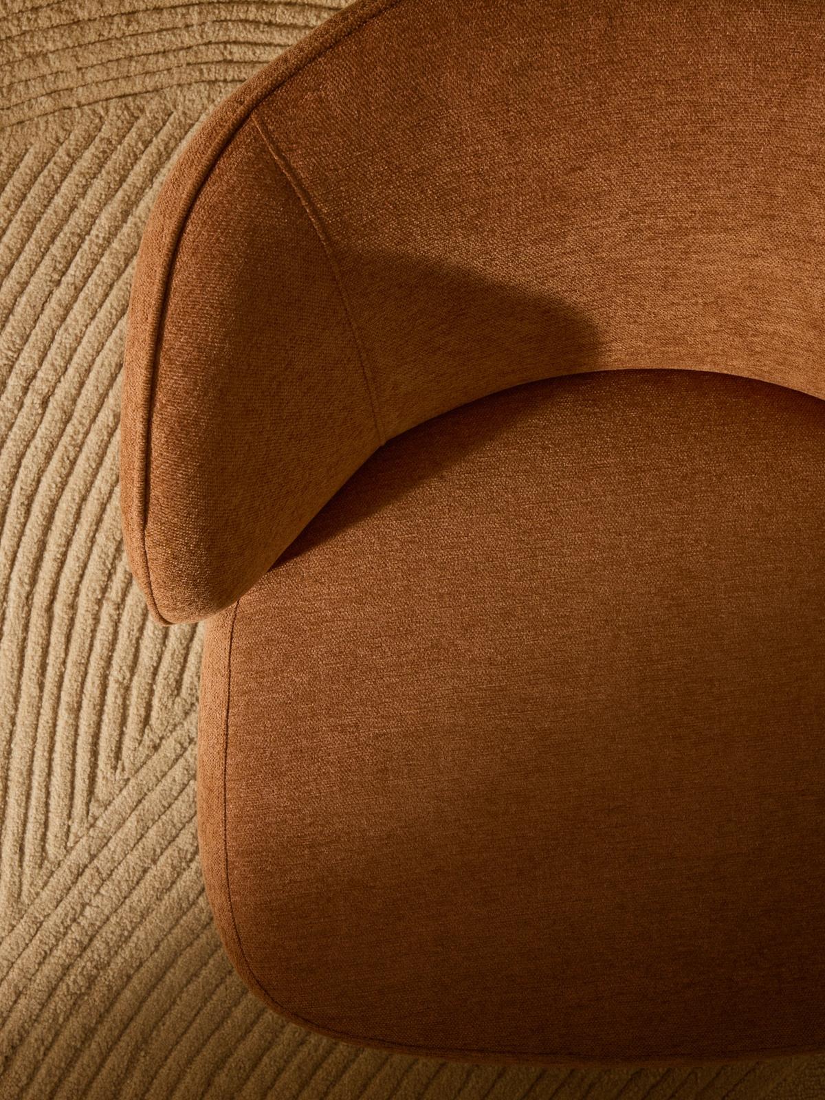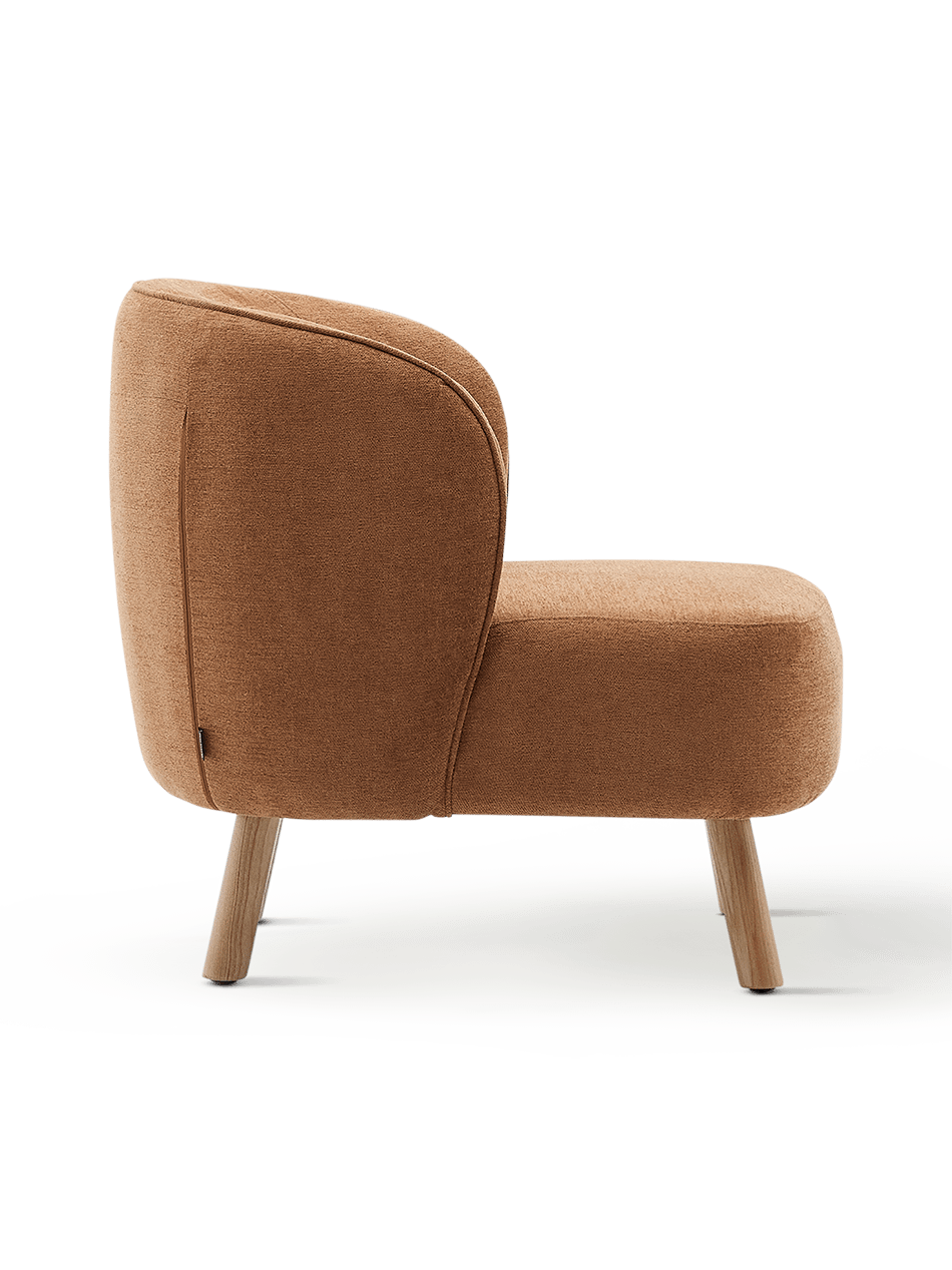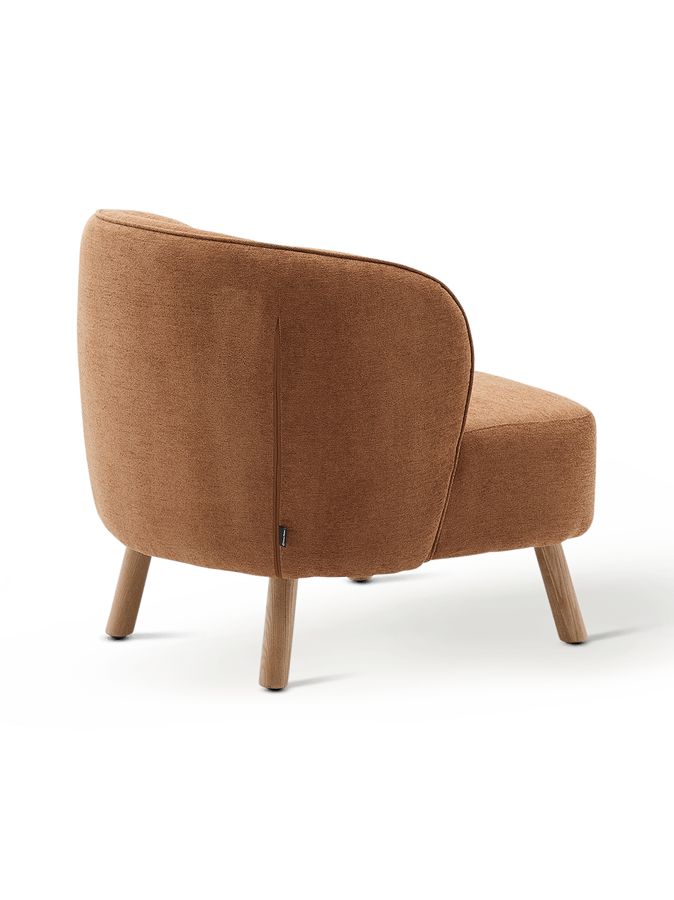 Fauteuil Ulit in terracotta chenille met massief beukenhouten poten natuurlijke afwerking.