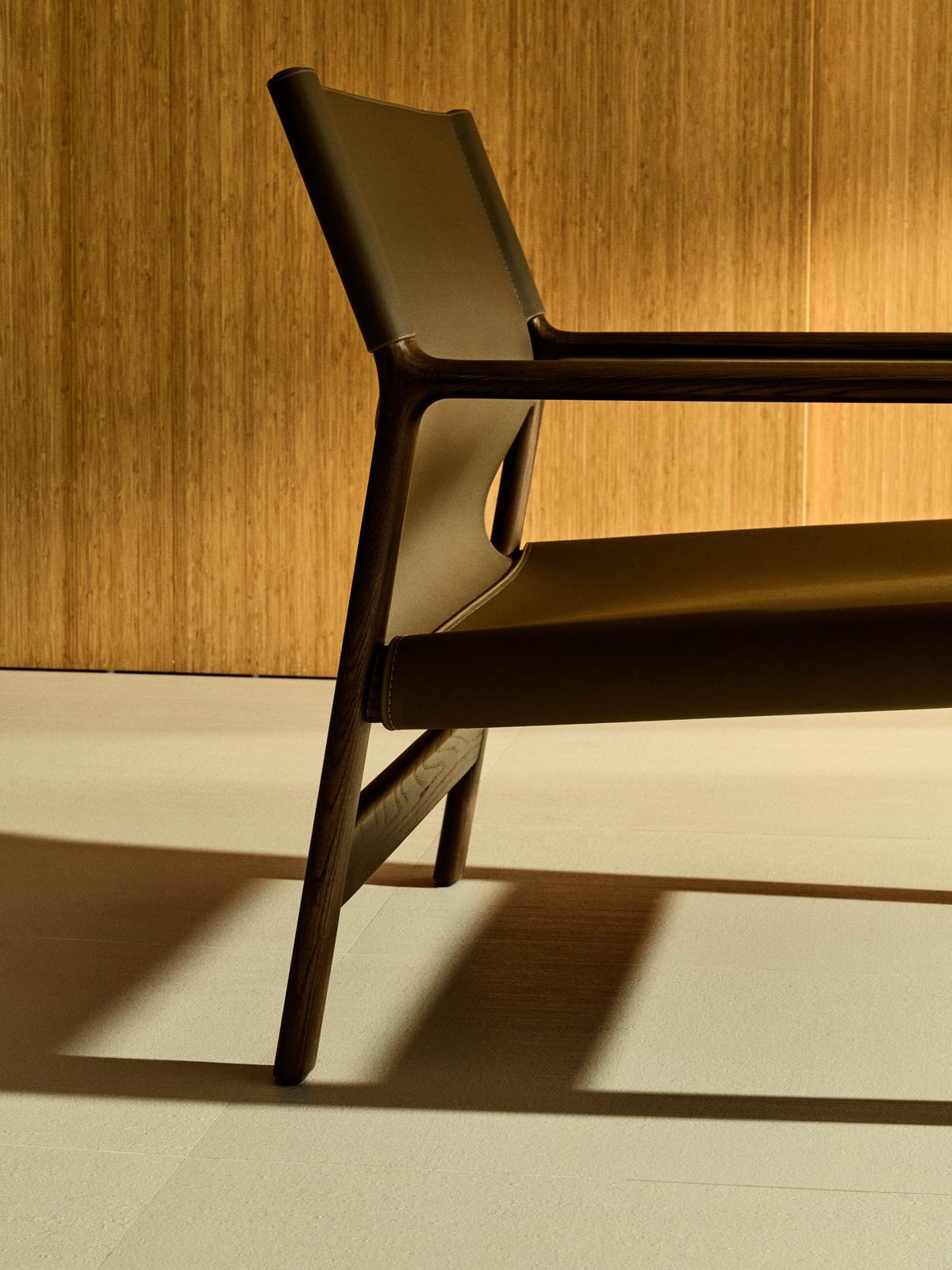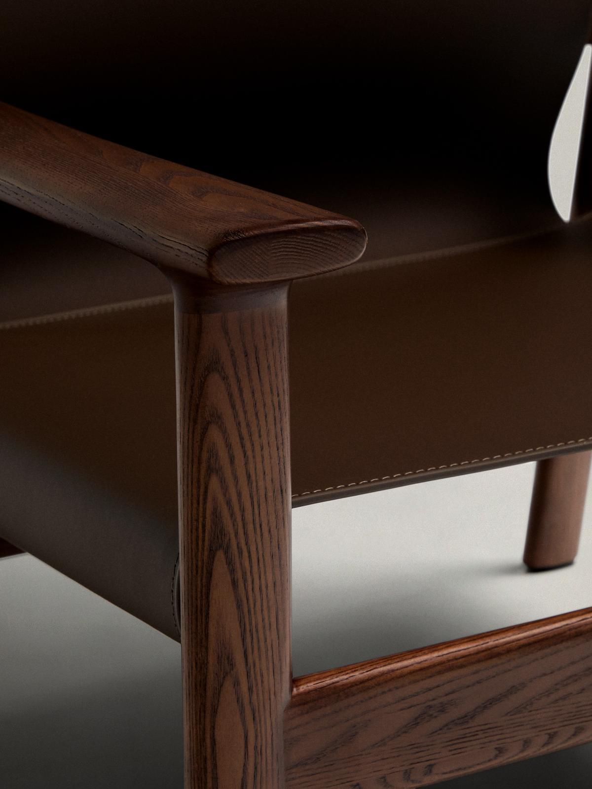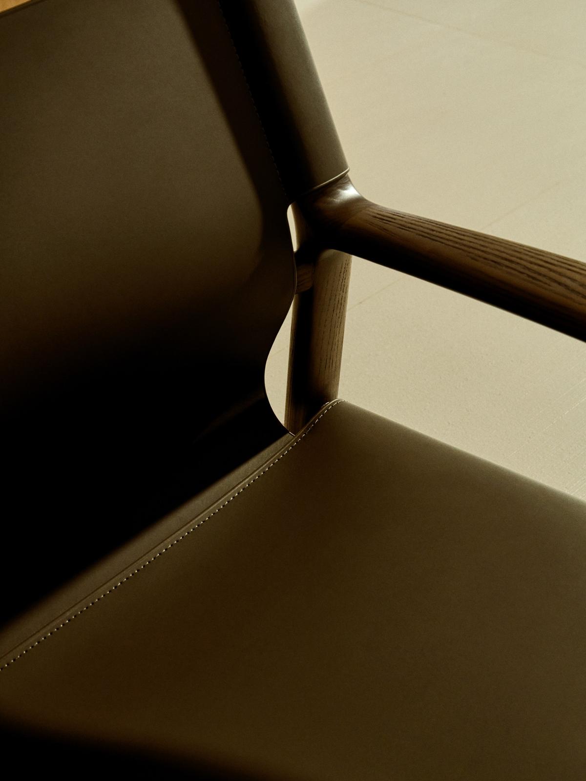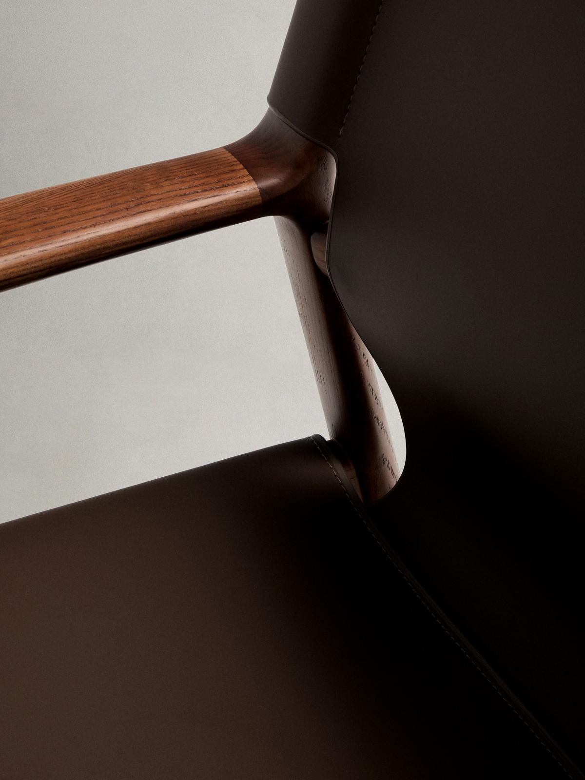 Jan is de collectie die de harmonie belichaamt tussen klassiek en modern, ontworpen voor mensen die waarde hechten aan zowel esthetiek als de zintuiglijke ervaring van design. Het silhouet met zachte lijnen en uitgebalanceerde proporties is geïnspireerd op traditie, geherinterpreteerd met een eigentijdse look die het zowel decoratief als functioneel maakt. De sobere details van de structuur zorgen voor een verfijnde visuele identiteit en wekken vanaf het eerste moment een gevoel van comfort. De ergonomie omarmt het lichaam terwijl de textuur de zintuigen streelt. De structuur is gemaakt van massief essenhout met 100% FSC©-certificering. Dat betekent dat het hout afkomstig is uit bossen die zijn gecontroleerd en beheerd volgens de strenge sociale en milieunormen van de Forest Stewardship Council (FSC). De robuustheid en warmte worden gecombineerd met 85% hoogwaardig gerecycled leer, geselecteerd op zijn uitzonderlijke bestand tegen slijtage en vuur. Daardoor ontstaat een stevige pasvorm die zich aanpast aan het lichaam. Dit leer komt van een door de Leather Working Group gecertificeerde leverancier met een LWG Gold-classificatie, die duurzame praktijken en positieve veranderingen in verantwoorde leerproductie stimuleert. Jan gaat verder dan esthetiek: het is een meubelstuk ontworpen om de tand des tijds te doorstaan, dankzij de hoogwaardige materialen en de zorgvuldige constructie. Voorzien van beschermers onder de poten om elke ondergrond te behouden, bevestigt dit ontwerp zijn functionele karakter zonder ook maar iets in te leveren op stijl.