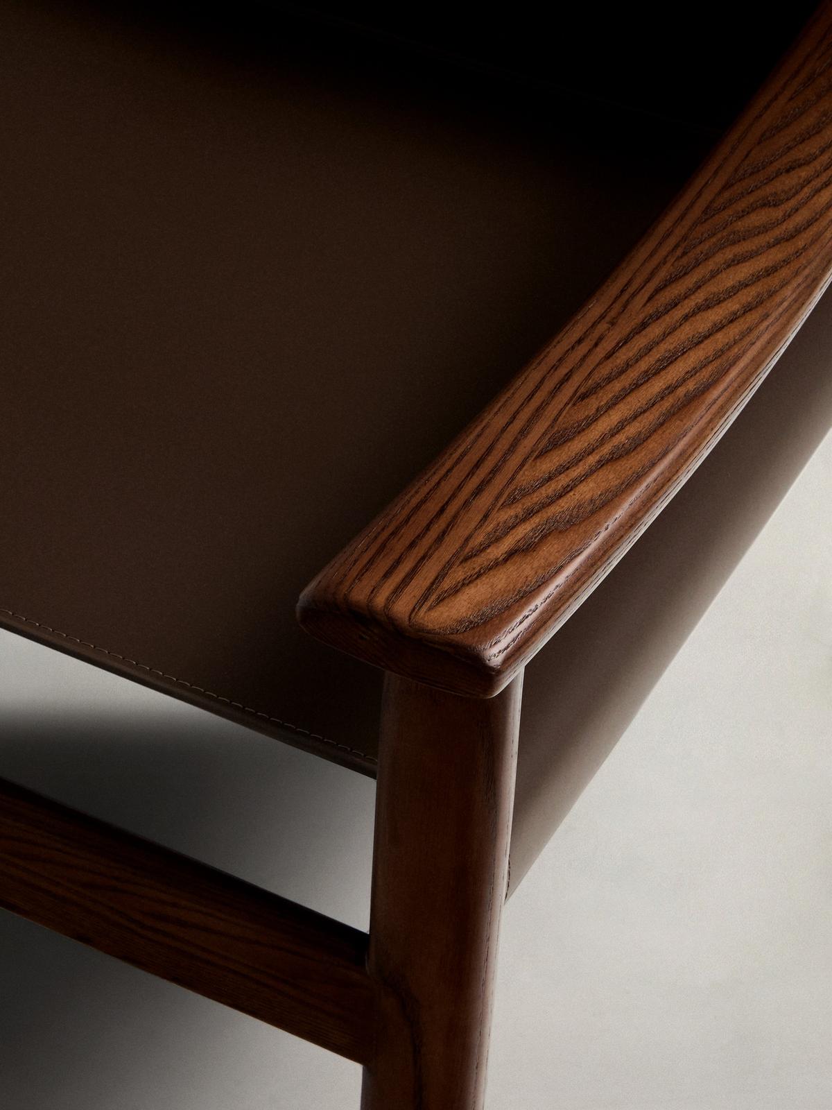 Donkerbruine Jan fauteuil gemaakt van gerecyclede leervezels en massief essenhout met afwerking in notelaarhouteffect FSC 100%
