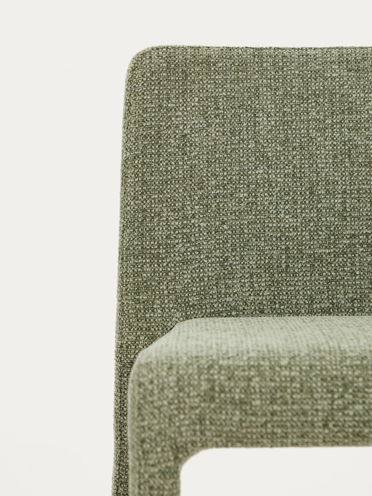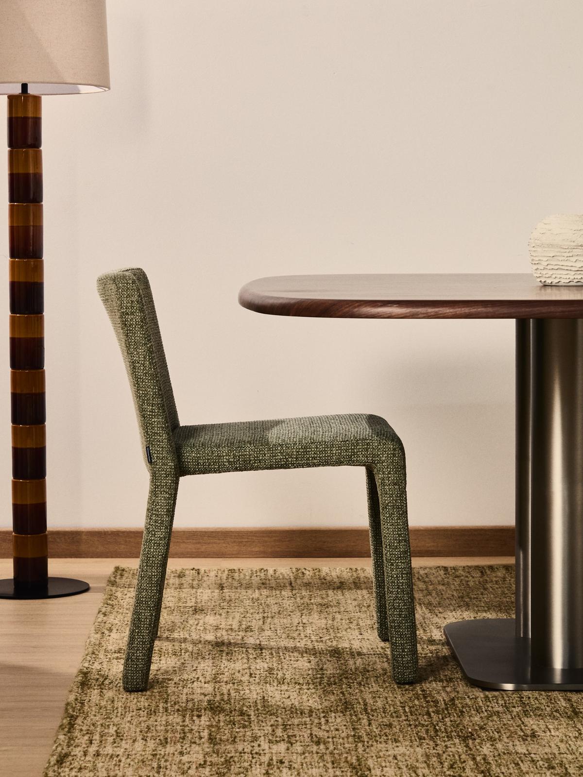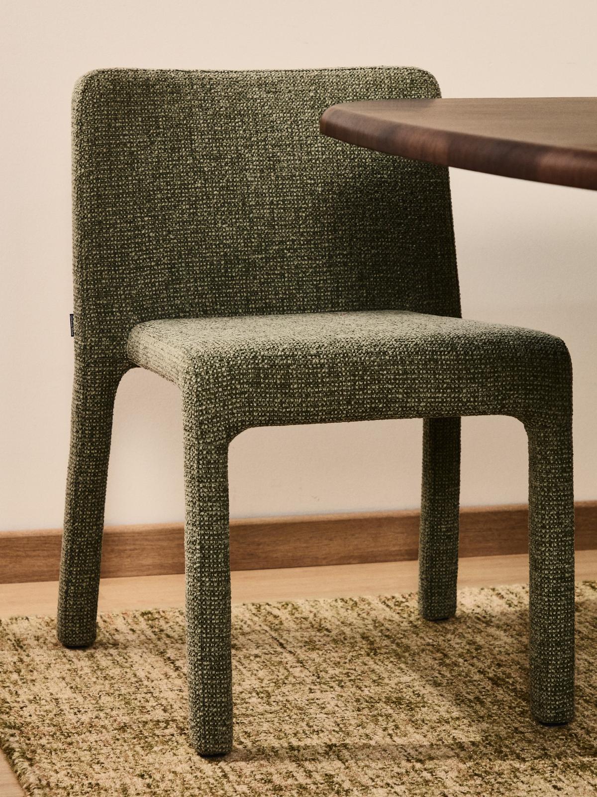Met zijn stijlvolle ontwerp en verfijnde volumes past deze beklede stoel elegant en discreet in allerlei soorten ruimtes. De lichte en evenwichtige vorm straalt eenvoud en originaliteit uit, waardoor het een veelzijdig meubelstuk is dat zich gemakkelijk aanpast aan zowel huiselijke als professionele omgevingen.