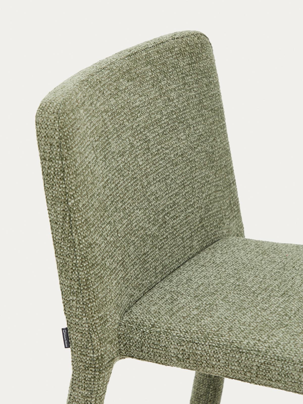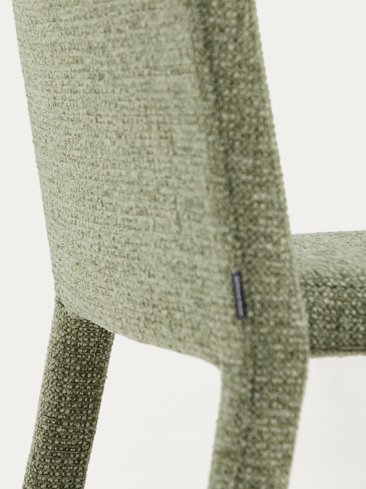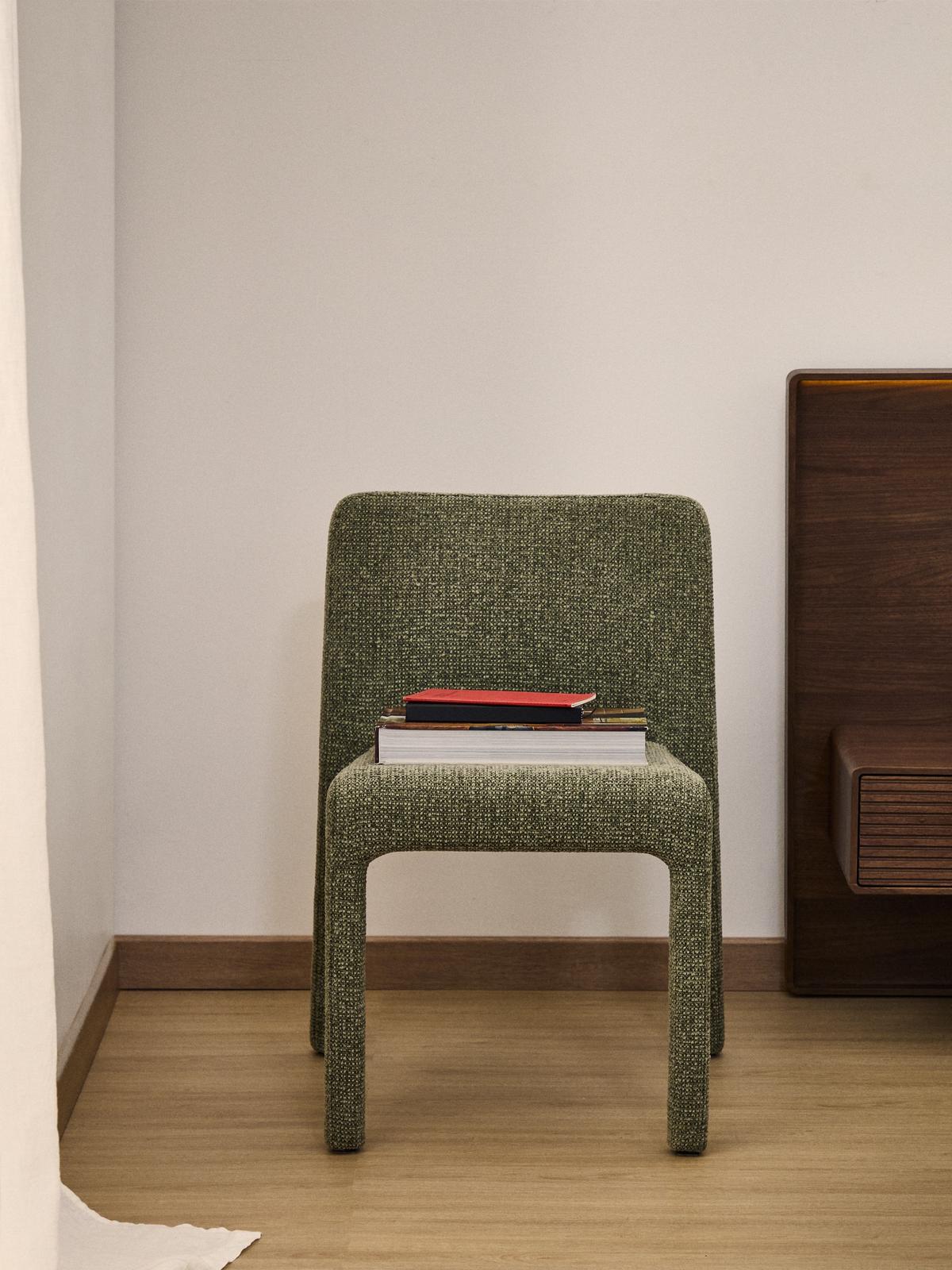 Met zijn stijlvolle ontwerp en verfijnde volumes past deze beklede stoel elegant en discreet in allerlei soorten ruimtes. De lichte en evenwichtige vorm straalt eenvoud en originaliteit uit, waardoor het een veelzijdig meubelstuk is dat zich gemakkelijk aanpast aan zowel huiselijke als professionele omgevingen.