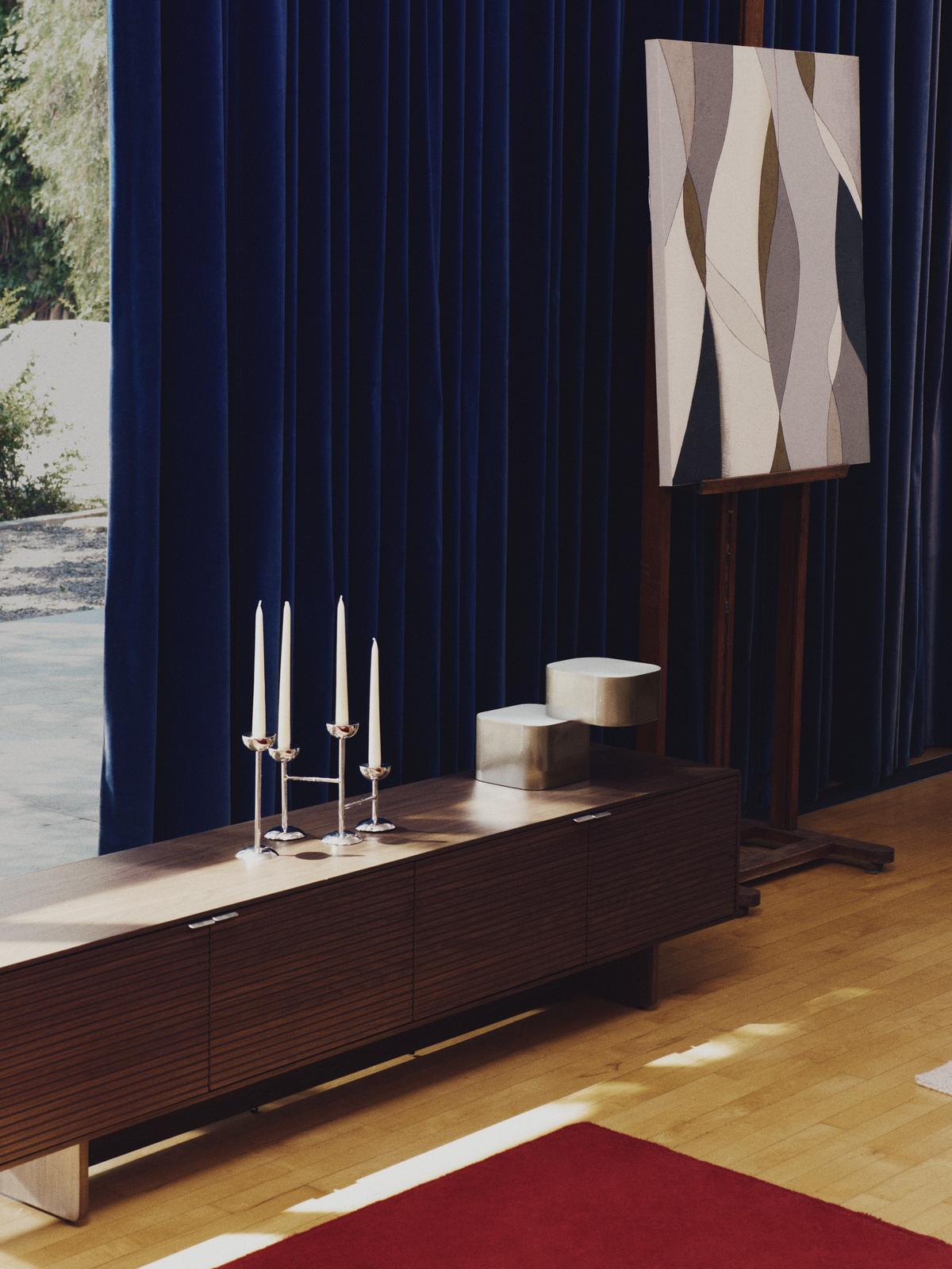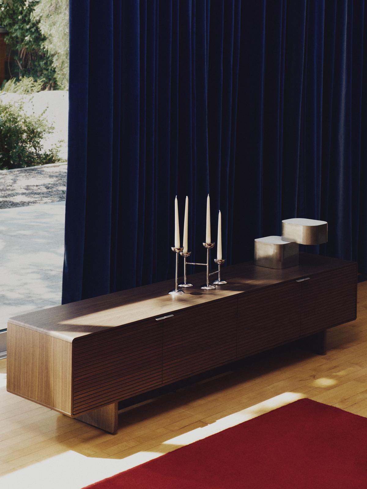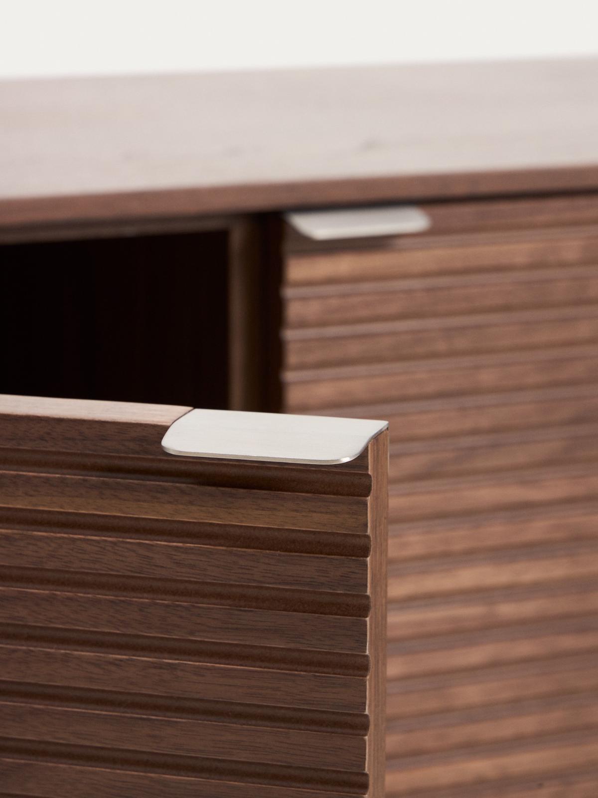 Norlen brengt een ode aan design uit de jaren 50 met een eigentijdse twist, waarbij minimalistische vormen worden gecombineerd met vintage details. De zachte, ronde hoeken en houten basis roepen een nostalgische sfeer op, geherinterpreteerd met pure lijnen en hedendaagse proporties. Het verdonkerde walnootfineer, aangebracht met een vacuümpers, past zich perfect aan op de rondingen van het meubel, waardoor de afwerking een eenheid vormt en elk exemplaar diepte en karakter krijgt. De afwerking van vernis op polyurethaanbasis garandeert slijtvastheid en vochtbestendigheid. De structuur van het meubel is gemaakt van MDF-plaat en de binnenpanelen zijn bedekt met melamine met een afwerking in dezelfde kleur, voor samenhang van het ontwerp. De handgrepen zijn van geborsteld roestvrij staal met een satijnafwerking, die de zichtbaarheid van vingerafdrukken en krassen vermindert en een hoge roestbestendigheid biedt. Bovendien zorgt het schuine ontwerp voor een gemakkelijkere grip bij het openen van de deur. Gecertificeerd met FSC Mix Credit-label, dus gemaakt van een combinatie van materialen uit FSC-gecertificeerde bossen en FSC-gecontroleerd hout. Elk element is ontworpen om functionaliteit te bieden zonder afbreuk te doen aan stijl: van de verstelbare planken aan de binnen- en buitenkant tot het beslag van hoge kwaliteit, met verborgen scharnieren en rails met antiroestafwerking. Bovendien zijn de meubelen voorzien van verstellers in de basis voor een nauwkeurige aanpassing aan elk oppervlak. Een collectie die functionaliteit verandert in een stijlstatement, gemaakt om lang mee te gaan.