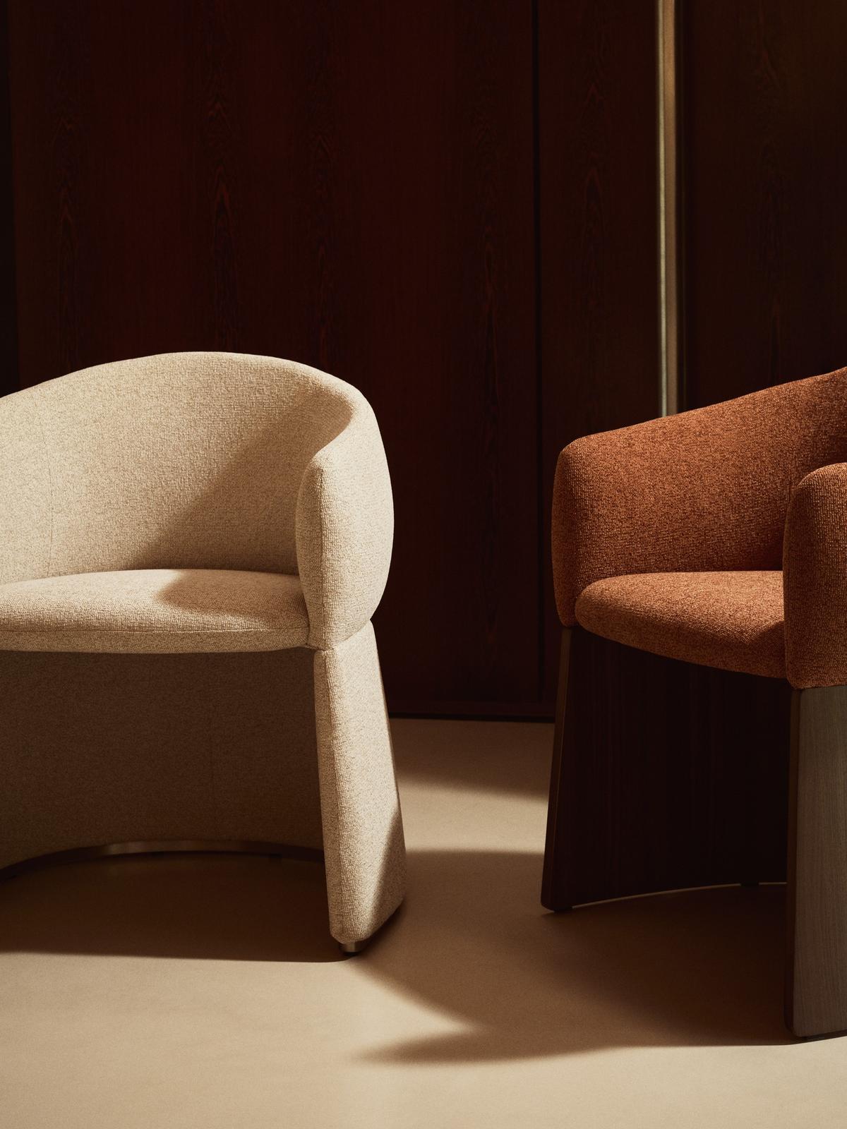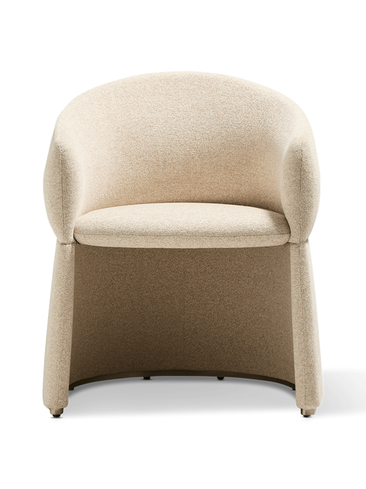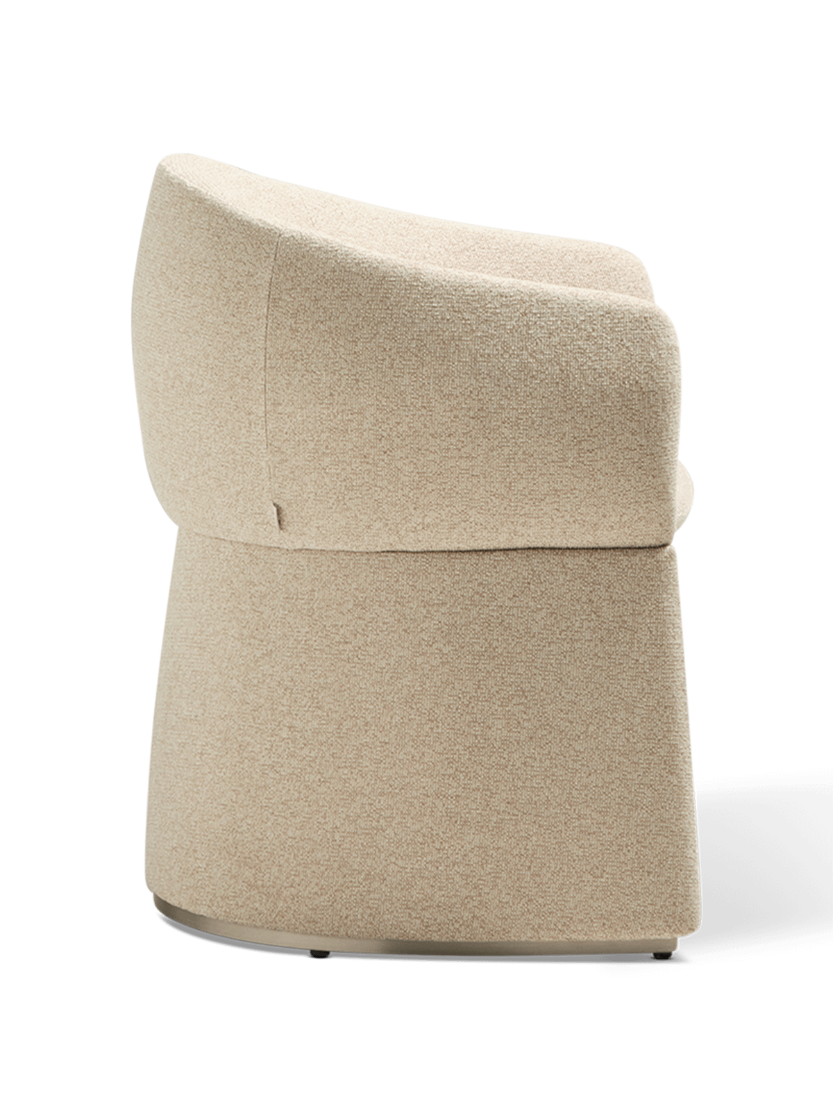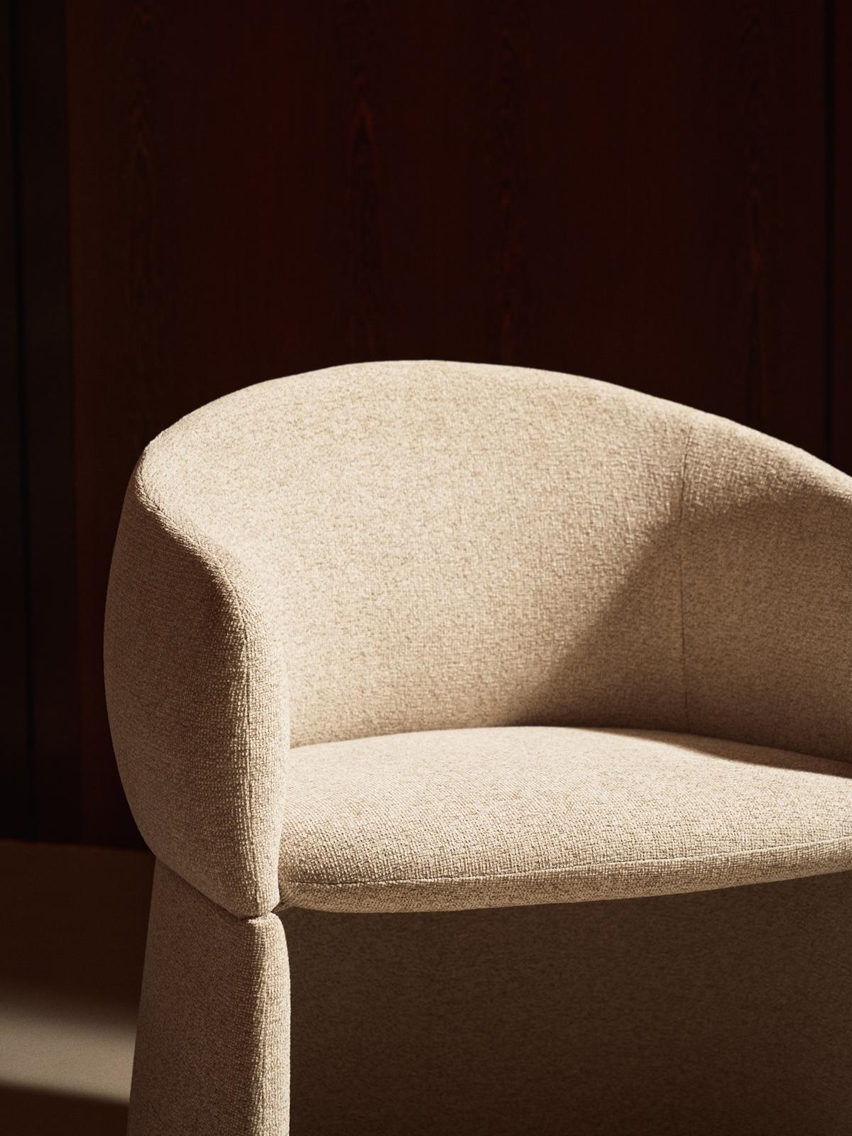 Deze stoel valt op door zijn sculpturale ontwerp, waarbij royale, omhullende vormen in evenwicht worden gehouden door een subtiel, verfijnd silhouet. De brede, uitnodigende zitting rust op een gestoffeerde multiplex basistablet met een metalen frame aan de randen om de stof te beschermen. De bekleding is gemaakt van chenille met een fijne structuur: voelt zacht aan, is bestand tegen dagelijks gebruik en gemaakt van 100% gerecycled polyester van een Global Recycled Standard-gecertificeerde leverancier. De stof heeft een waterafstotende behandeling ondergaan en is OEKO-TEX® STANDARD 100-gecertificeerd wat een ecologisch veilige en milieuverantwoorde productie garandeert. De zitting is van gemiddelde hardheid dankzij de combinatie van banden en veren met injectieschuim met een dichtheid van 55 kg/m³, waardoor zijn stevigheid en vorm na verloop van tijd behouden wordt. De vilten beschermers op de poten voorkomen markeringen en krassen op de vloer en een metalen frame op de randen beschermt de stof. Een meubelstuk dat ontworpen is om lang mee te gaan, en functioneel is in zowel huishoudelijke als commerciële ruimtes.