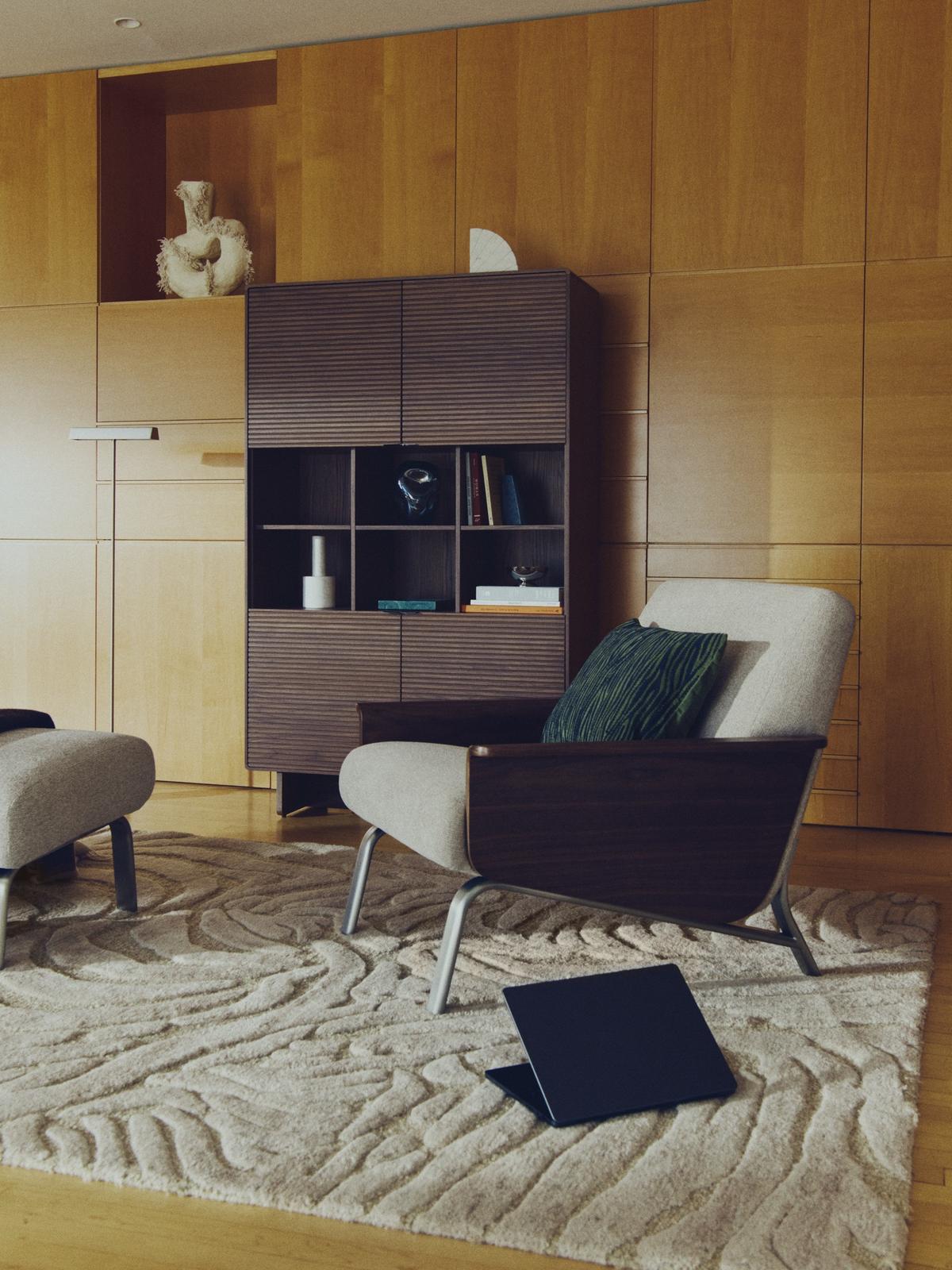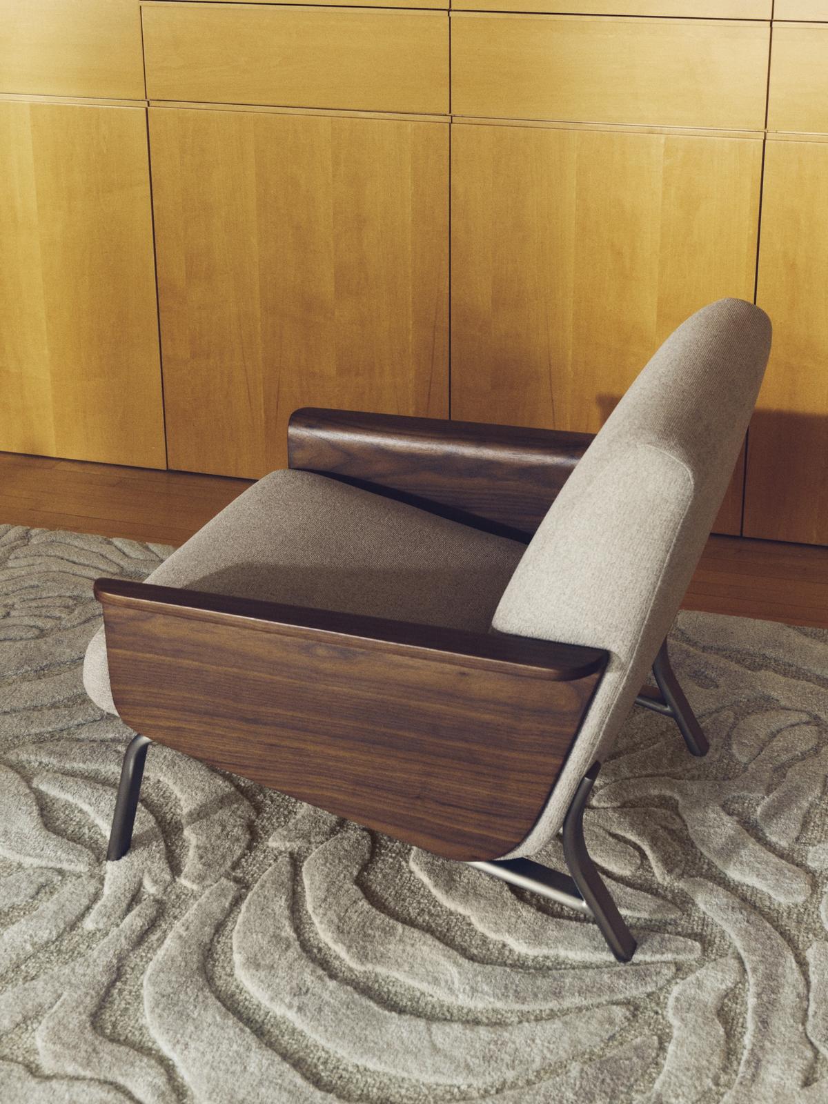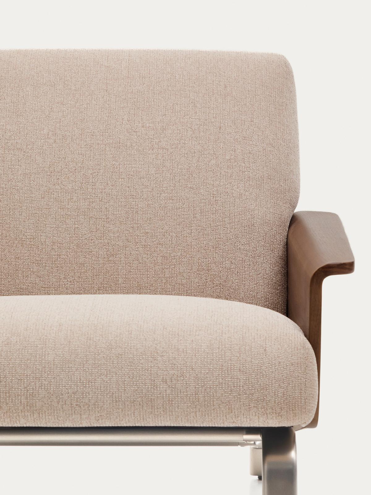 Deze collectie met een elegant en tijdloos ontwerp speelt de hoofdrol in elke ruimte. De chenille bekleding met fijne structuur zorgt niet alleen voor een warme en elegante textuur, maar is ook gemaakt van 100% gerecycled polyester met een waterafstotende behandeling. Dit materiaal is afkomstig van een Global Recycled Standard-gecertificeerde leverancier, wat minder gebruik van grondstoffen en nieuw materiaal garandeert. Bovendien is de stof OEKO-TEX® STANDARD 100-gecertificeerd wat een ecologisch veilige en milieuverantwoorde productie garandeert. De structuur van deze fauteuil combineert de weerstand van multiplex van 18 mm dik, bedekt met eikenfineer, met de visuele aantrekkingskracht van de strak gelijnde armleuningen. De poten zijn gemaakt geborsteld roestvrij stalen buizen met een diameter van 1,8 mm en geven het ontwerp een eigentijds en stabiel uiterlijk. De gemiddelde hardheid van de zitting is ideaal voor dagelijks gebruik, dankzij een zorgvuldige combinatie van banden, veren en schuimlagen met hoge dichtheid (35 kg/m³ en 40 kg/m³), die stevigheid, duurzaamheid en uitstekend comfort bieden.