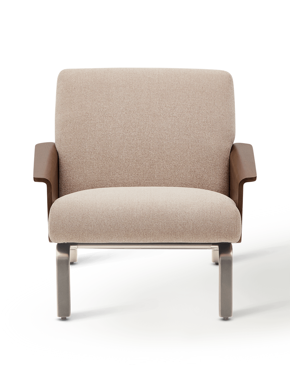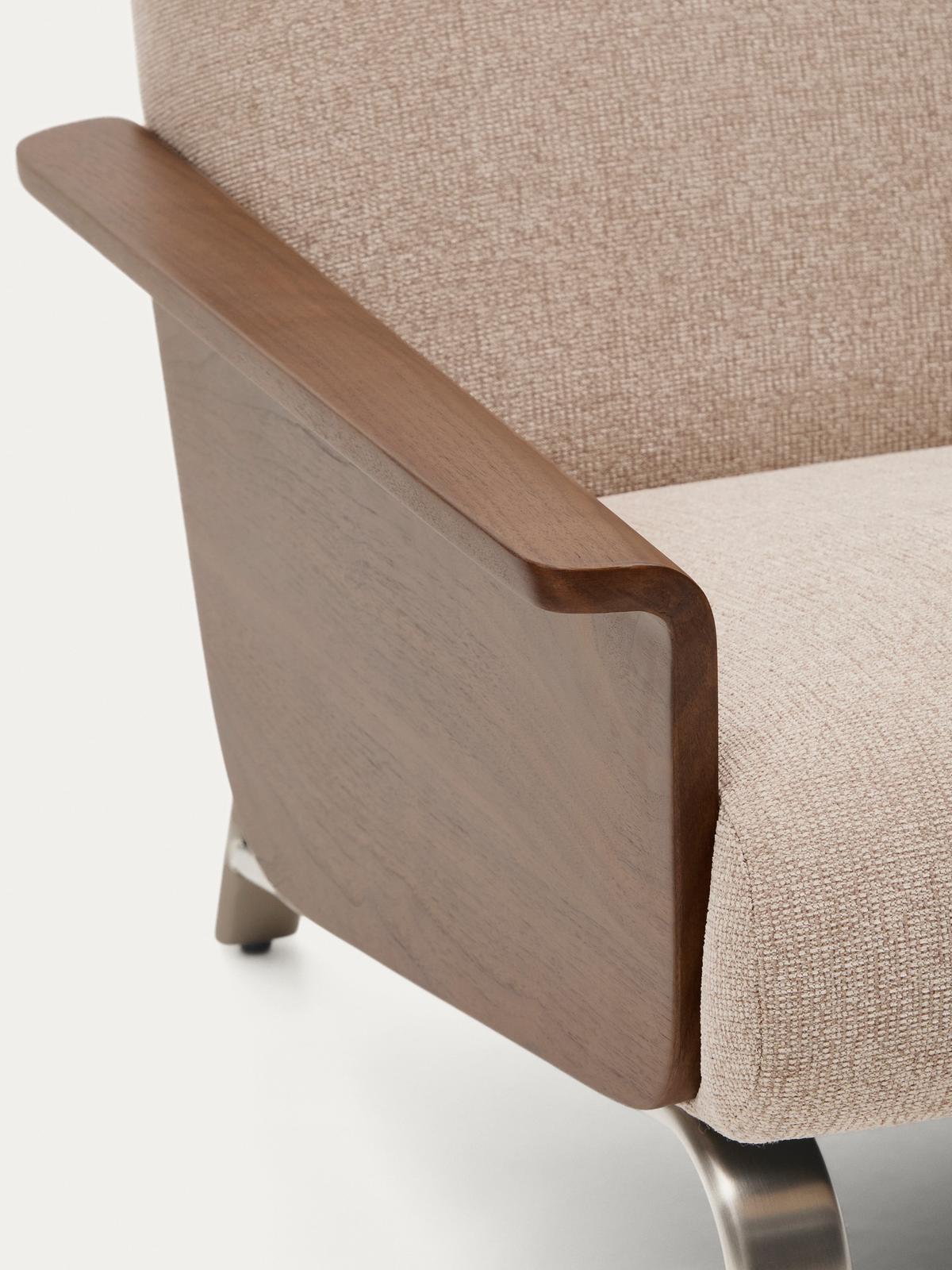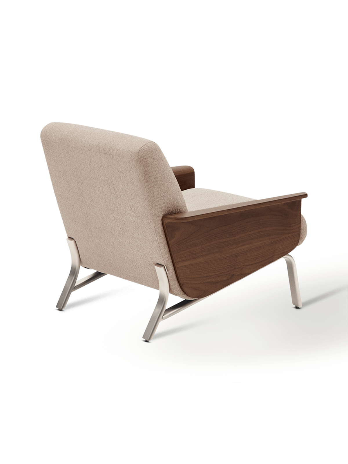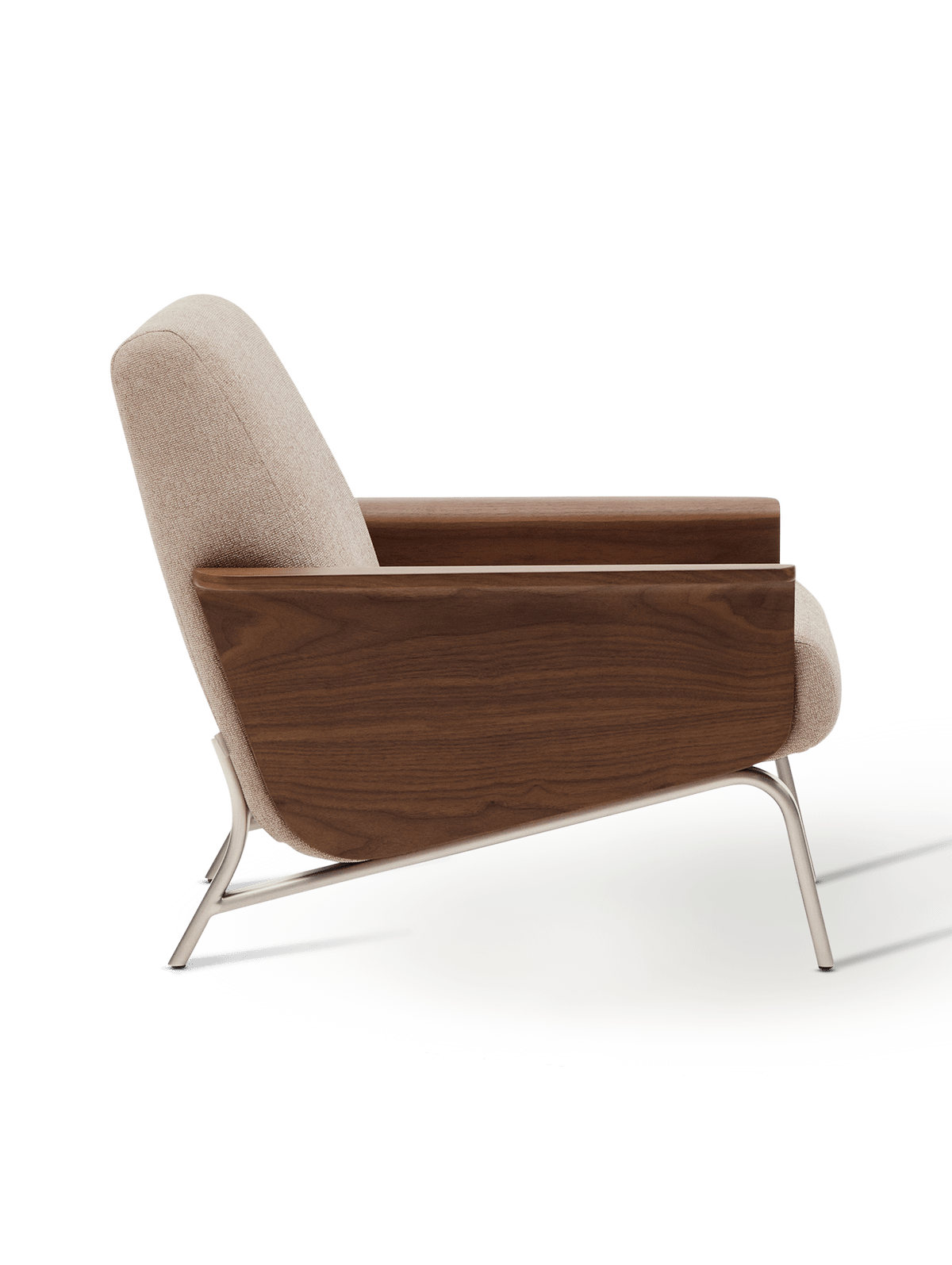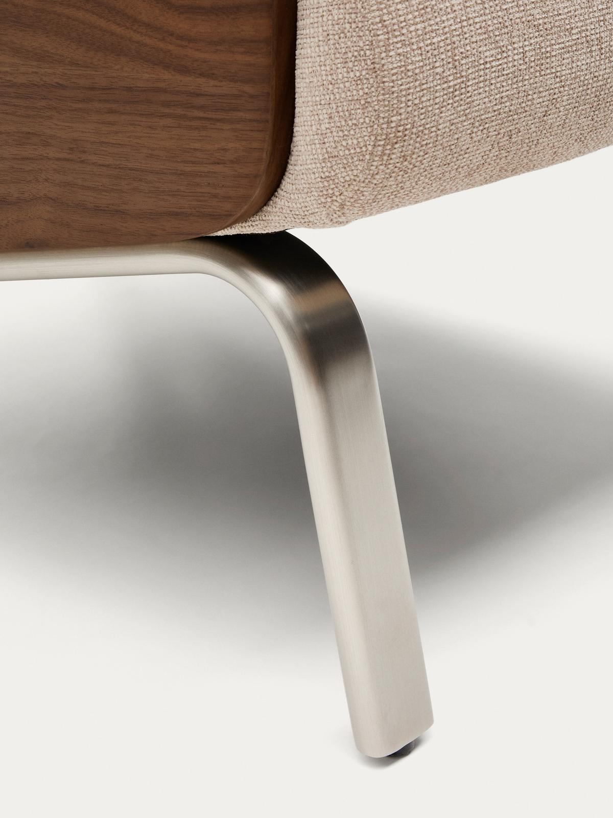 Amsen fauteuil in lichtbruin met walnoten multiplex en poten van geborsteld roestvrij staal