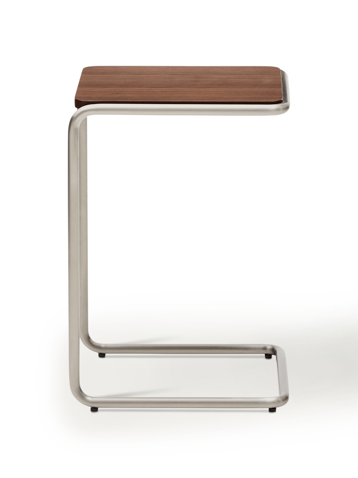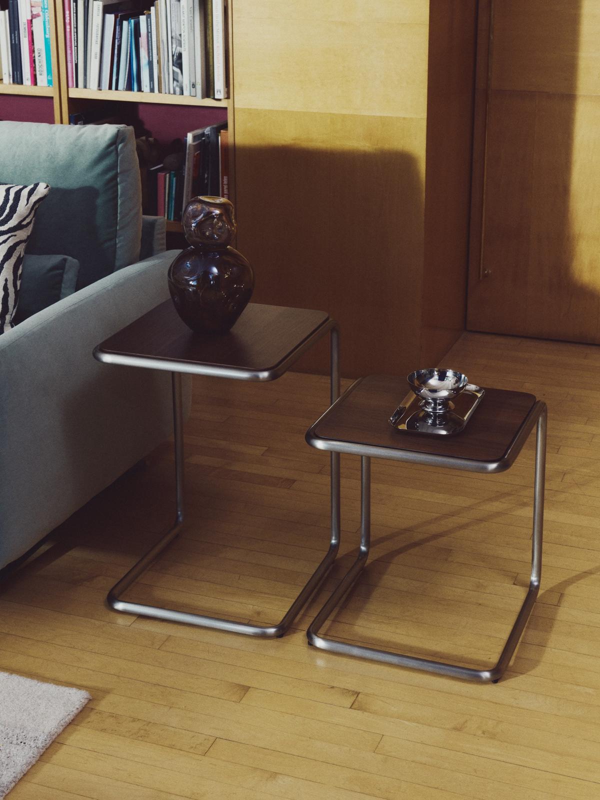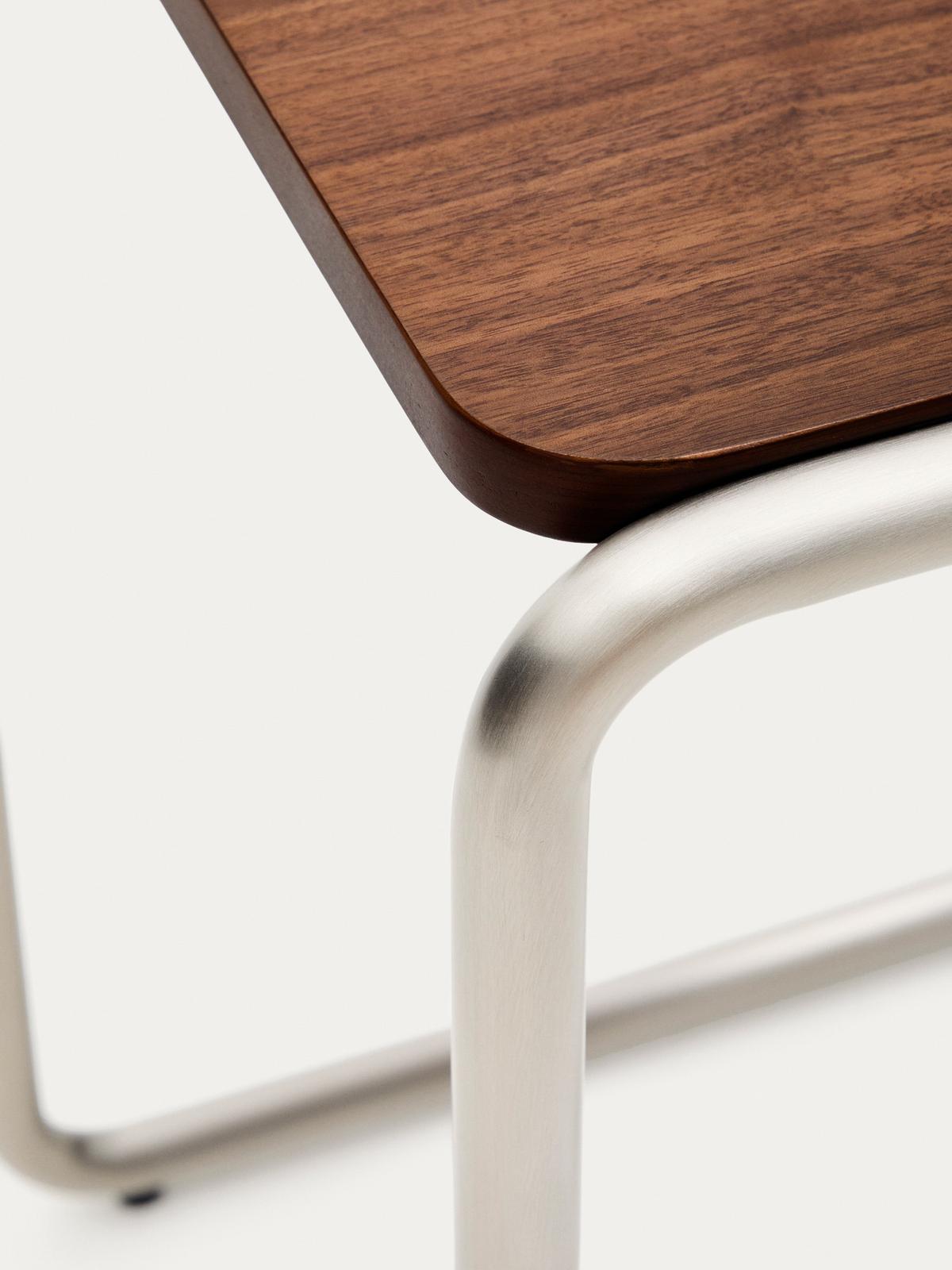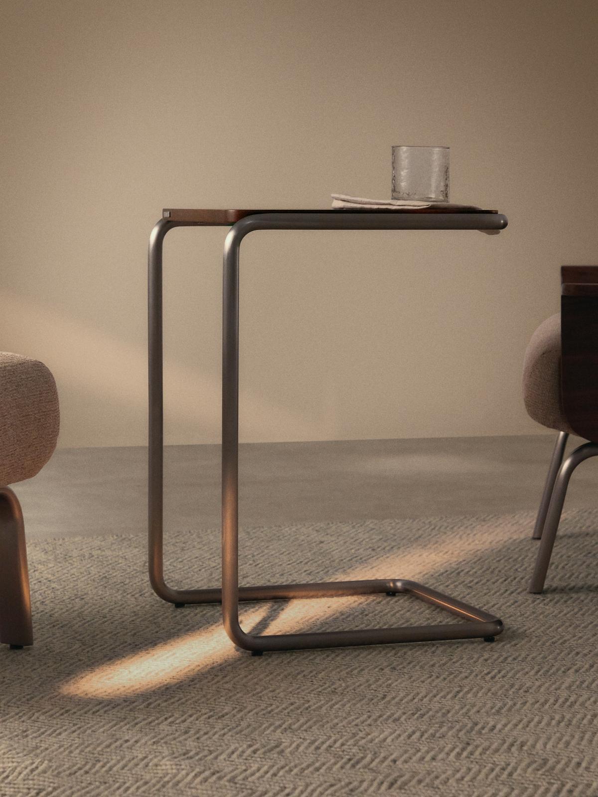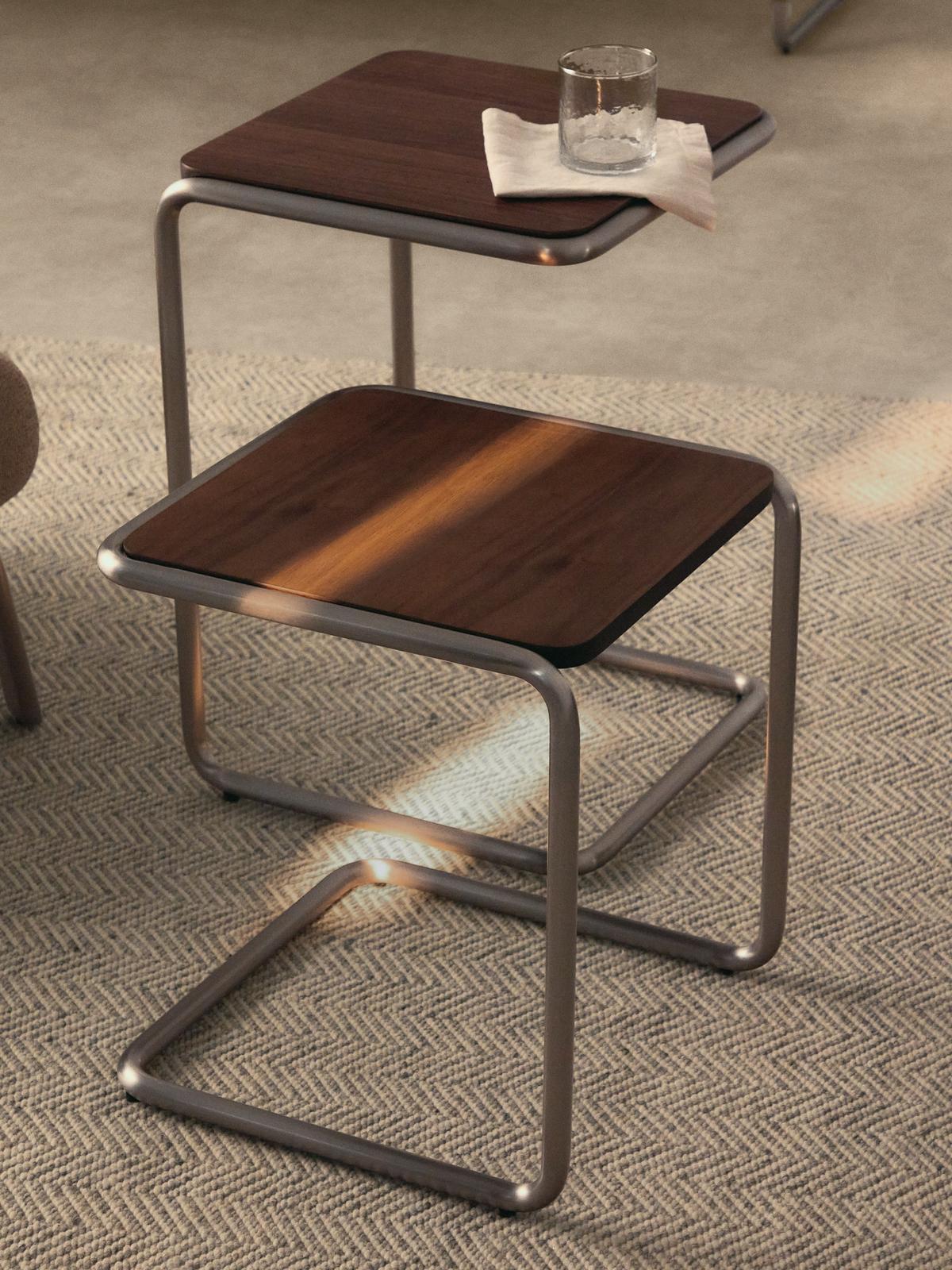Tarsel herinterpreteert elegantie uit de mid-century met een eigentijdse benadering die functionaliteit en visueel raffinement perfect in balans brengt. Zijn bovenblad van 0,6 mm walnootfineer met een donkere afwerking contrasteert met de buisvormige structuur van geborsteld roestvrij staal, waardoor het eruit springt als een moderne en verfijnde knipoog. Hij kan worden gecombineerd met de bijzettafel uit de collectie zodat een set nesttafels wordt gevormd en de gebruiksmogelijkheden worden uitgebreid. Hij past bij verschillende levensstijlen en woonconfiguraties. Hij is ontworpen voor dagelijks gebruik en bevat afstelknoppen op het onderstel om mogelijke oneffenheden van de vloer te compenseren, zodat stabiliteit en comfort in elke omgeving gegarandeerd zijn.