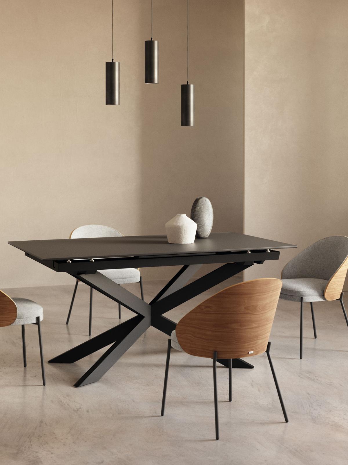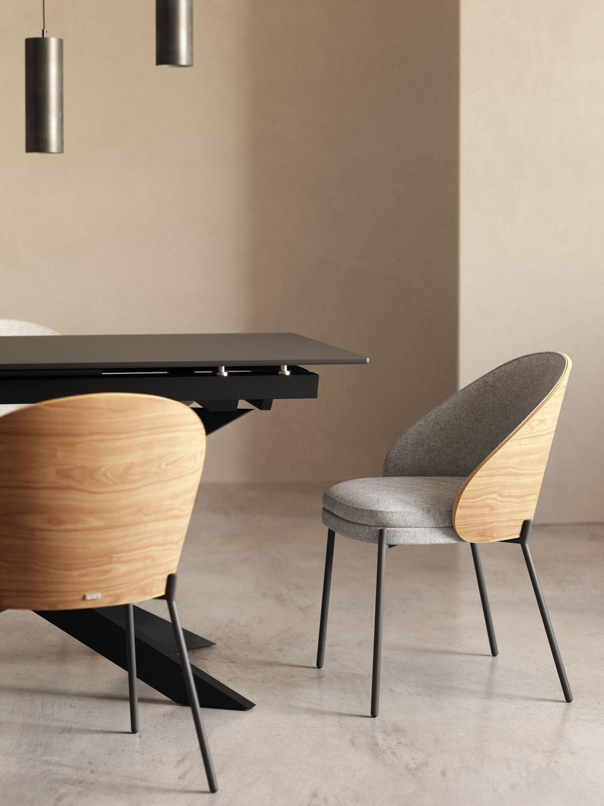 Drie materialen in één collectie? Challenge accepted, met een onovertroffen resultaat. Eamy combineert essenhoutfineer, stoffering en metaal in het perfecte ontwerp. Zo voeg je stijl toe tijdens het natafelen.