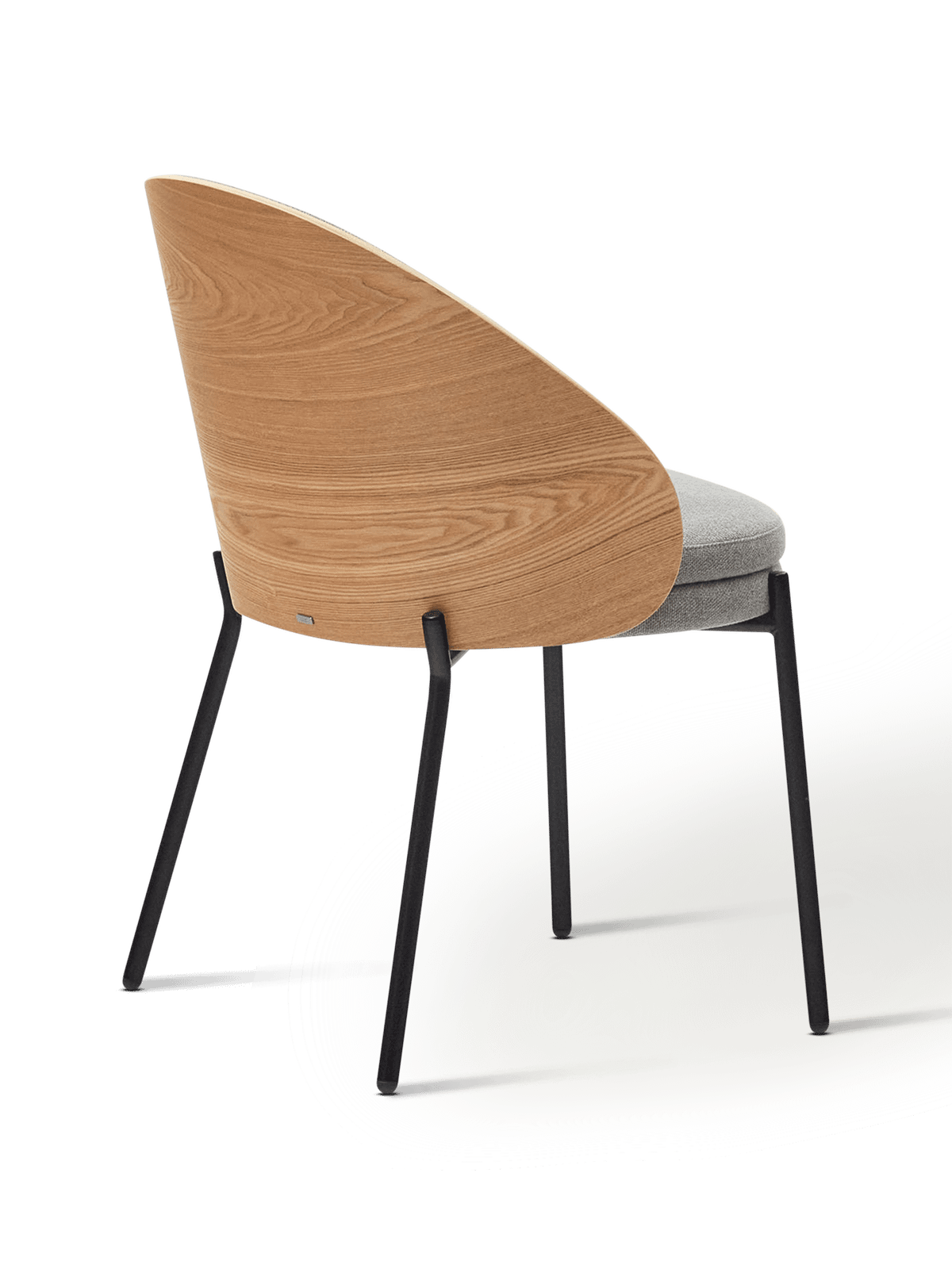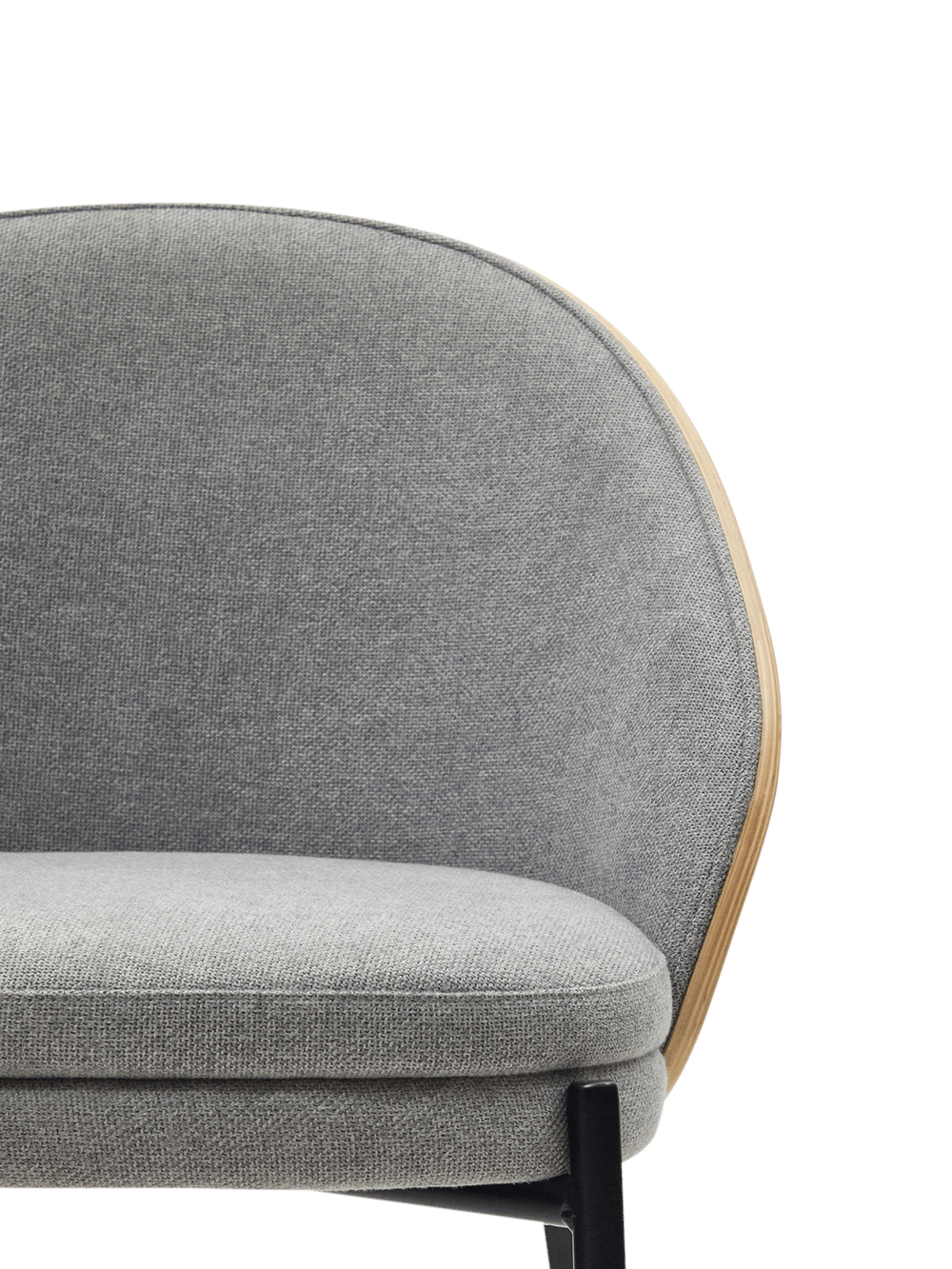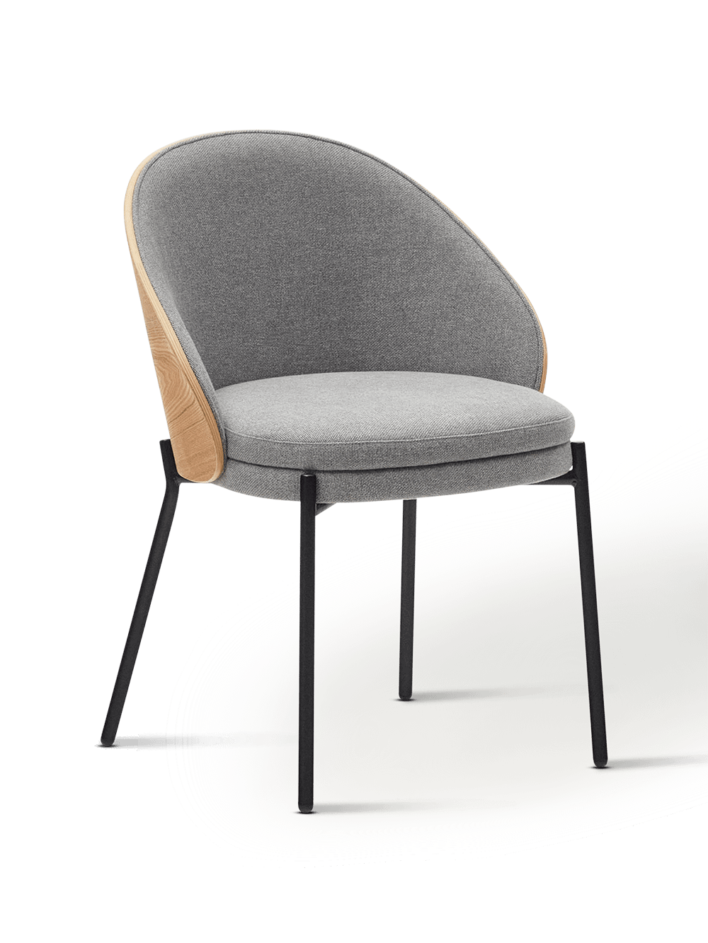 Eamy stoel in lichtgrijs chenille en in essenhoutfineer met natuurlijke afwerking en zwart metaal