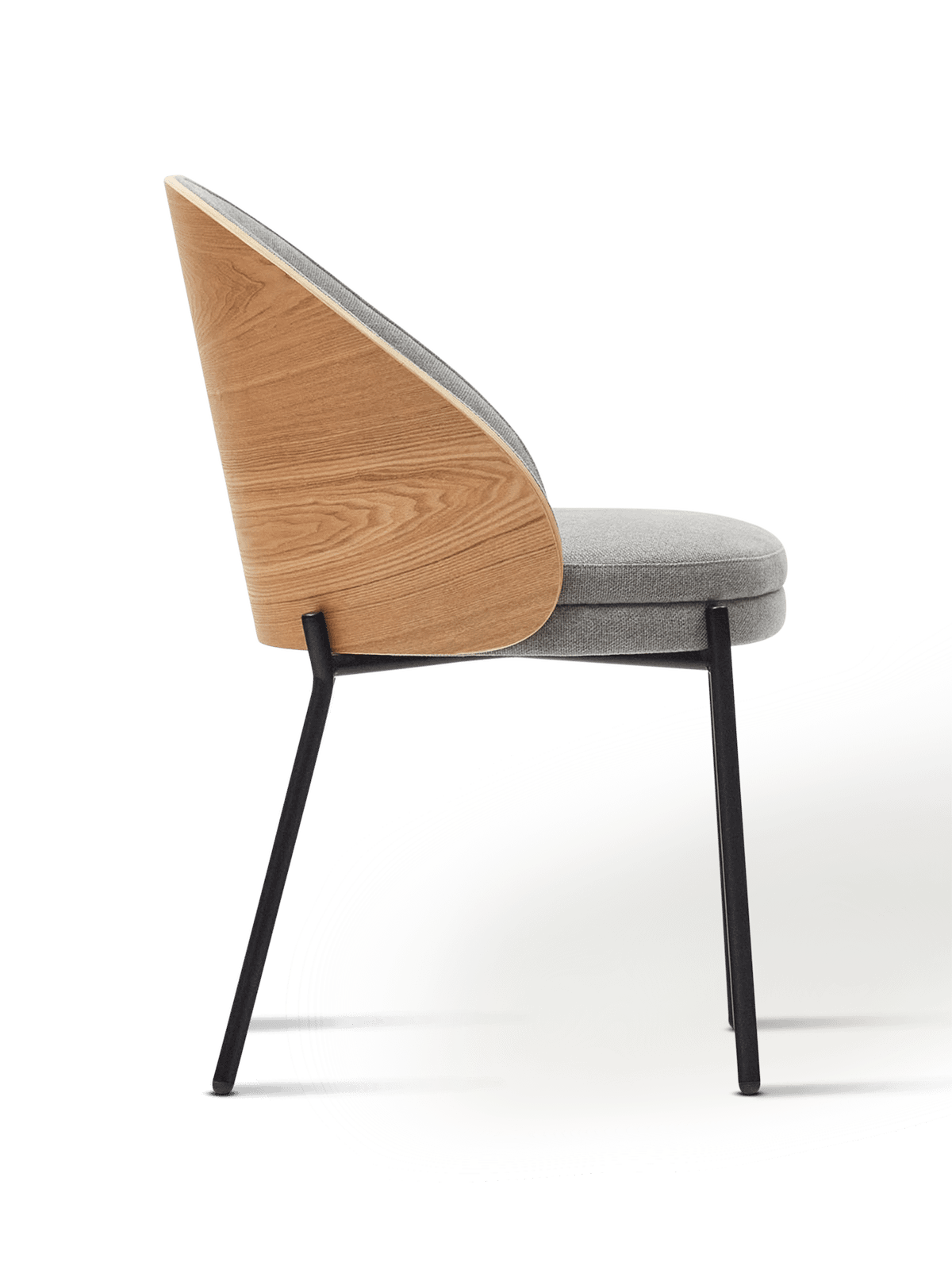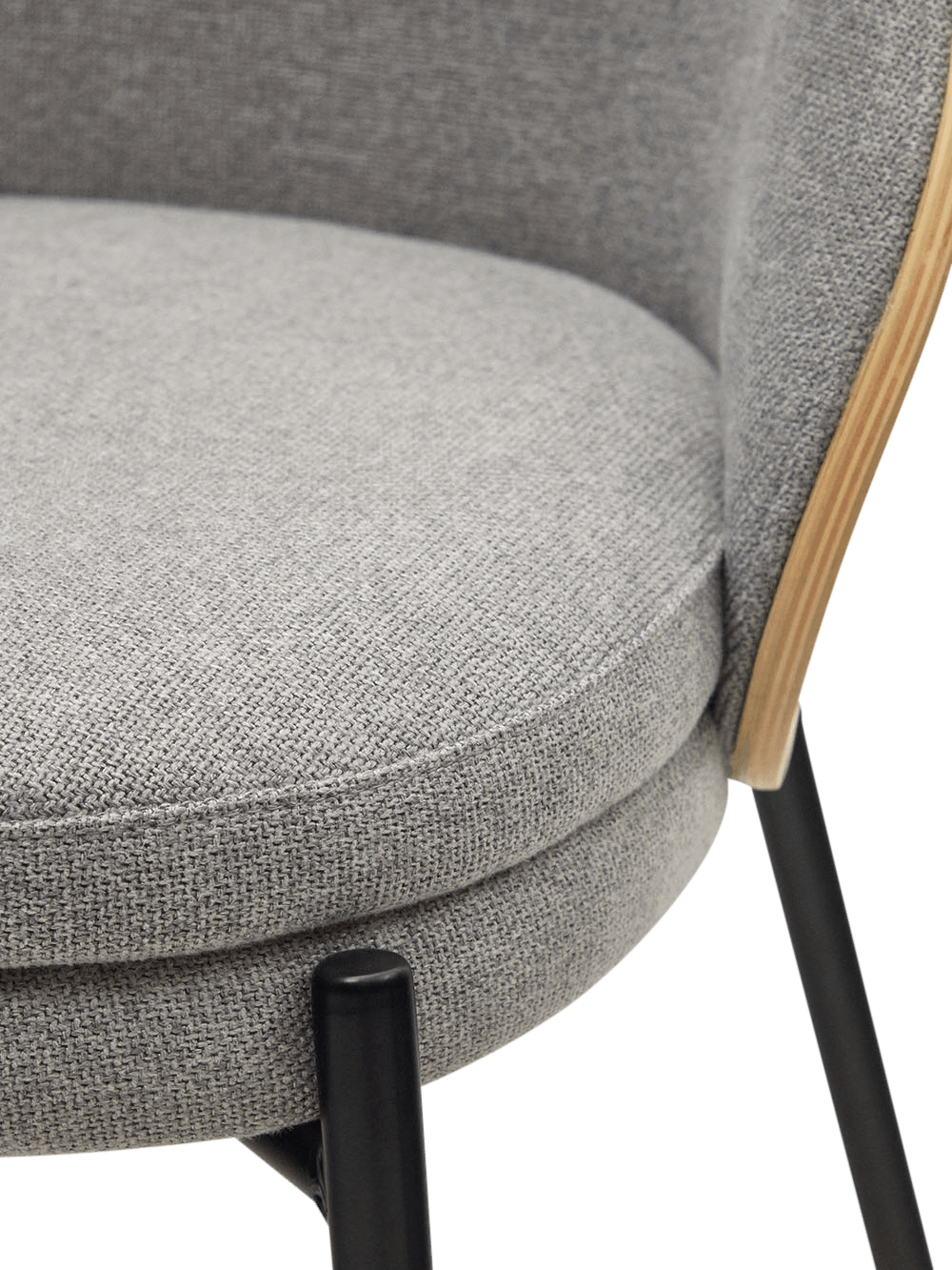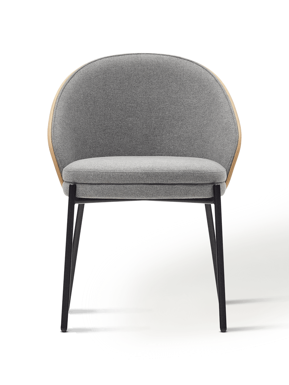 Eamy stoel in lichtgrijs chenille en in essenhoutfineer met natuurlijke afwerking en zwart metaal
