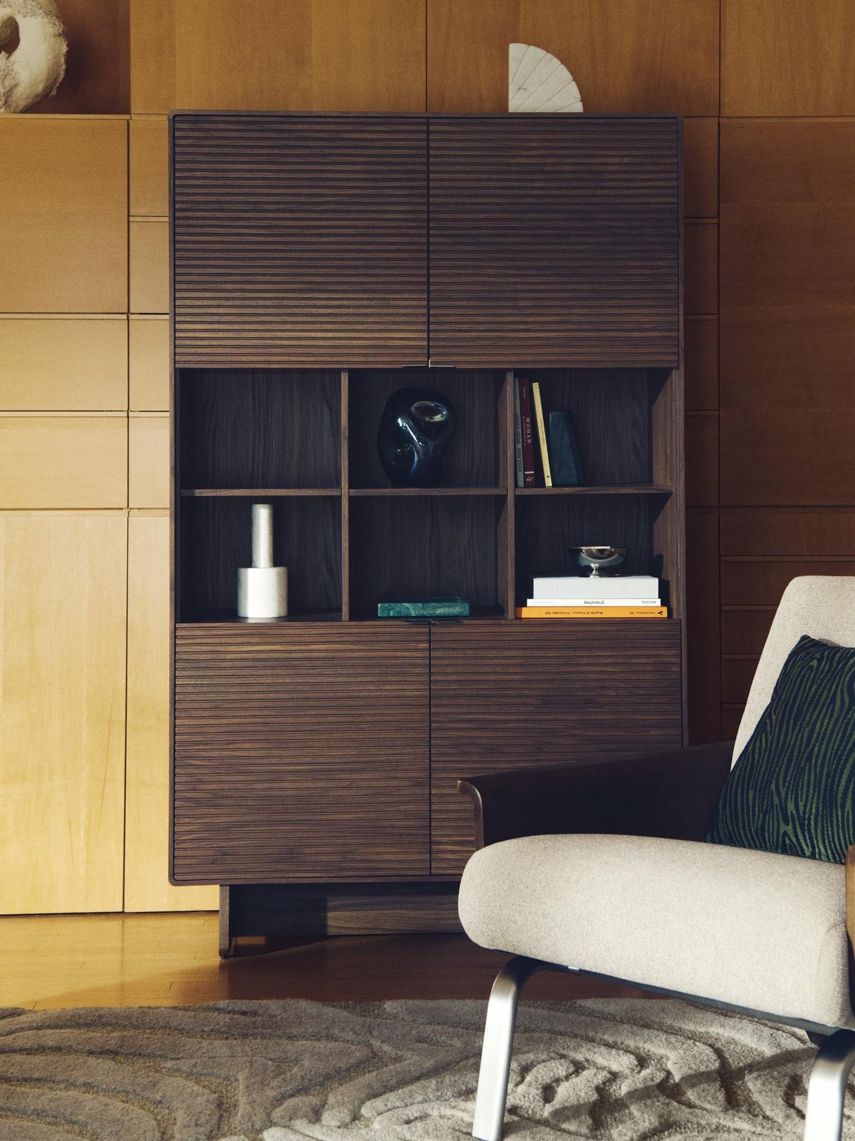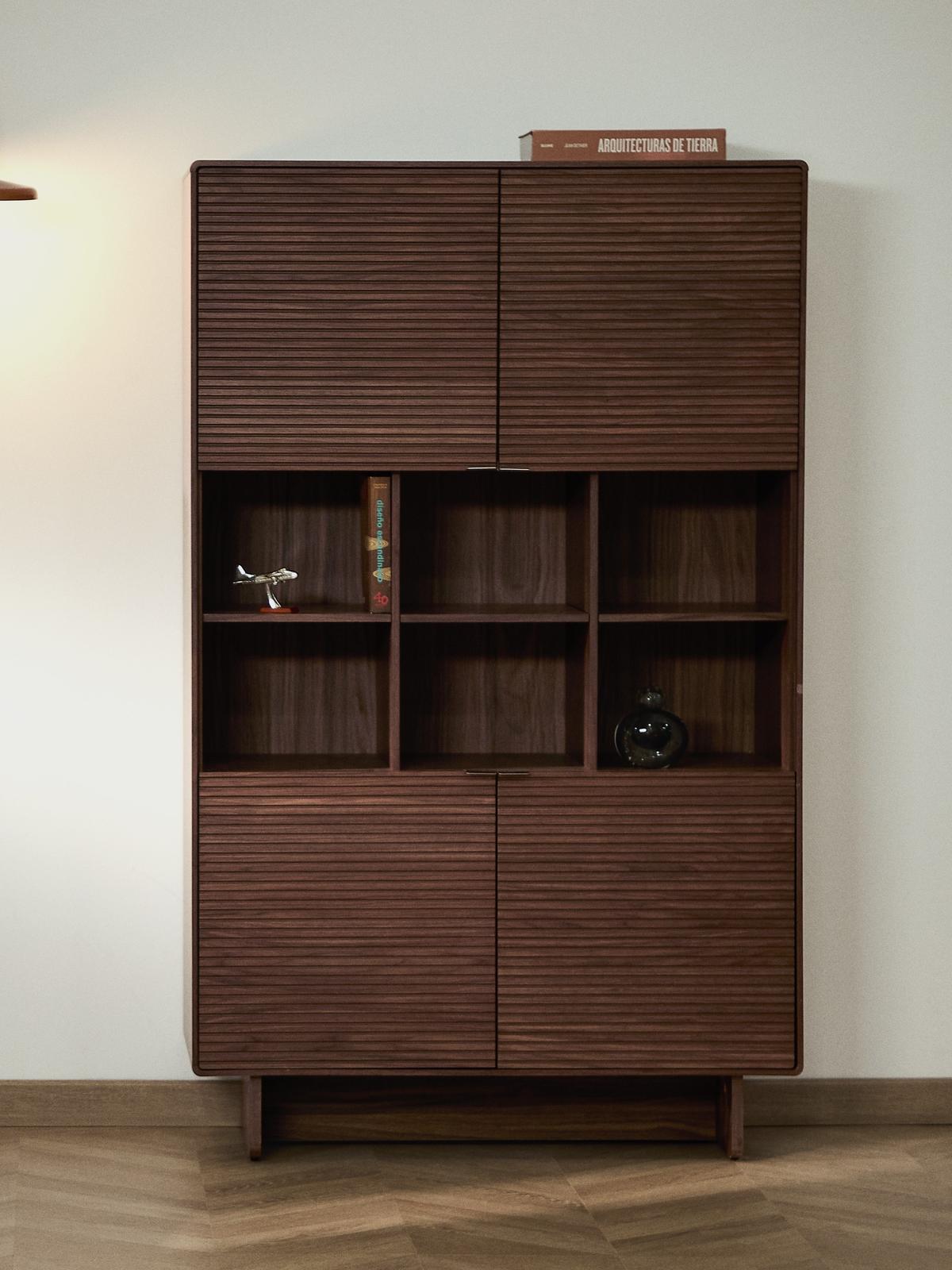 Het Norlen dressoir van Kave Home brengt de charme van de jaren 50 tot leven in een eigentijds ontwerp. De combinatie van zachte, afgeronde hoeken en strakke lijnen zorgt voor een harmonieuze balans tussen vintage en modern. Het donkere walnootfineer geeft het meubel een warme, karaktervolle uitstraling, terwijl de verfijnde afwerking perfect aansluit bij hedendaagse interieurs.