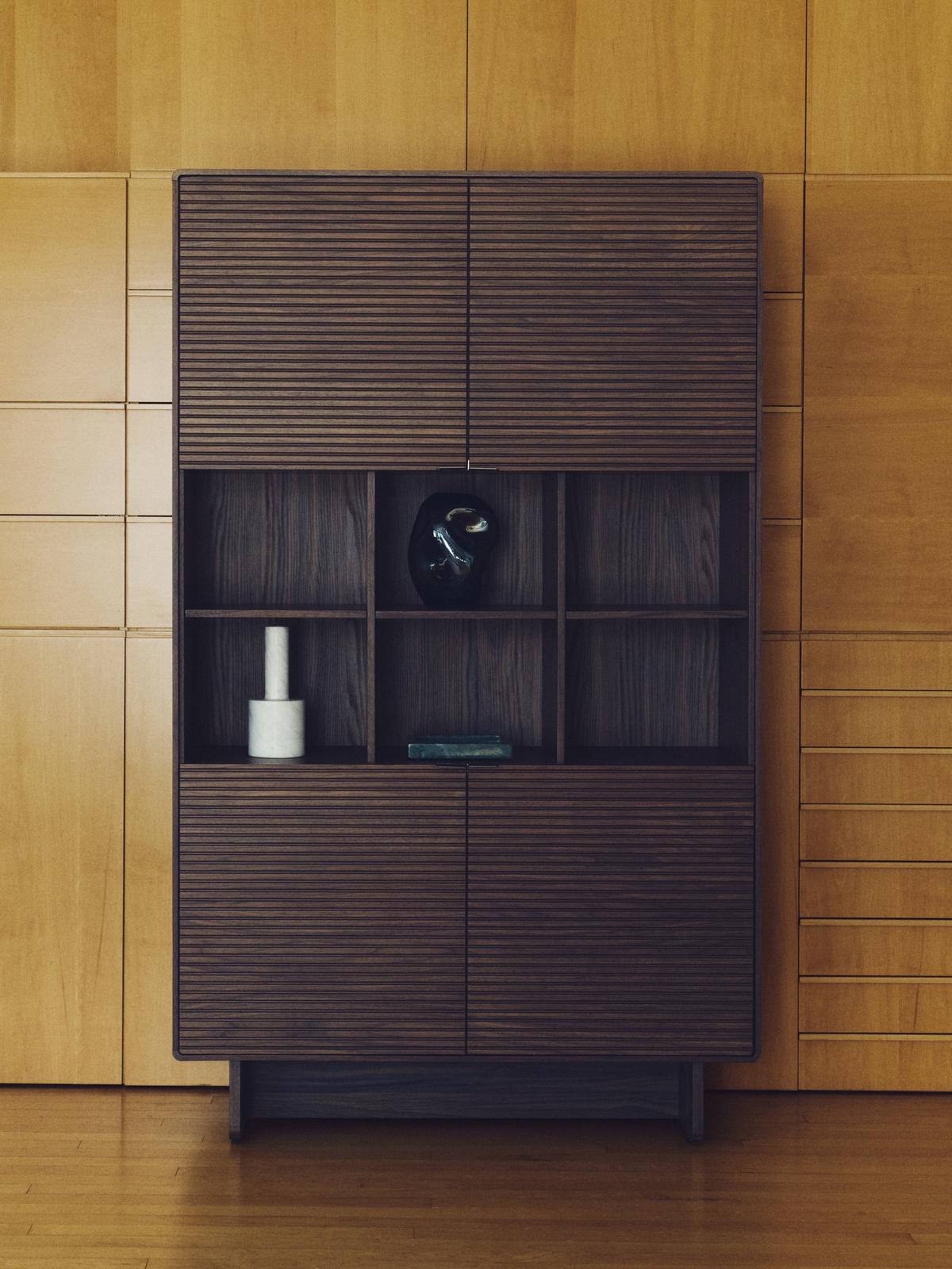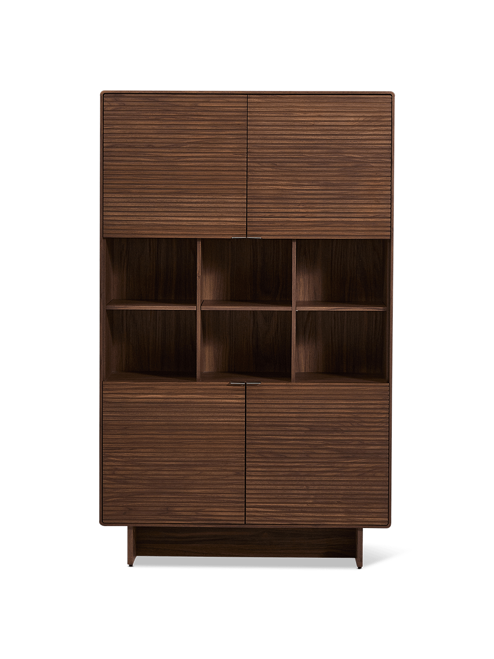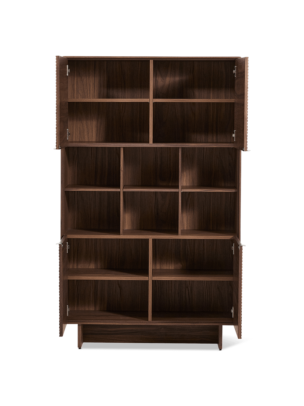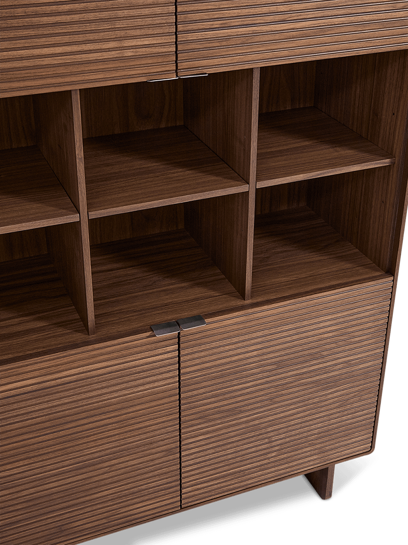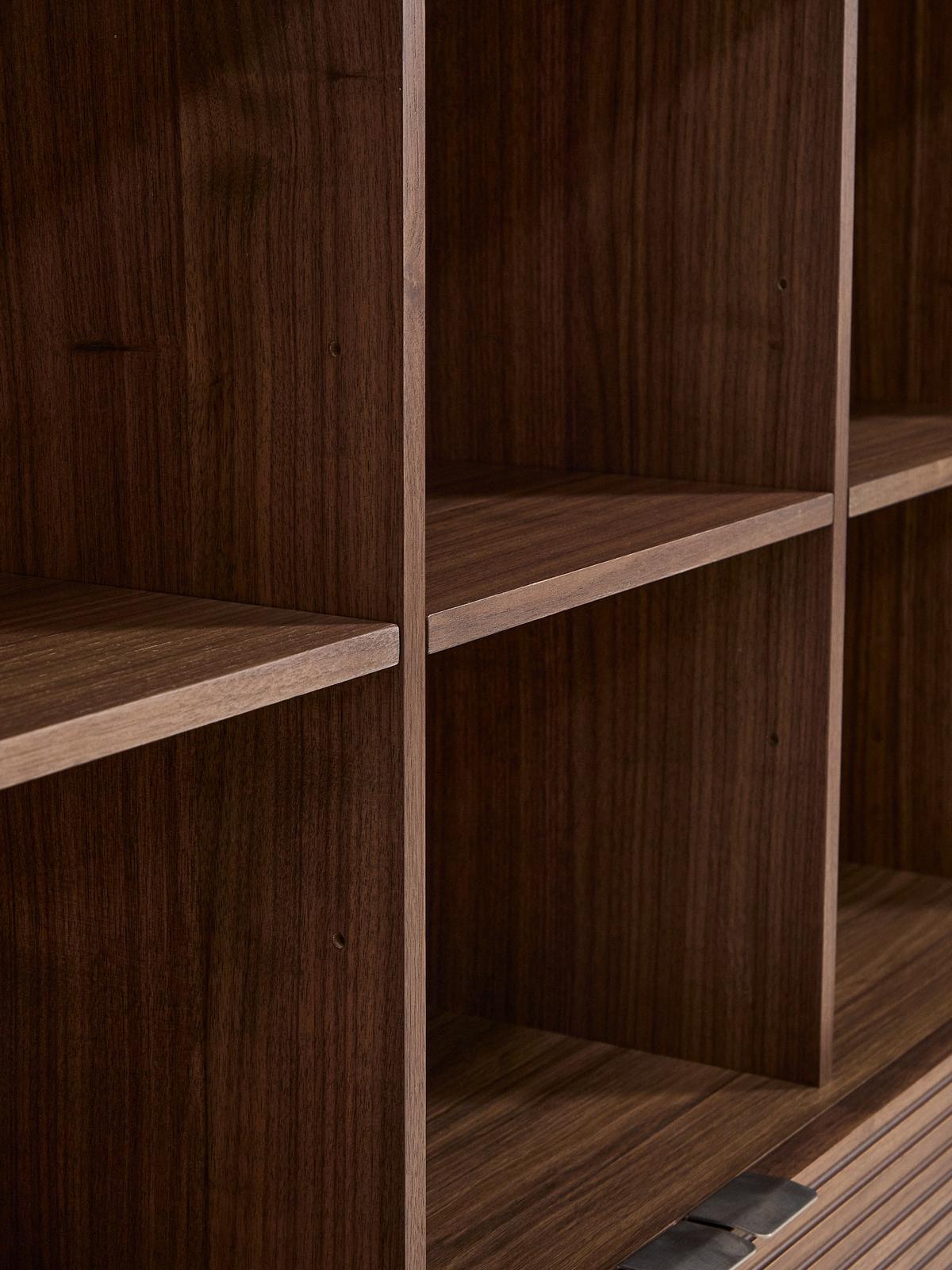 - Materiaal: MDF met walnootfineer en melamine binnenafwerking en roestvrijstalen handgrepen
