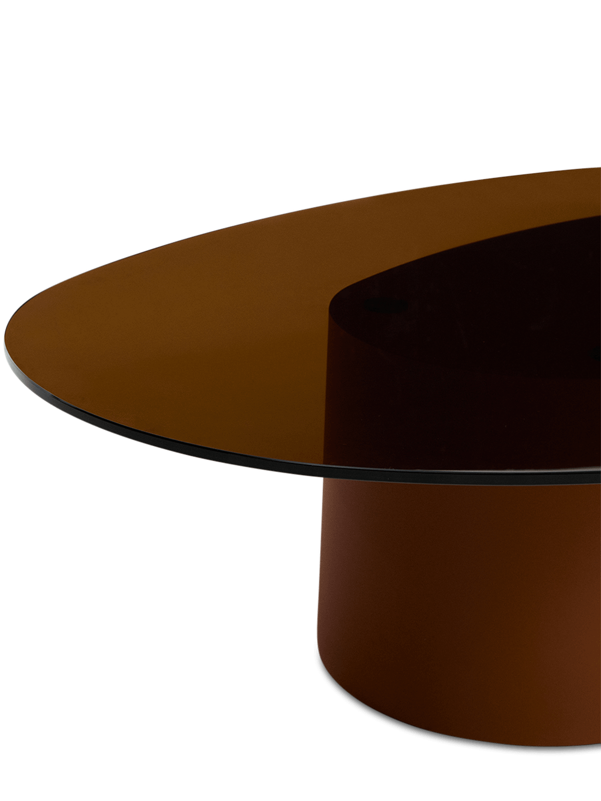 De Olir salontafel van Kave Home combineert een organisch gevormd blad met een krachtig, cilindervormig onderstel. Het getinte glazen blad zorgt ervoor dat het geheel visueel licht blijft, ondanks de stevige basis.