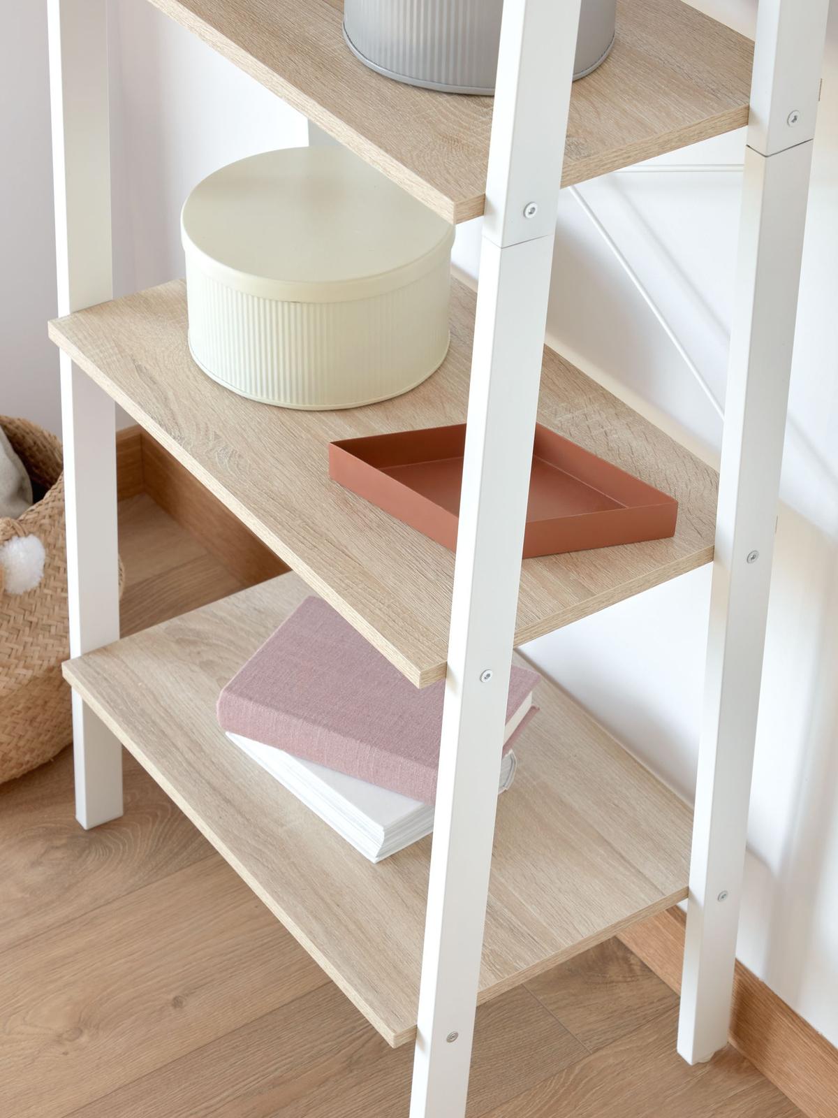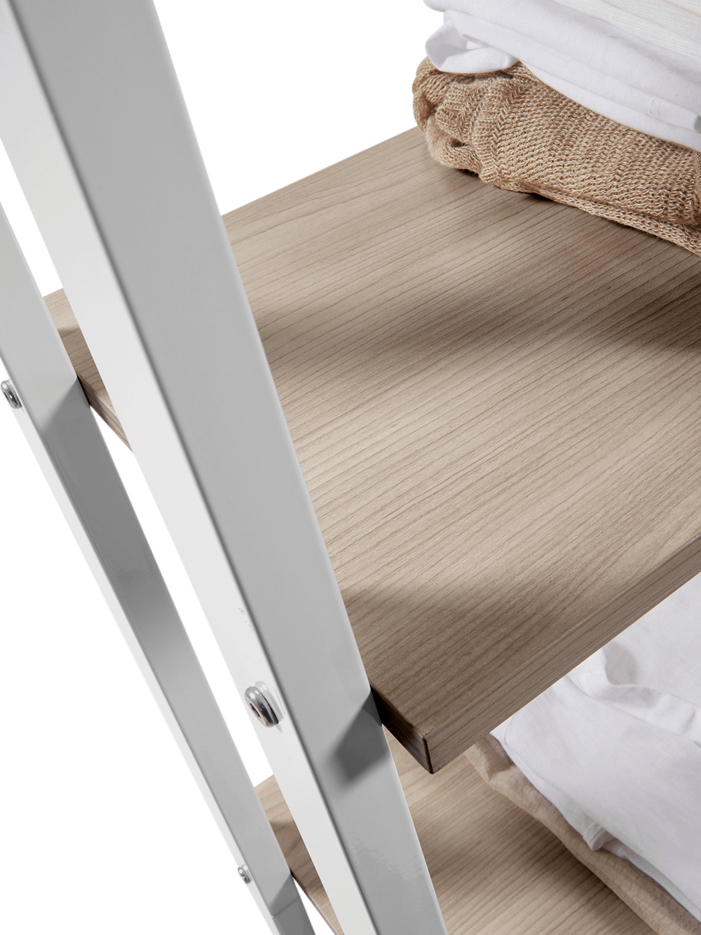 De rek Aarhus is een stalen structuur met vijf planken met een natuurlijk houteffect. Ideaal voor een total match in je studio, naast het bureau Aarhus. It's up to you.