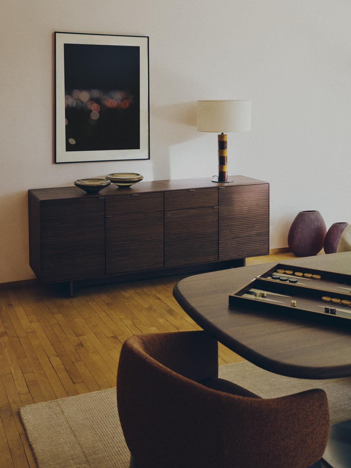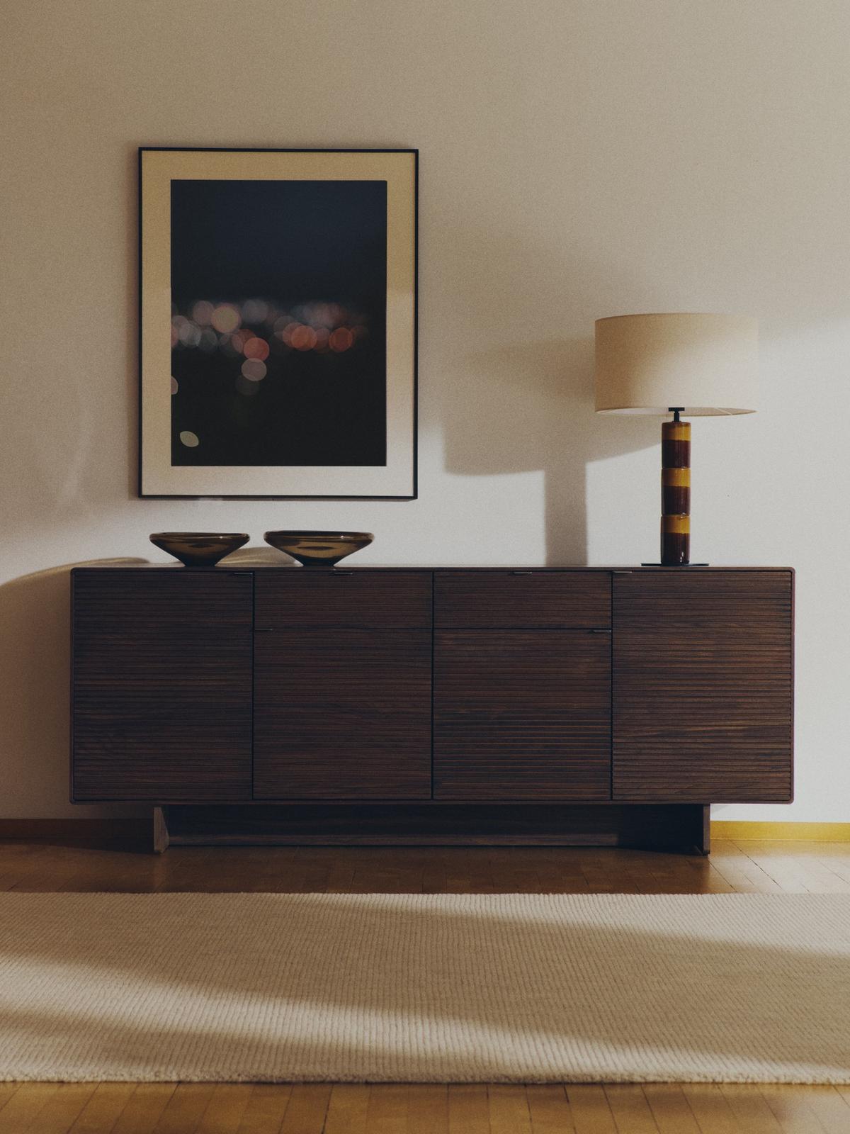 Deze collectie valt op door de basis van geëmailleerd keramiek, bewerkt in afwisselende stroken van warme tinten, die dynamiek en persoonlijkheid brengen in elke kamer. De katoenen kap filtert het licht en creëert een zachte en omhullende sfeer, perfect voor woonkamers, slaapkamers of leeshoeken. Het slanke, verticale ontwerp versterkt de aanwezigheid van de lamp, terwijl de geëmailleerde afwerking op de basis voor visuele aantrekkingskracht zorgt. De bedrading is bedekt met zeer zachte stof en voegt een vleugje verfijning en een aangename tactiele ervaring toe. Compatibel met E27-lampen van max. 40 W. Deze zijn apart verkrijgbaar.