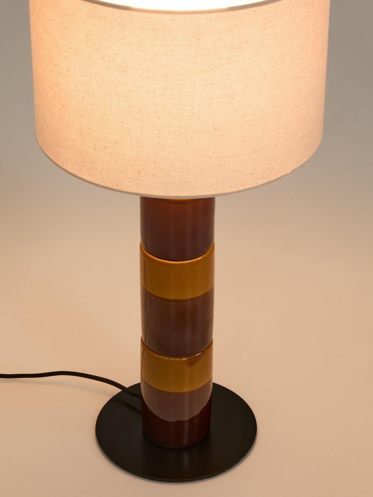 Mavran tafellamp met keramieken voet in bruin en mosterdgeel en lampenkap van katoen