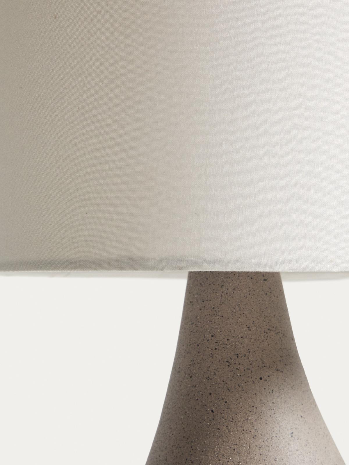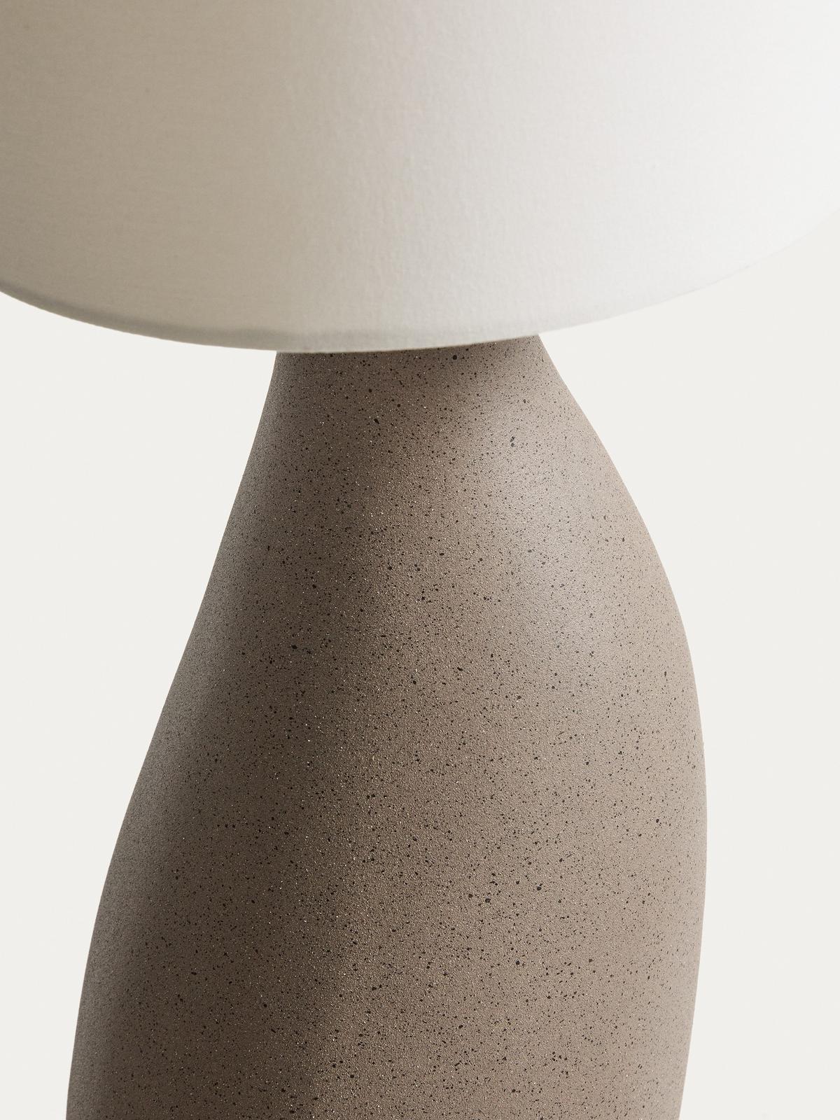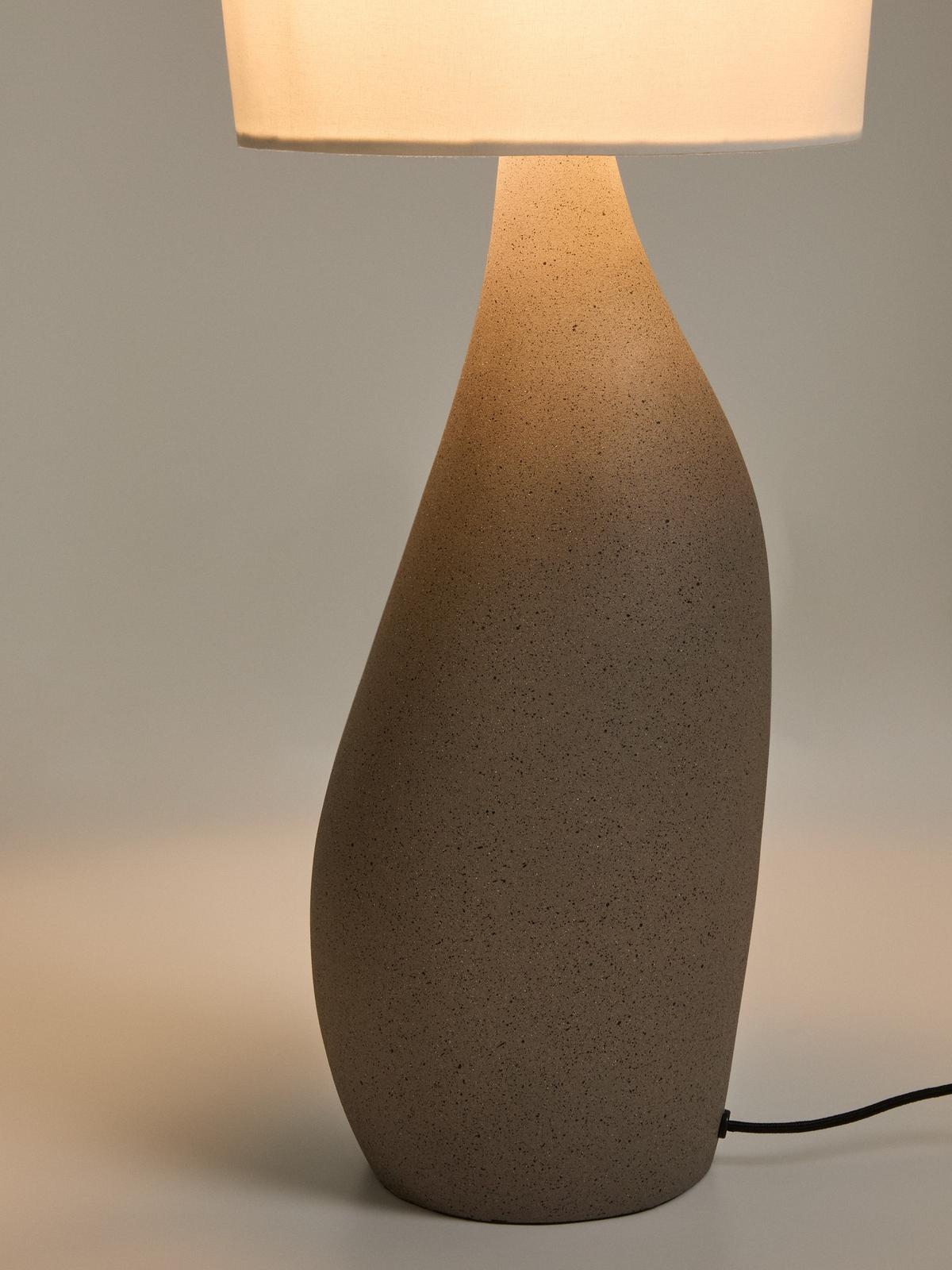 Deze tafellamp combineert een gestructureerde voet met steeneffect met een ivoorkleurige katoenen kap, waardoor een subtiel en elegant contrast ontstaat. De stevige, organisch gevormde basis voegt karakter en persoonlijkheid toe aan het geheel, terwijl de kegelvormige kap het licht verzacht en een warme, uitnodigende sfeer creëert in elke kamer. Dankzij het uitgebalanceerde ontwerp kan hij gemakkelijk worden geplaatst in slaapkamers, woonkamers of werkruimtes en voegt het een opvallende en tijdloos detail toe. De lamp is compatibel met E27-lampen tot 40W, apart verkrijgbaar. Een functioneel en decoratief product, ontworpen om de sfeer van je huis te transformeren met unieke details en zorgvuldig geselecteerde materialen.