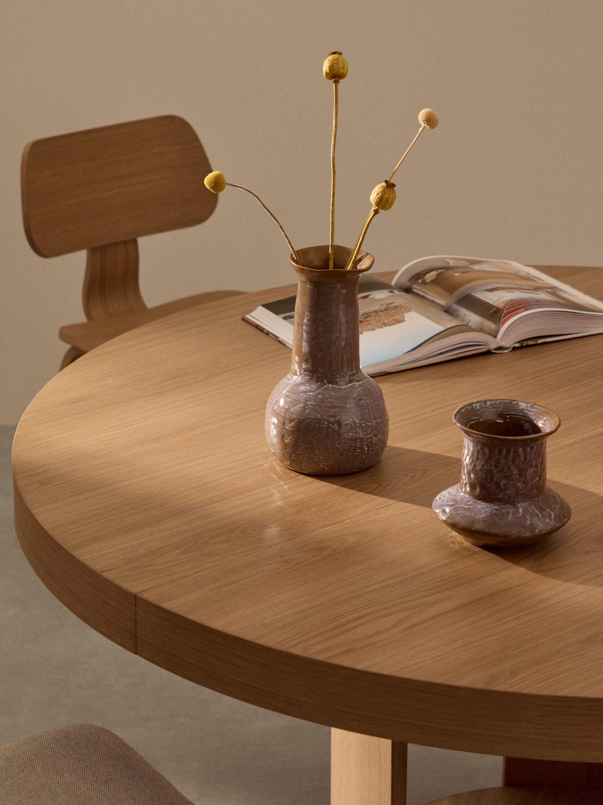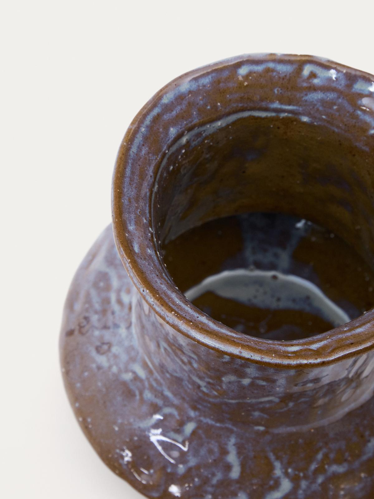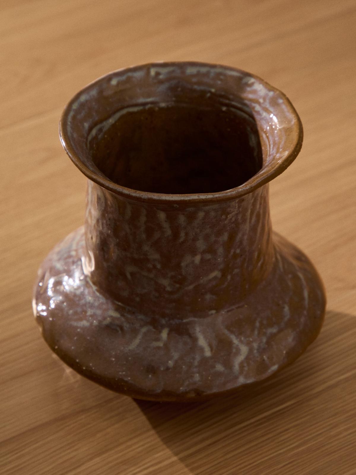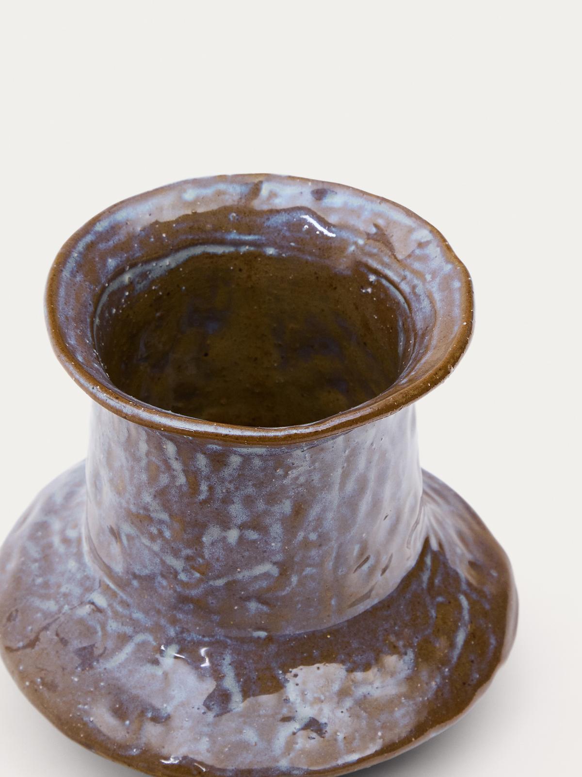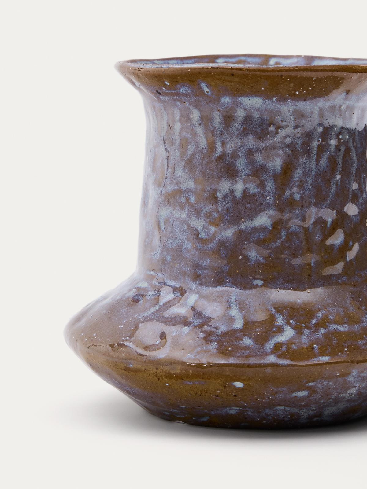 Dit is een vaas van keramiek met een ontwerp dat opvalt door zijn organische en getextureerde vorm. Het silhouet combineert een brede, gebolde basis met een smallere hals die zich opent naar de randen, waardoor een visueel evenwicht ontstaat tussen rustiek en elegant. De afwerking heeft een geglazuurd effect met warme tinten. Deze vaas is perfect om een uniek en authentiek tintje aan elke ruimte te geven en toont schoonheid in imperfectie.