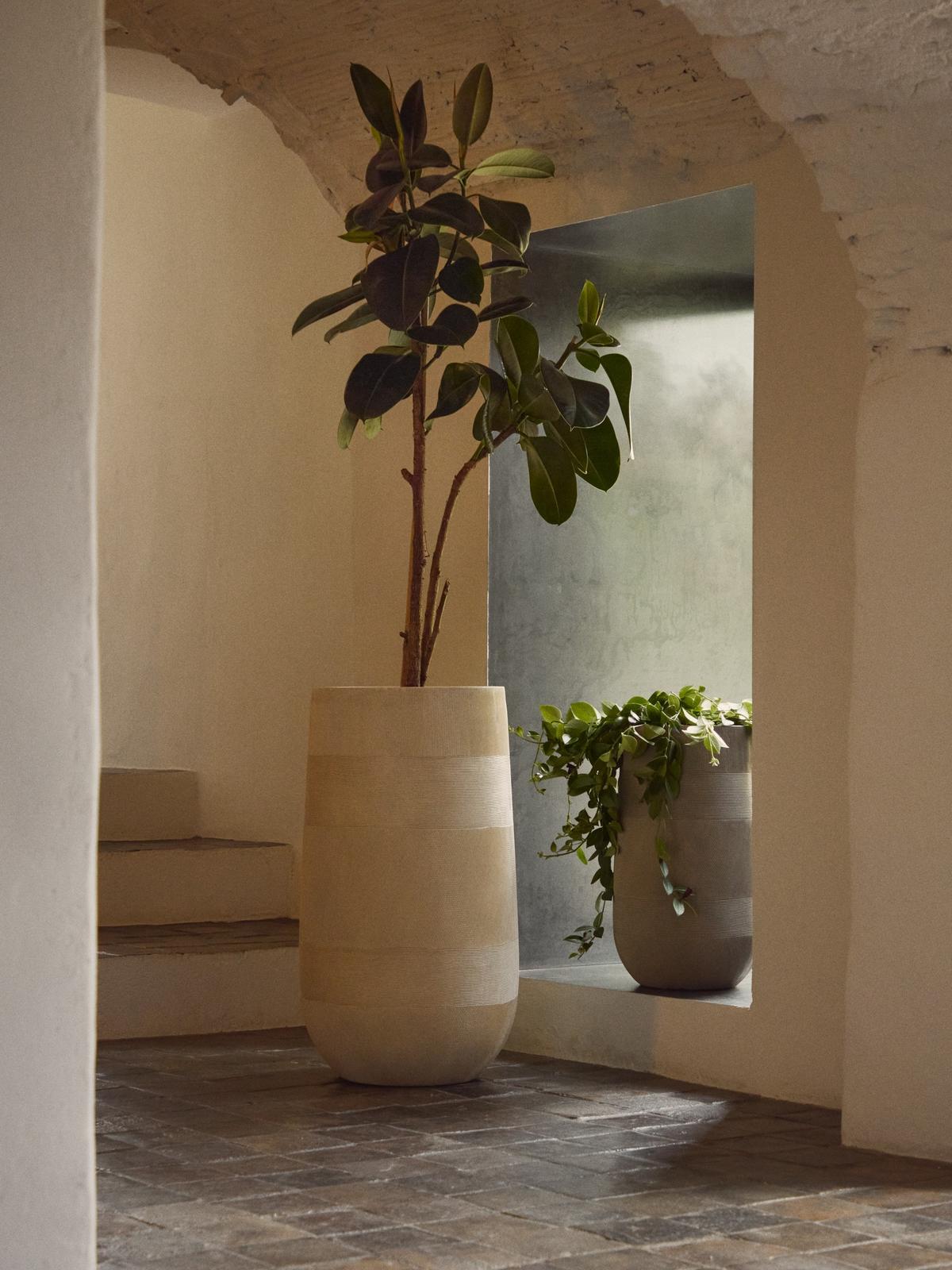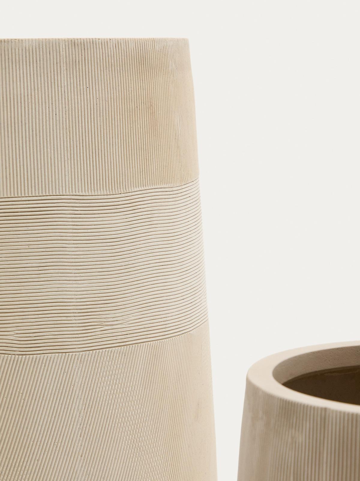 Deze plantenbak valt op door zijn organische ontwerp en ronde vormen die warmte en zachtheid brengen in elke ruimte. De veelzijdige stijl maakt hem een perfecte keuze voor zowel binnen als buiten en past zich gemakkelijk aan verschillende omgevingen aan. Hij is vervaardigd van polycement, een materiaal gemaakt van hars en steenpoeder, en biedt het uiterlijk van steen met een hoge weerstand en lichtheid, waardoor hij gemakkelijk te hanteren is en een lange levensduur heeft. Ideaal om de natuurlijke schoonheid van uw planten te benadrukken. Het is een decoratief element dat eenvoud en elegantie combineert om elke hoek om te toveren in een oase van frisheid en moderniteit.
