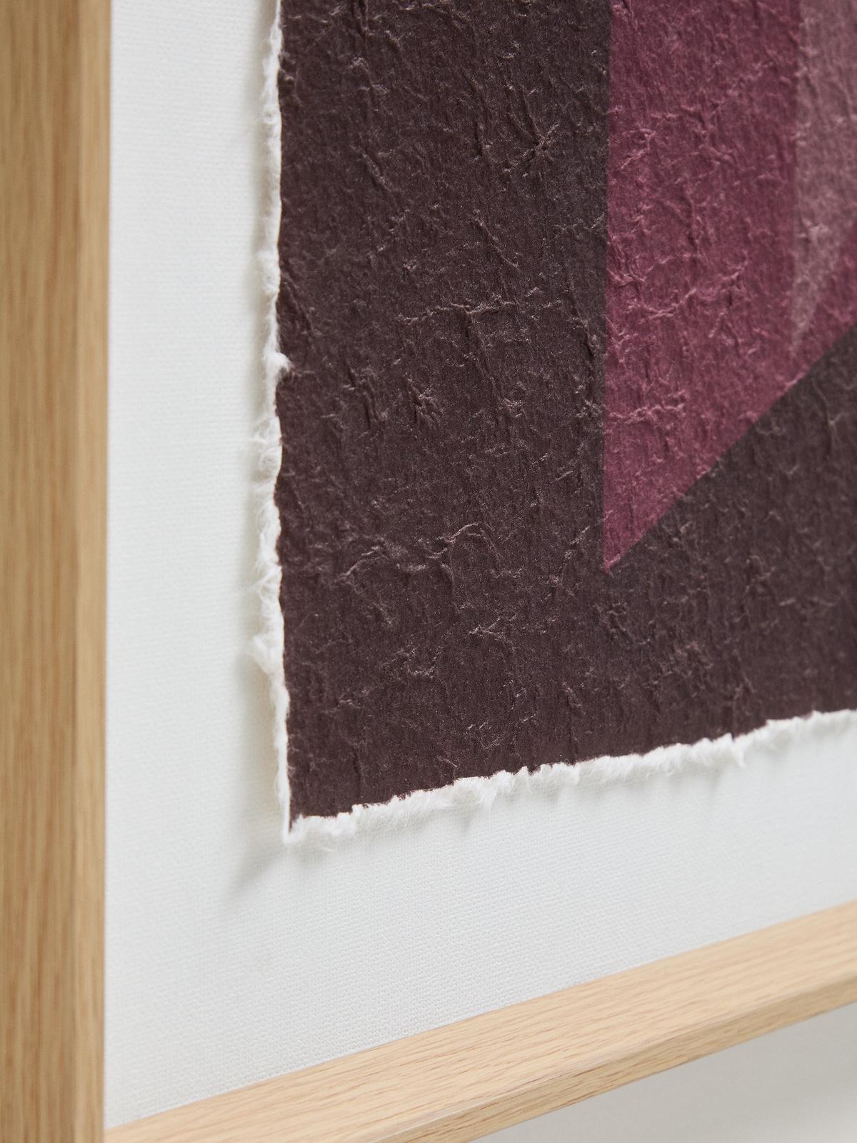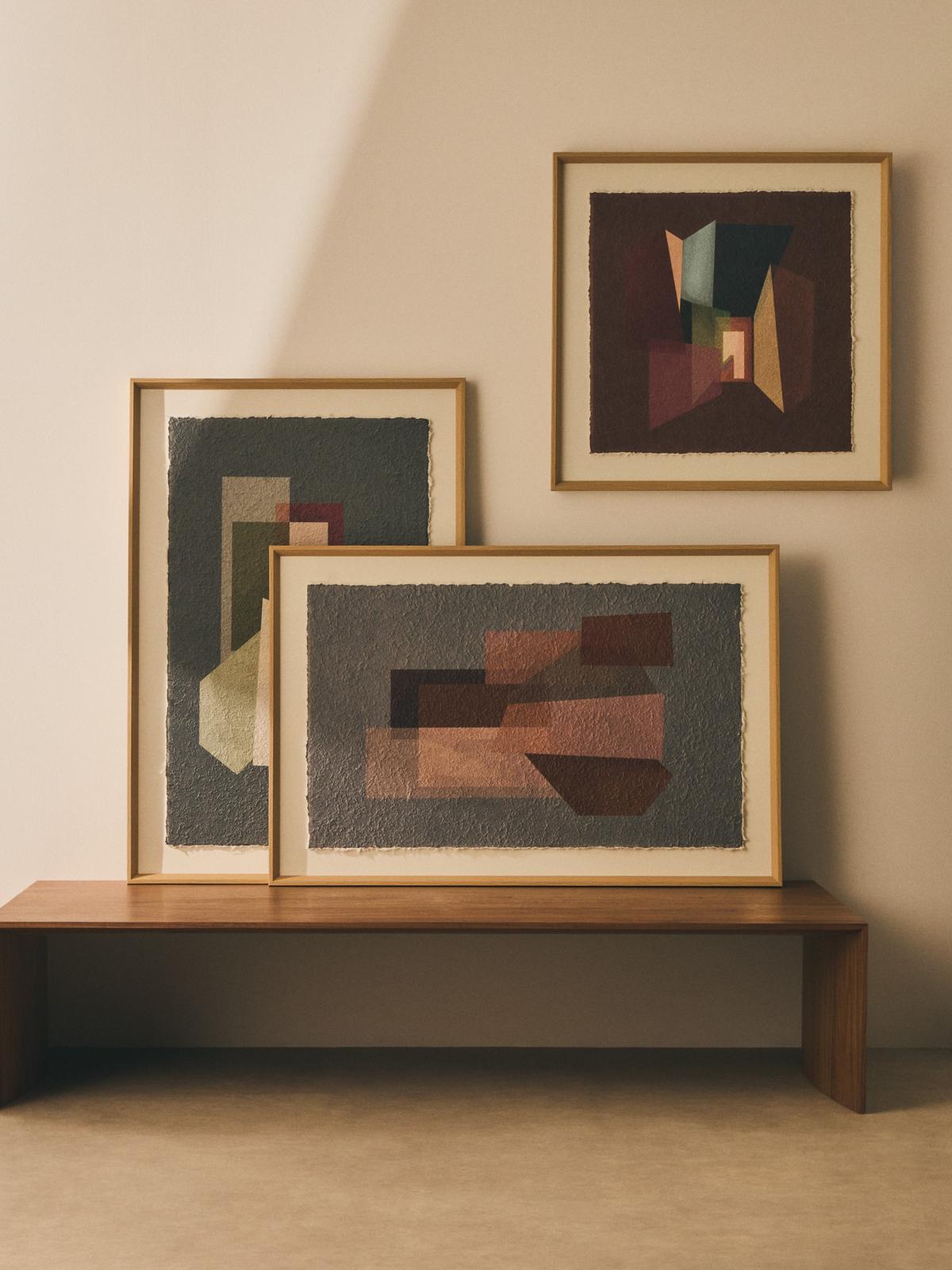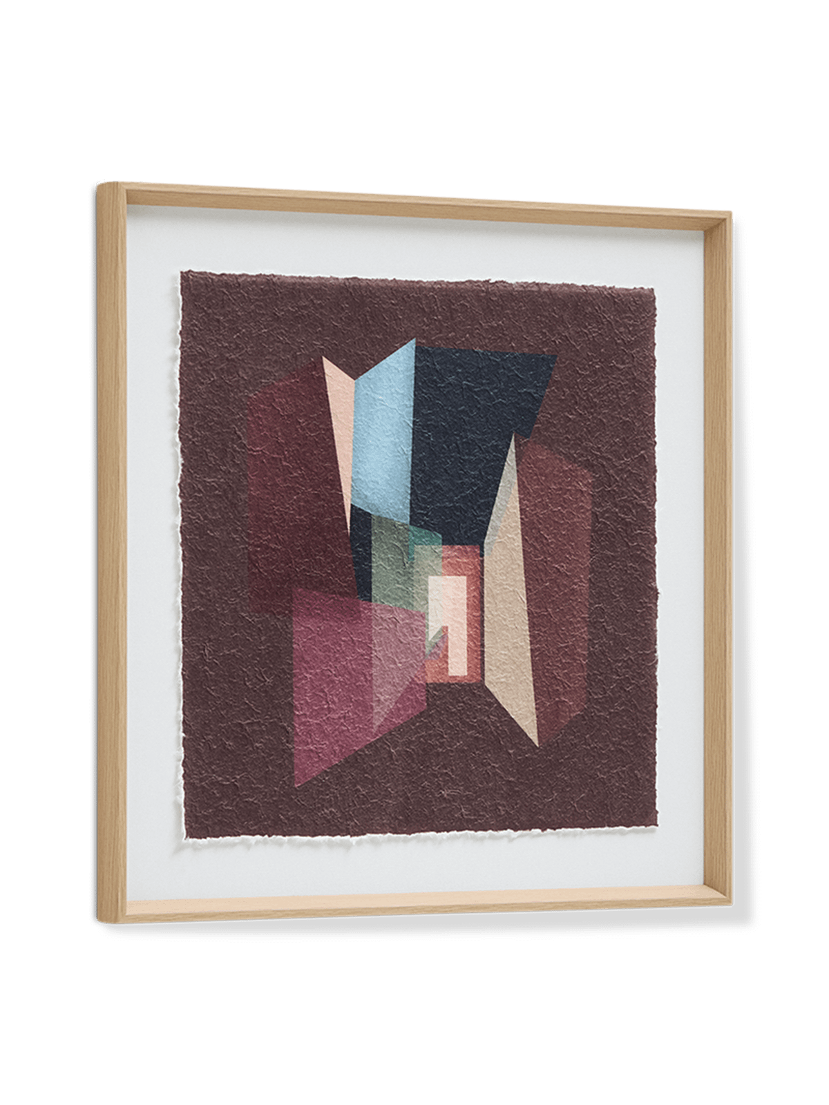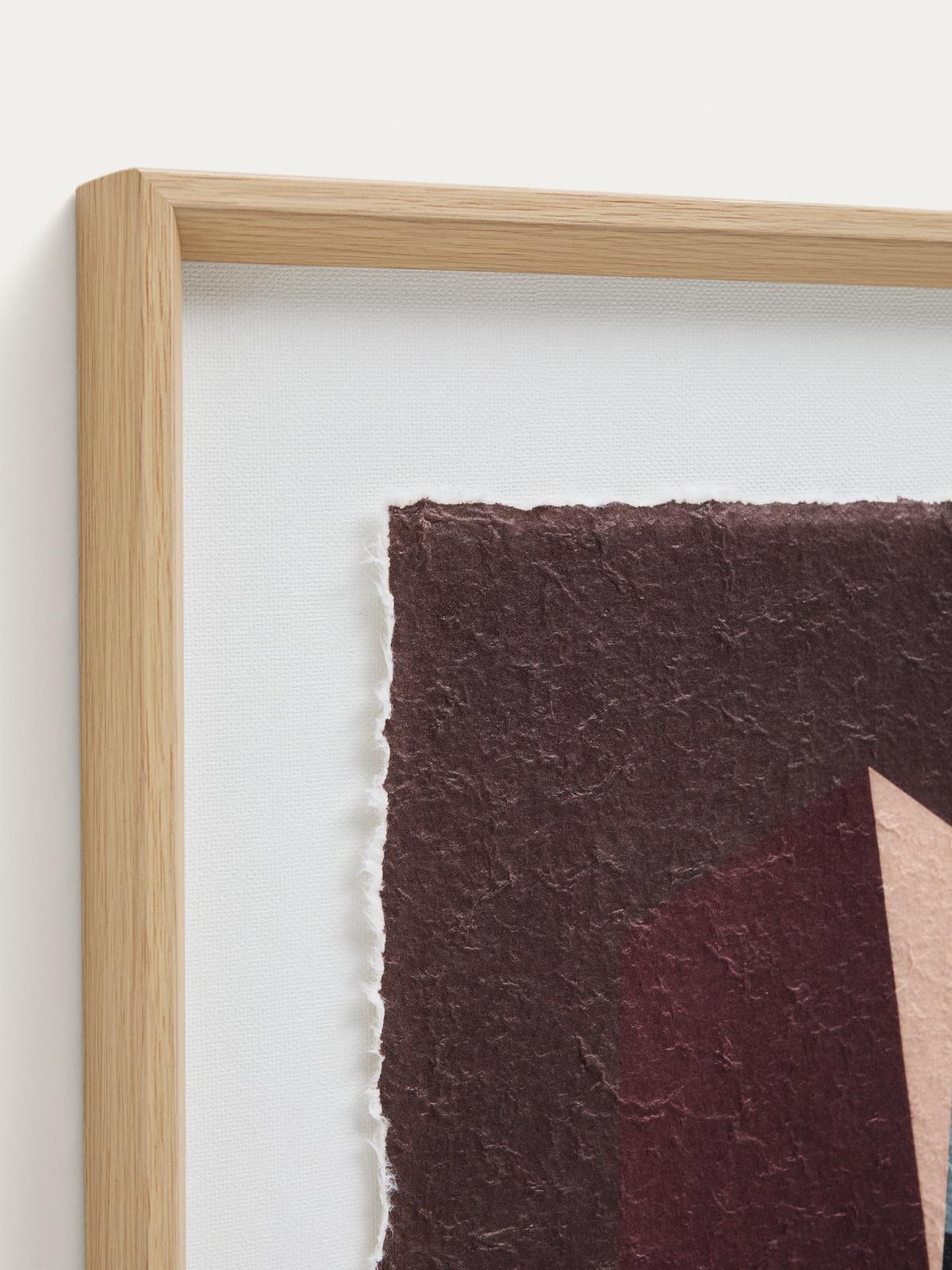 Dit schilderij is geïnspireerd op de kubistische stijl en architectuur uit het midden van de vorige eeuw. Het brengt diepte en karakter in elke omgeving dankzij de combinatie van geometrische vormen en een palet van grijze en bordeauxrode tinten. In dit ontwerp wordt architectuur gedeconstrueerd en gesynthetiseerd om het te weerspiegelen in een uniek artistiek kunstwerk, waar de superpositie van vlakken en het spel met transparanties een visueel effect creëren dat uitnodigt tot contemplatie en een punt van hedendaagse verfijning toevoegt. Het werk is afgedrukt op gerecycled papier en elk detail en elke textuur versterkt de artistieke kwaliteit. De lijst met strakke lijnen zorgt voor visuele lichtheid en laat het werk op zichzelf staan, zodat het gemakkelijk te combineren is met verschillende decoratiestijlen.