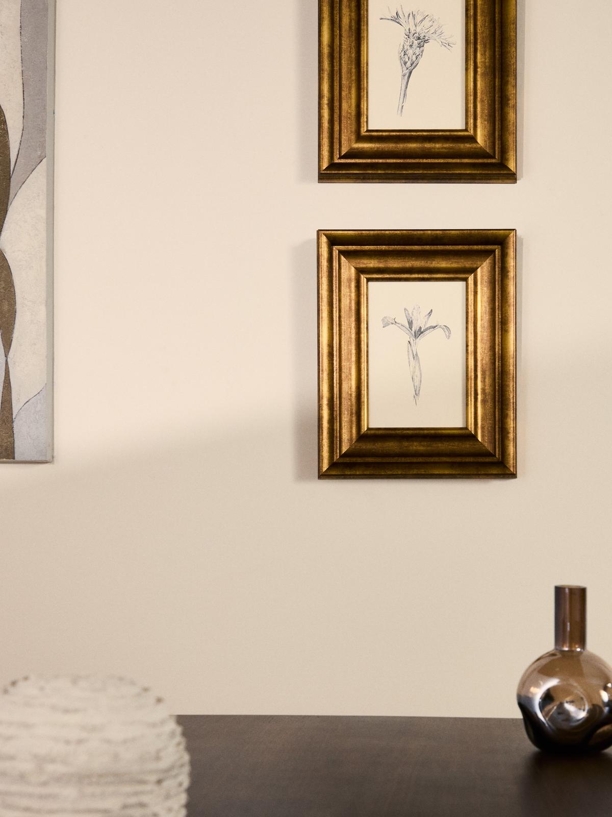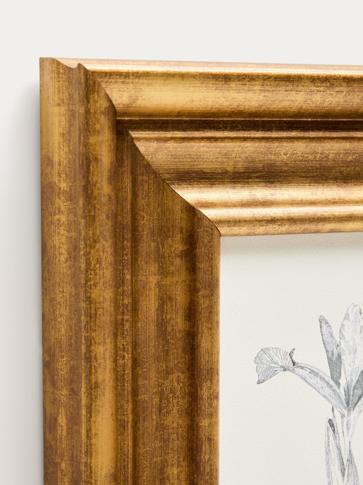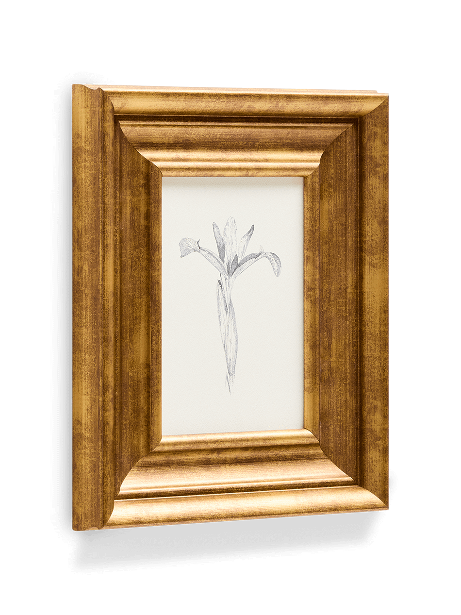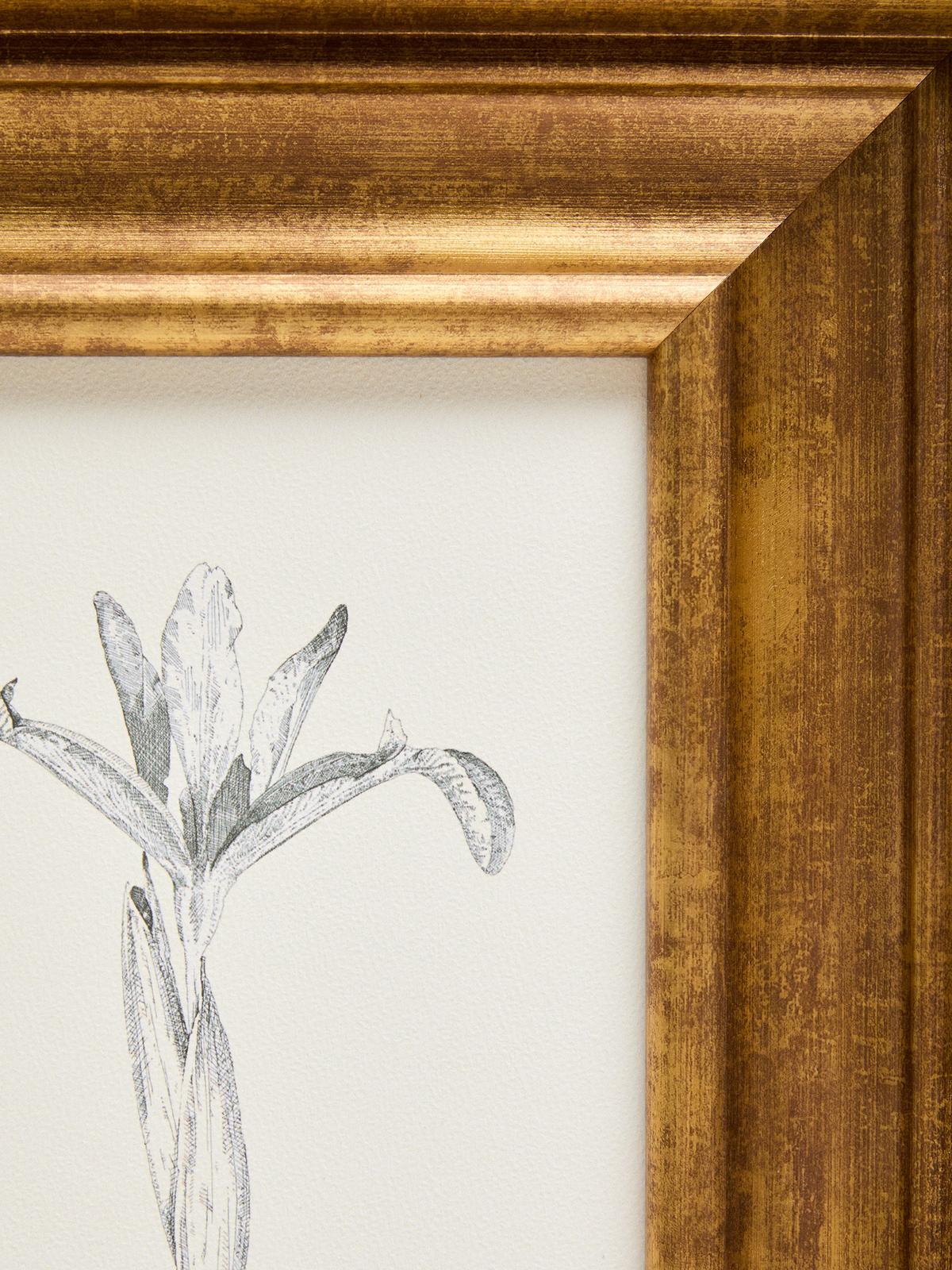 Dit schilderij toont een botanische illustratie in potlood die sereniteit en tijdloze elegantie uitstraalt. De delicate omtrek van de bloem steekt af tegen de neutrale achtergrond en nodigt je uit om te genieten van de kleine details. De houten lijst, geschilderd in een ouderwetse goudtint, doet denken aan de esthetiek van het midden van de vorige eeuw. Een perfect werk om een gedistingeerde sfeer toe te voegen aan woonkamers, slaapkamers of gangen, door kunst en design te combineren in een enkel decoratief element.