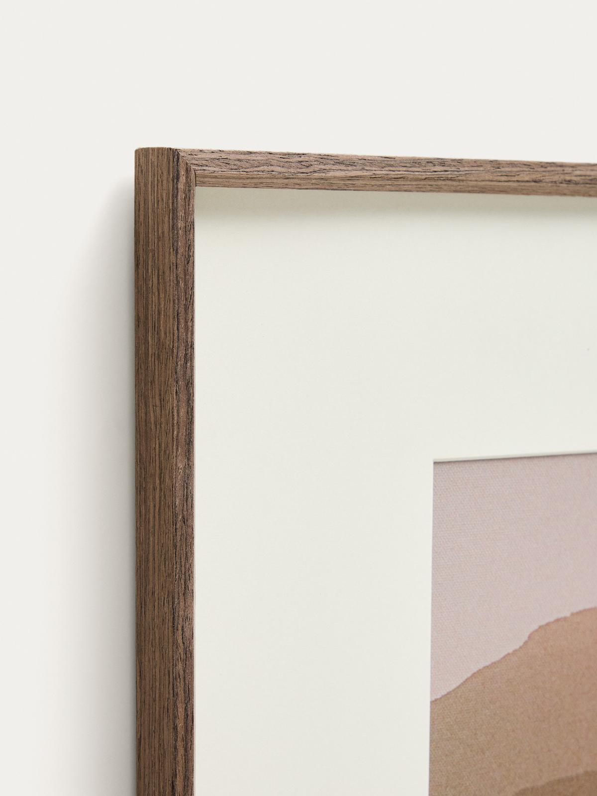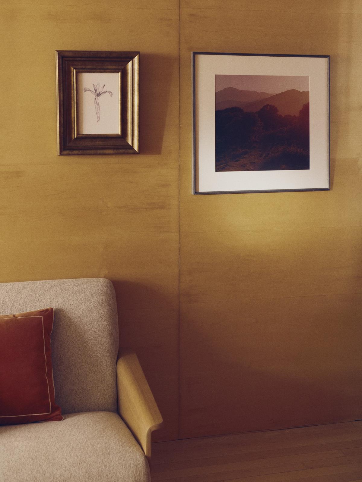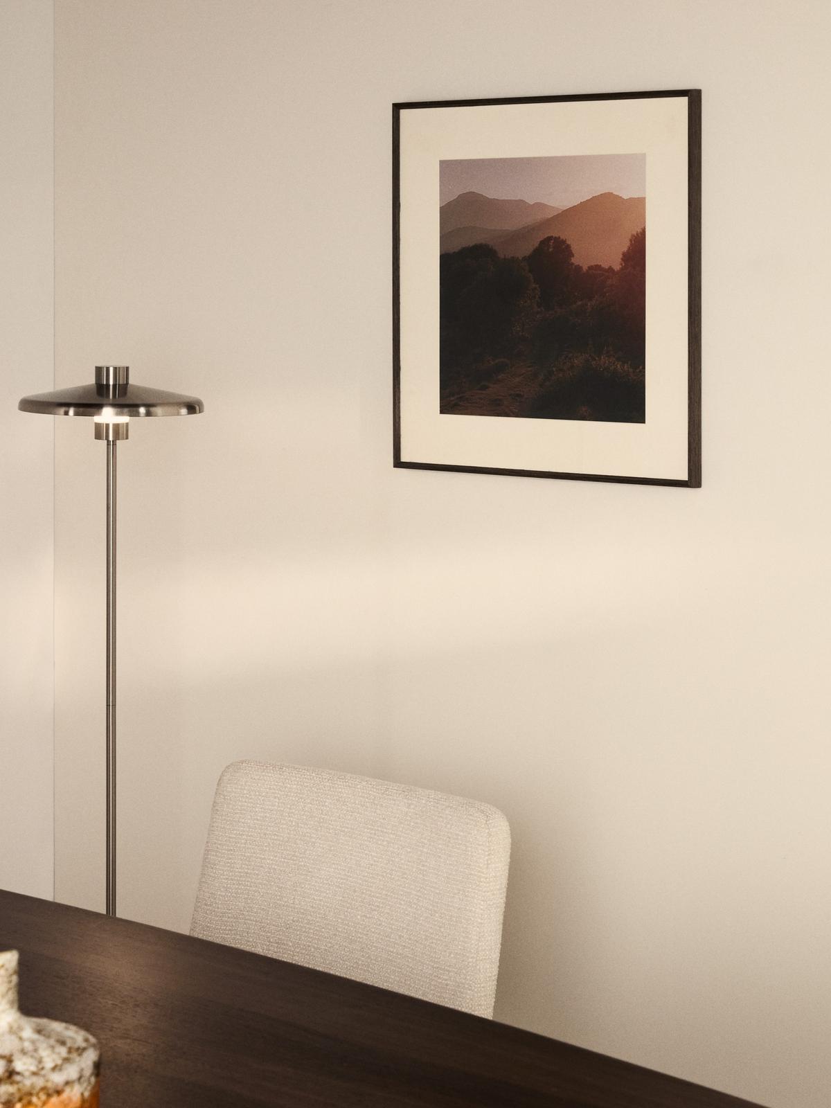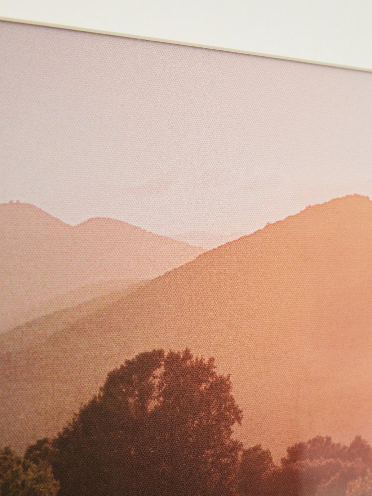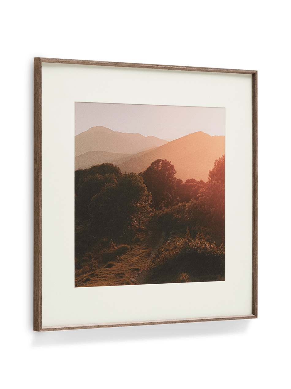 Dit kunstwerk is een landschapsfoto van La Garrotxa (Girona), gemaakt door Sara Lomas met een 35 mm analoge camera en een 4:5 kader. De foto geeft de serene sfeer weer van de natuur bij zonsondergang, met zacht licht dat het profiel van de bergen en de begroeiing goed laat uitkomen.