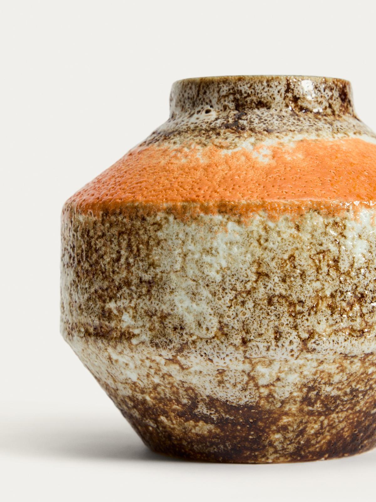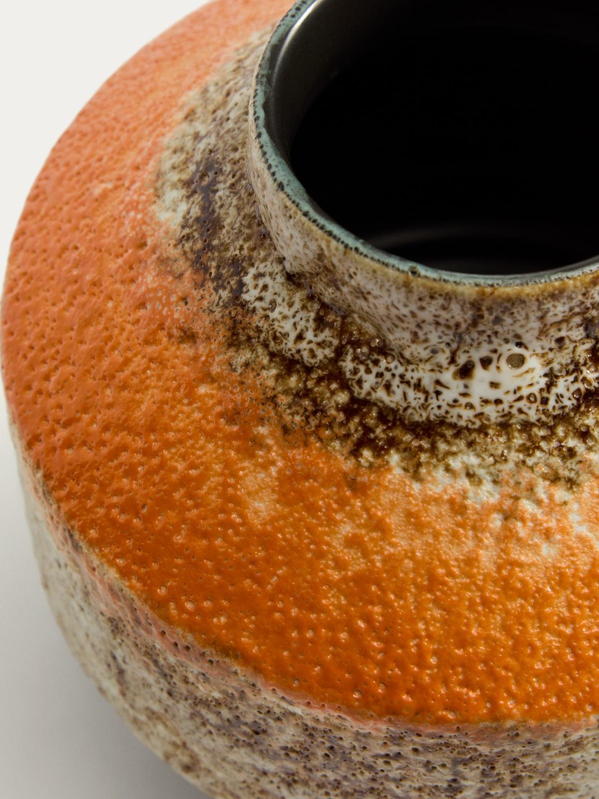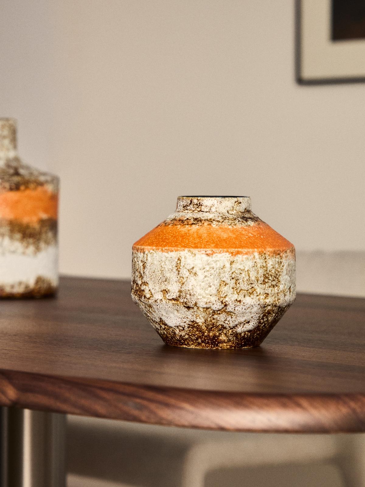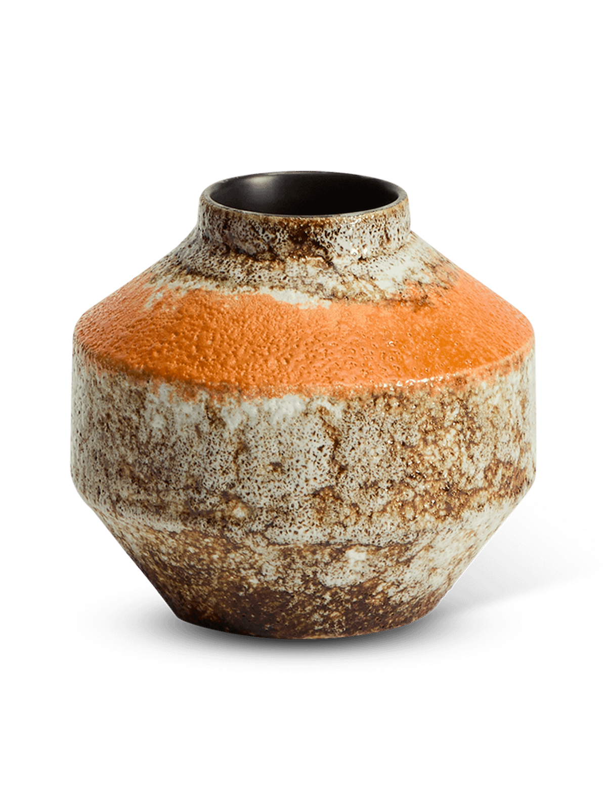 In de Estin-collectie is elk stuk met de hand gemaakt, waardoor geen twee hetzelfde zijn. Het glazuurproces zorgt voor unieke tinten en texturen. De geometrische vorm en strakke lijnen worden versterkt door de combinatie van aardetinten en warm oranje, wat een subtiel en verfijnd contrast oplevert. Perfect om een tafel, plank of console in de kijker te zetten, solo of met gedroogde bloemen of takken.