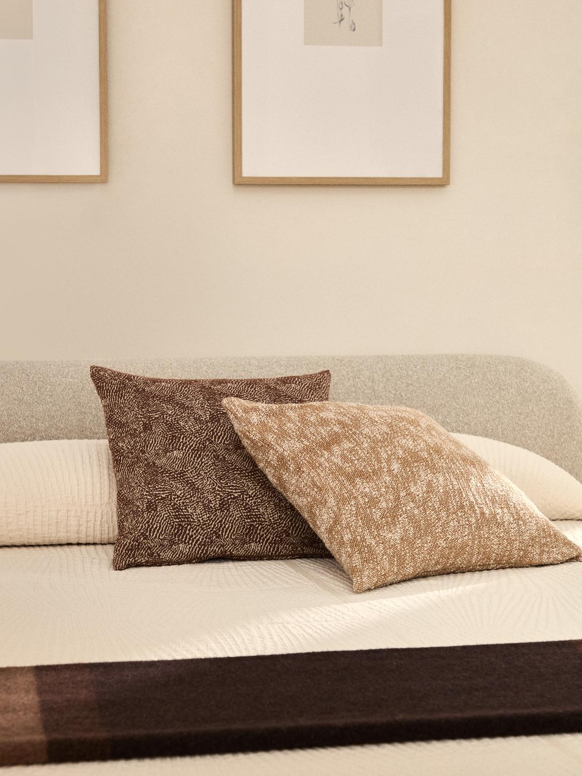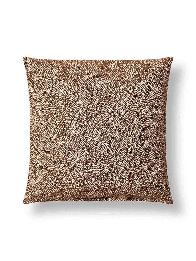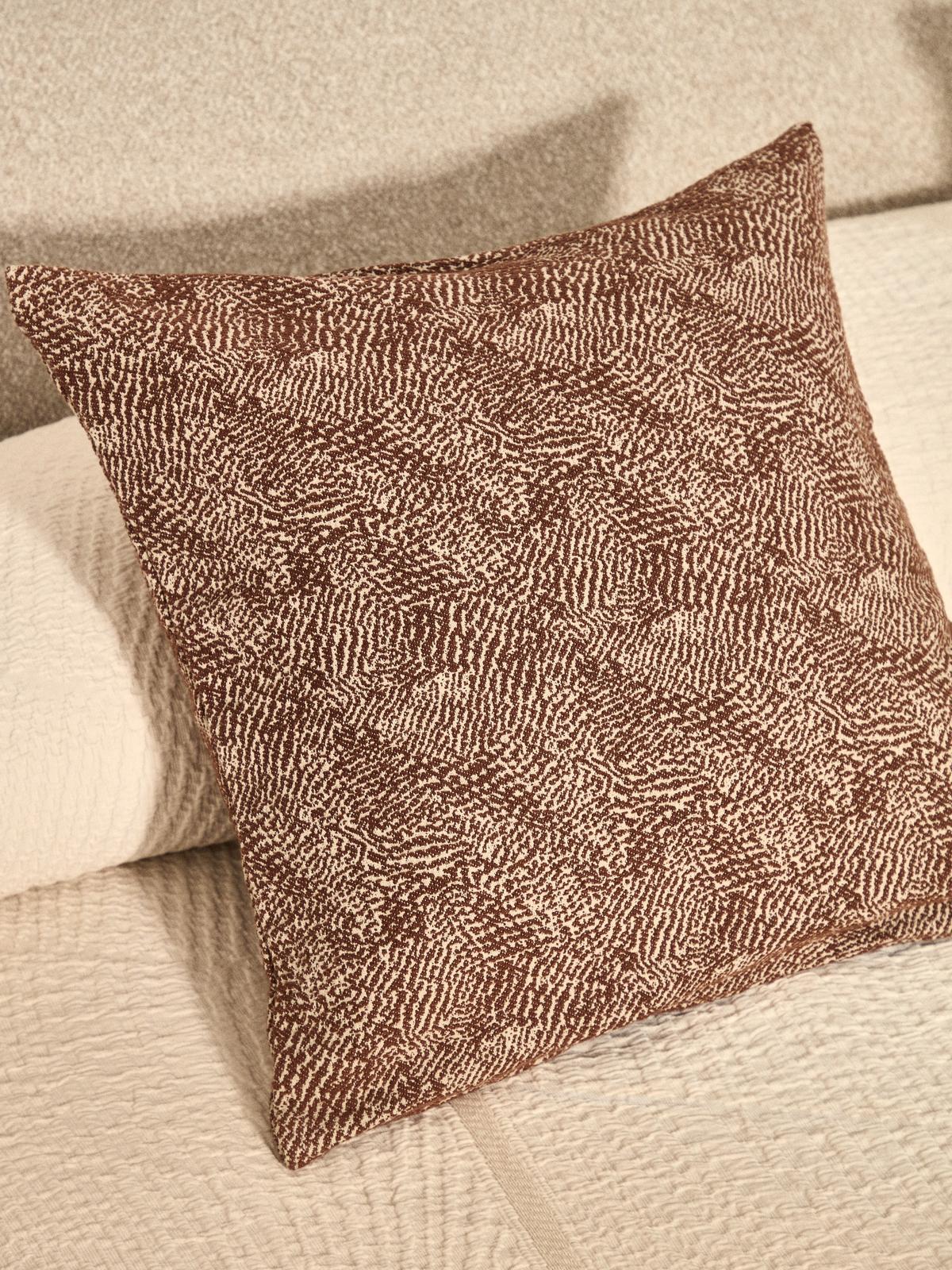 Deze kussenhoes combineert de tijdloze elegantie van jacquard met de warmte van aardetinten en het contrast van organische vormen. De katoenen stof biedt een aangename en sterke textuur die elk interieur verrijkt. Elke hoes is met de hand vervaardigd en is uniek, met subtiele variaties.