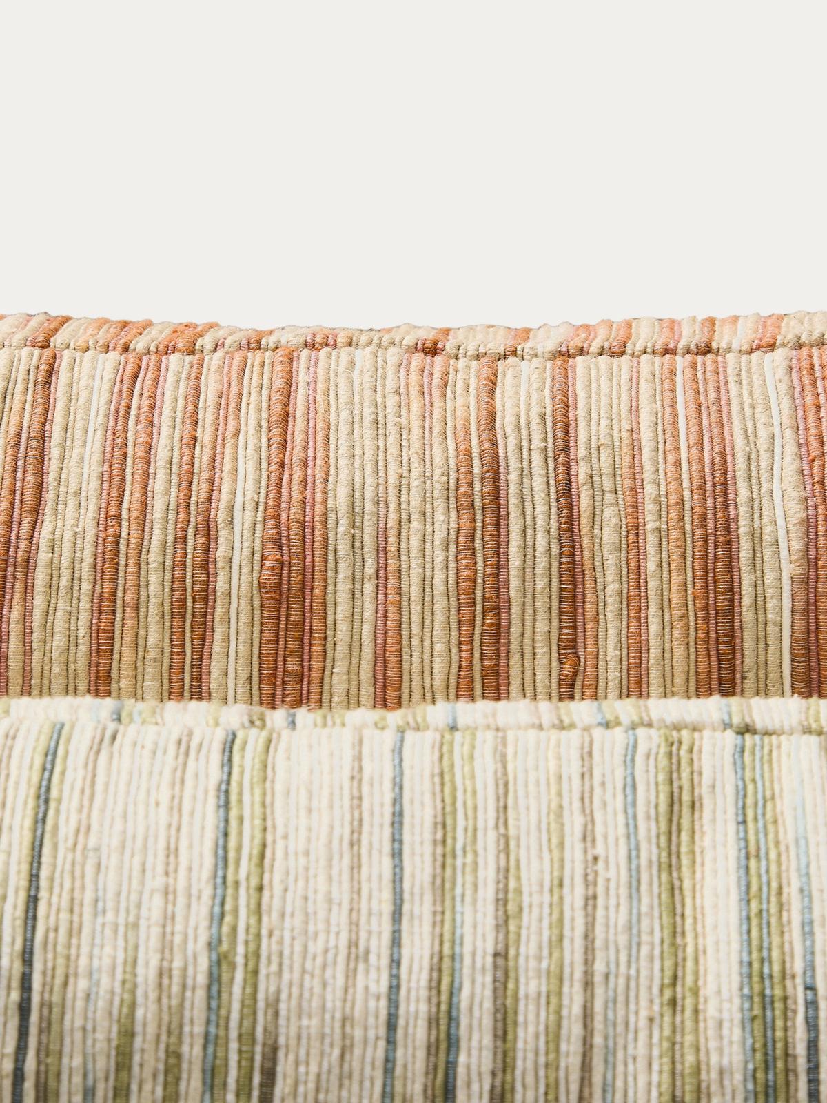 Deze kussenhoes is gemaakt van een exclusieve hoogwaardige zijdemix, geselecteerd om zijn unieke zachtheid en hoge weerstand, perfect voor dagelijks gebruik. De hypoallergene eigenschappen maken het een ideale keuze voor wie op zoek is naar comfort en welzijn in elk detail van het huis. Het ontwerp heeft een gestreept jacquardpatroon voor een geraffineerde en tijdloze look. Elk product wordt met de hand gemaakt op traditionele weefgetouwen, waardoor aandacht voor detail en een onberispelijke afwerking gegarandeerd zijn.