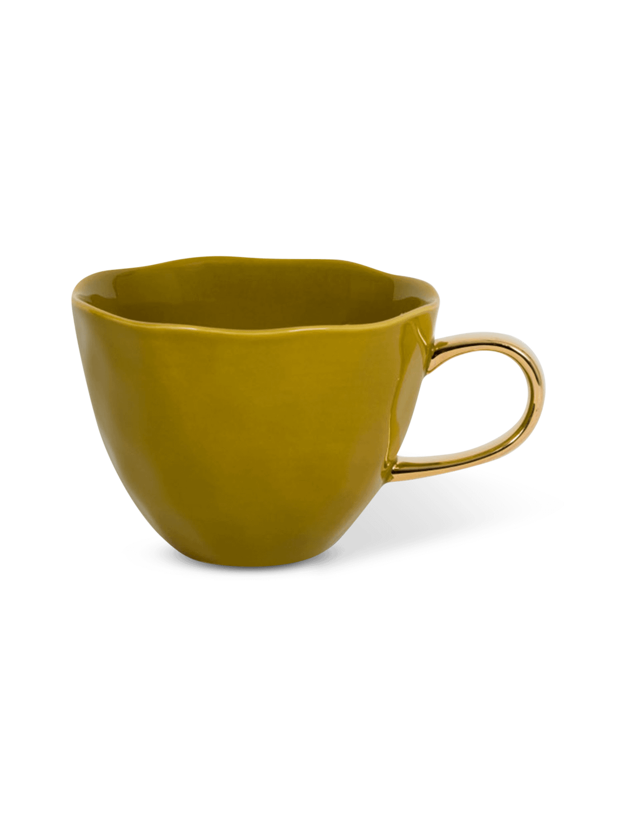 De Good Morning mok in ambergroen geeft je koffiemoment een verfijnde uitstraling, terwijl het gouden oor zorgt voor een luxueus accent. Ideaal voor een geurige thee of romige cappuccino, elke dag opnieuw.