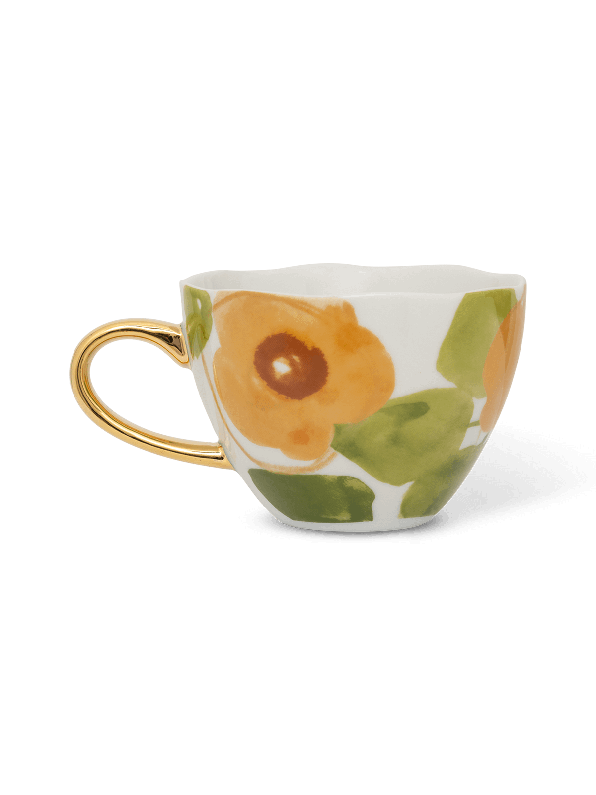 De Good Morning mok met bloemendesign brengt kleur en energie aan je tafel. Met warme tinten en glanzend gouden oor is deze mok een echte blikvanger. Perfect voor thee of cappuccino – en een instant goed humeur.