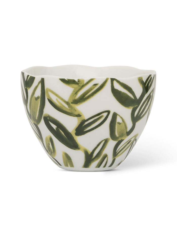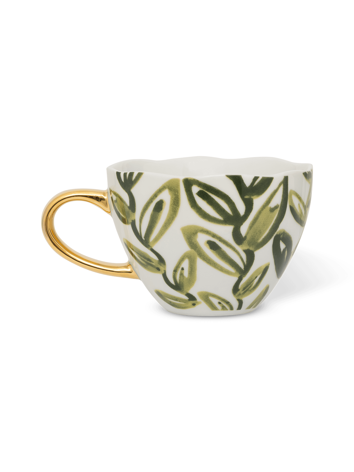 De Good Morning mok met olijftakken brengt mediterrane charme in huis. Het speelse bladerpatroon in zachte groentinten contrasteert mooi met het elegante gouden oor. Perfect voor een warme cappuccino of rustgevende thee – en altijd een stijlvolle toevoeging aan je servies.