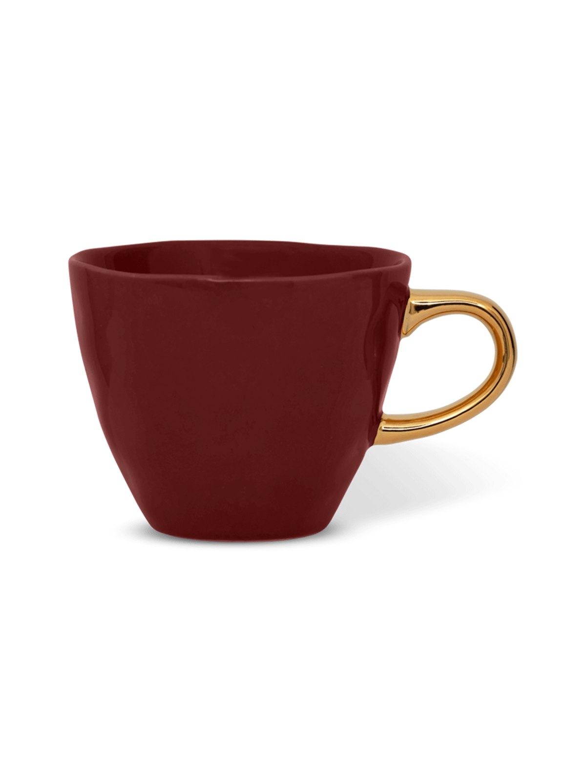 De Good Morning koffiemok in burgundy is de perfecte mix van warmte en elegantie. De diepe wijnrode kleur in combinatie met het glanzende gouden oor geeft deze mok een luxueuze uitstraling. Ideaal om je koffie met klasse te serveren.
