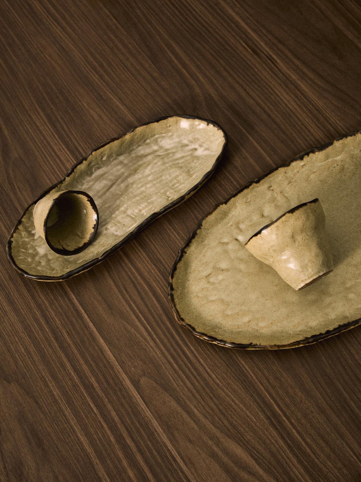 De Abela-collectie valt op door haar organische, onregelmatige vormen, die een eigentijdse uitstraling aan de tafel geven. Door het glazuurproces heeft elk stuk unieke kleurnuances en texturen, waardoor geen twee items hetzelfde zijn. De bruine afwerking en licht golvende rand geven het geheel extra karakter en diepte.