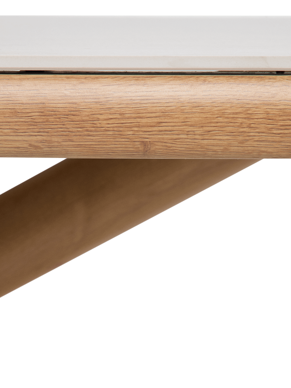 Het tafelblad in gesinterde steen staat garant voor kwaliteit en gebruiksgemak. Dit sterke materiaal is niet alleen waterdicht, maar ook bestand tegen krassen, vlekken en extreme temperaturen. Zo blijft de tafel er jarenlang verzorgd uitzien.