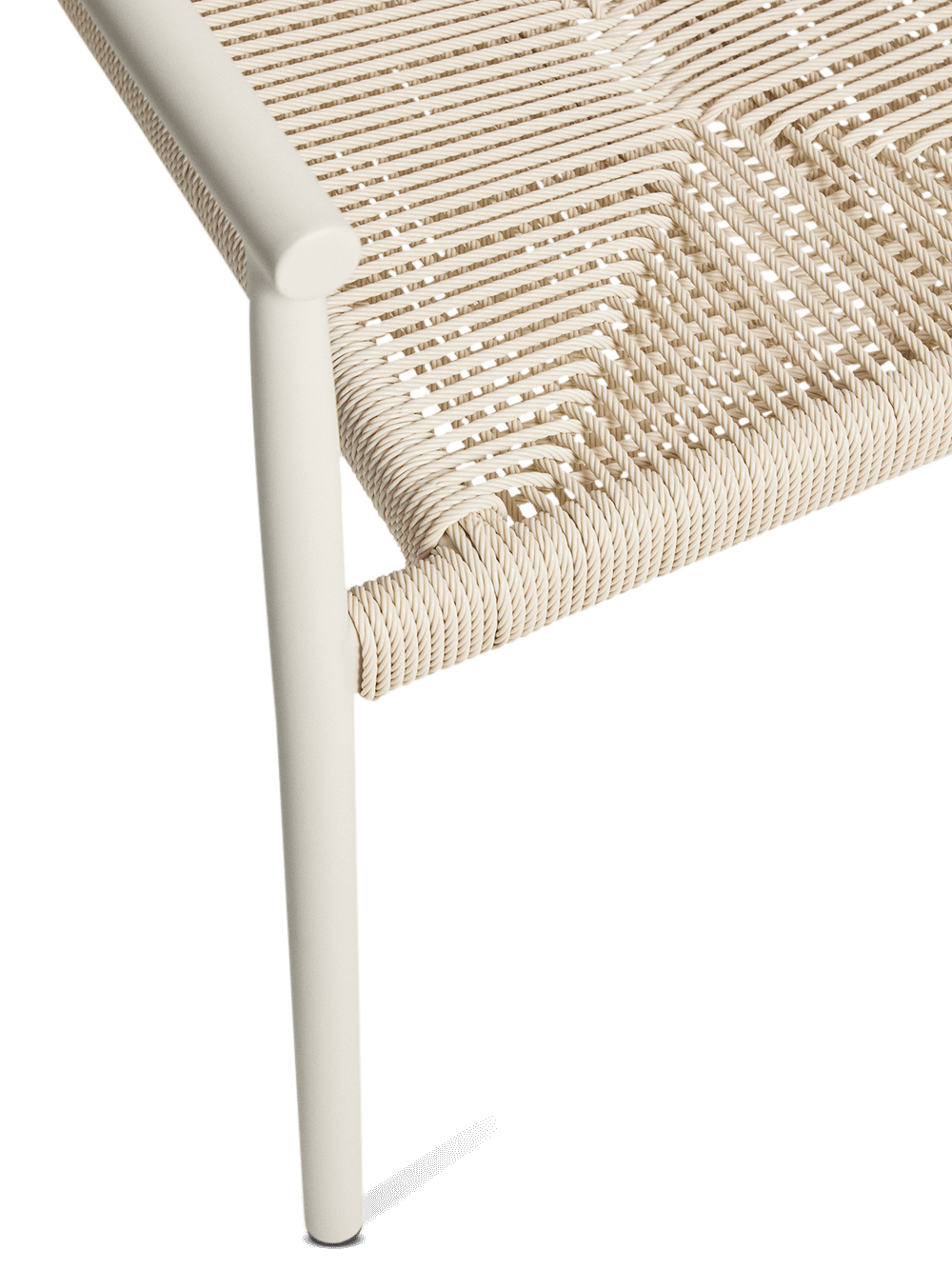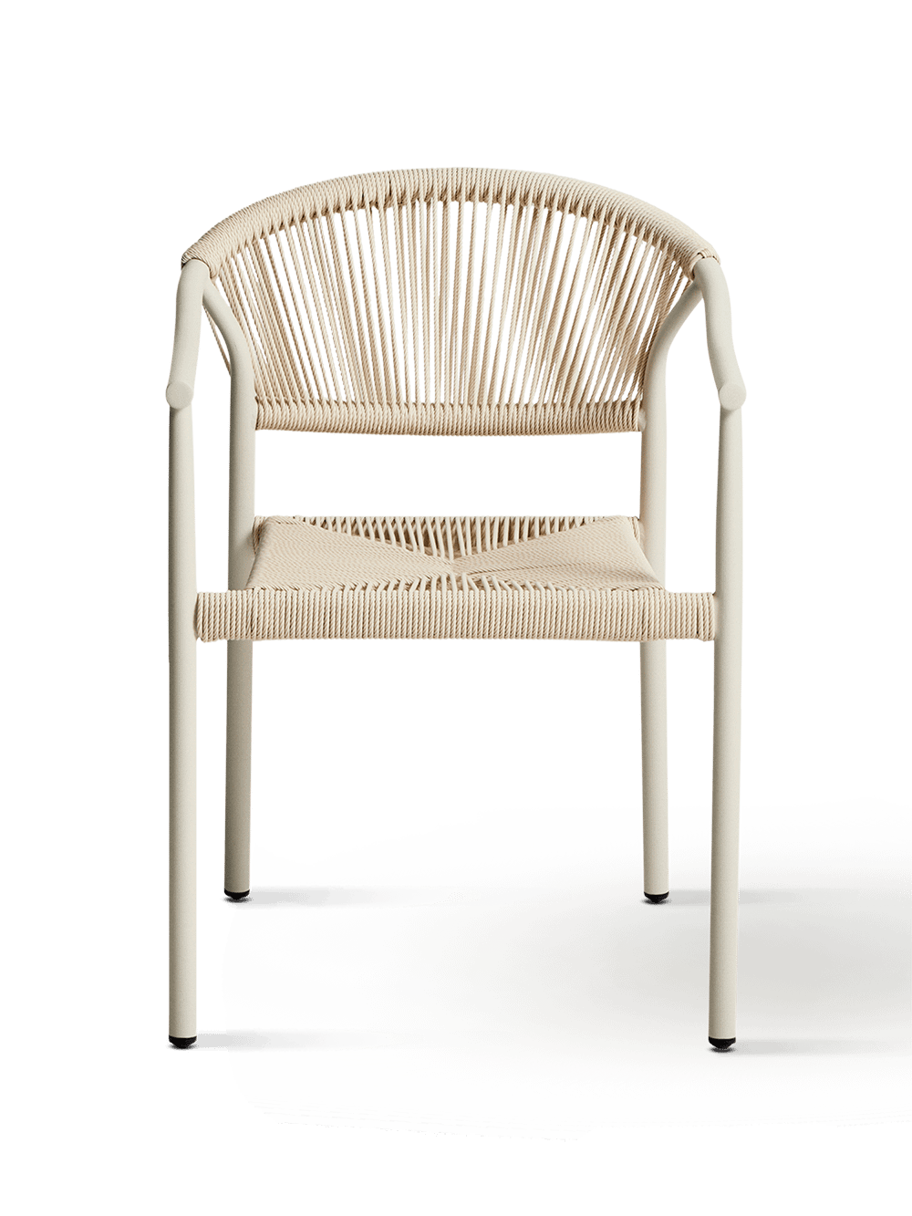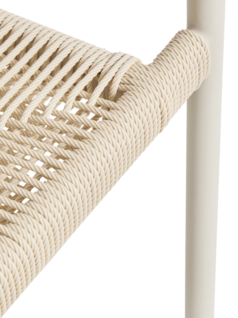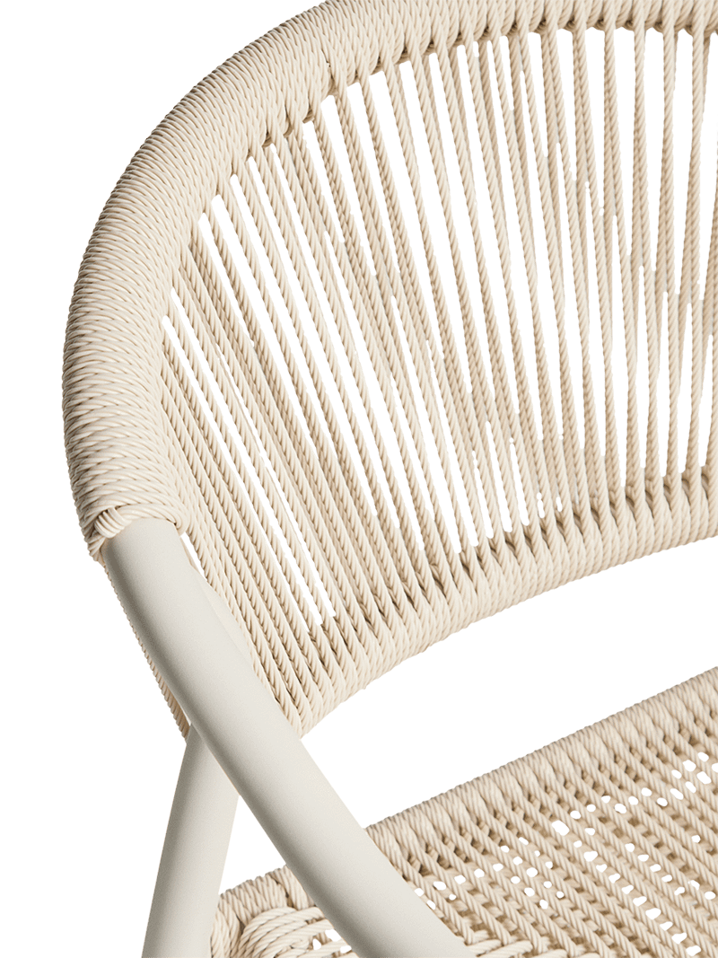De rugleuning en zitting zijn afgewerkt met handgevlochten synthetisch touw in een elegante ecru tint. Dit materiaal zorgt voor een comfortabele zit en een textuur die perfect aansluit bij het design. Dankzij het stapelbare ontwerp kan je meerdere stoelen eenvoudig opbergen zonder veel plaats in te nemen. De kunststof beschermers onder de poten helpen bovendien om krassen of beschadigingen op de ondergrond te voorkomen.