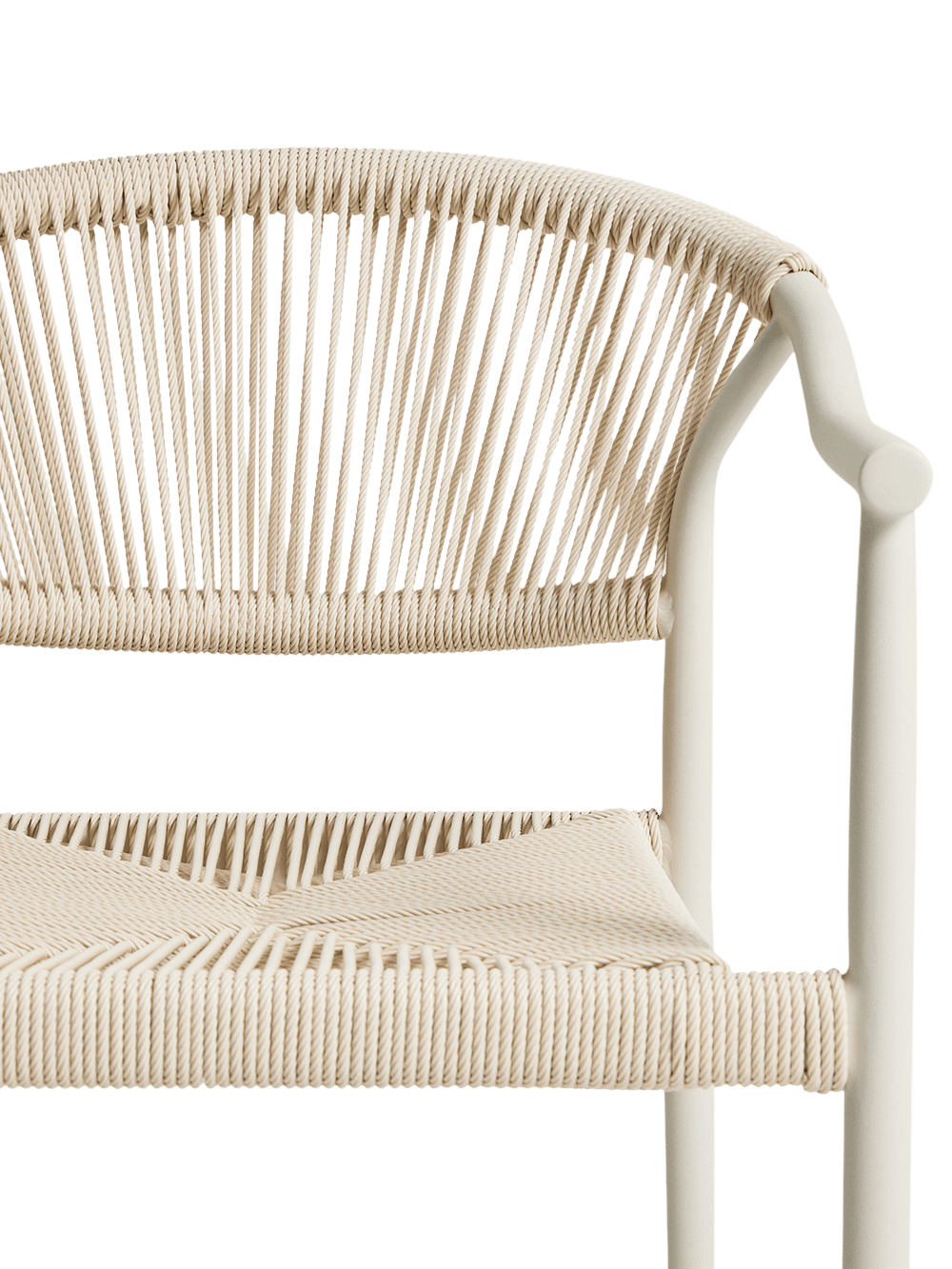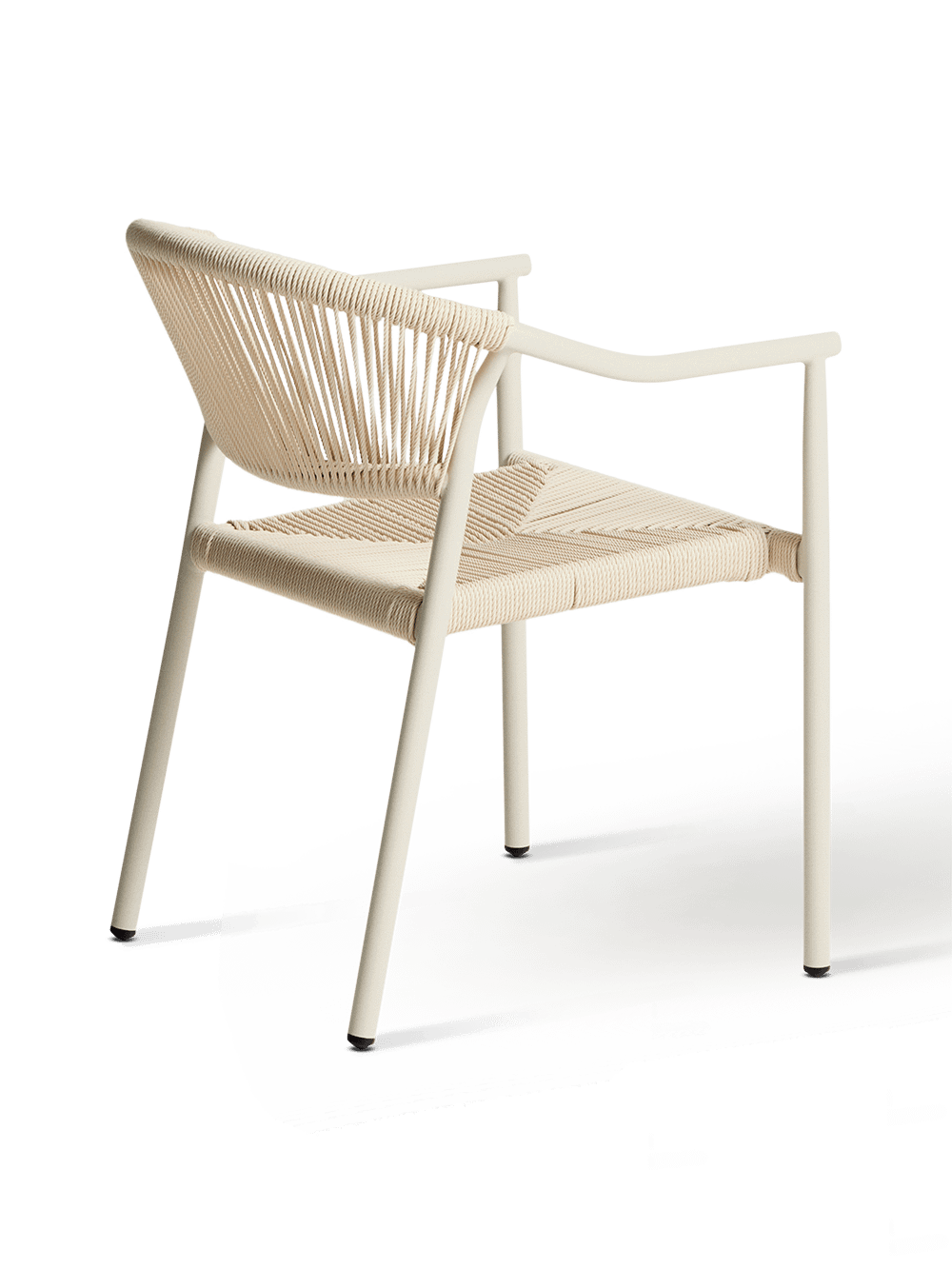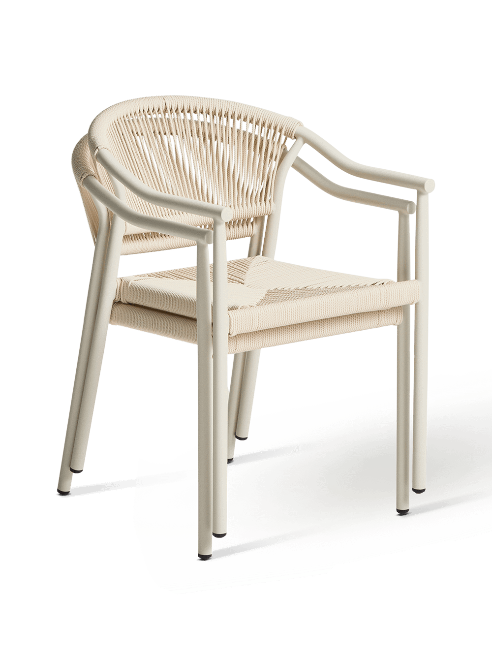 De rugleuning en zitting zijn afgewerkt met handgevlochten synthetisch touw in een elegante ecru tint. Dit materiaal zorgt voor een comfortabele zit en een textuur die perfect aansluit bij het design. Dankzij het stapelbare ontwerp kan je meerdere stoelen eenvoudig opbergen zonder veel plaats in te nemen. De kunststof beschermers onder de poten helpen bovendien om krassen of beschadigingen op de ondergrond te voorkomen.