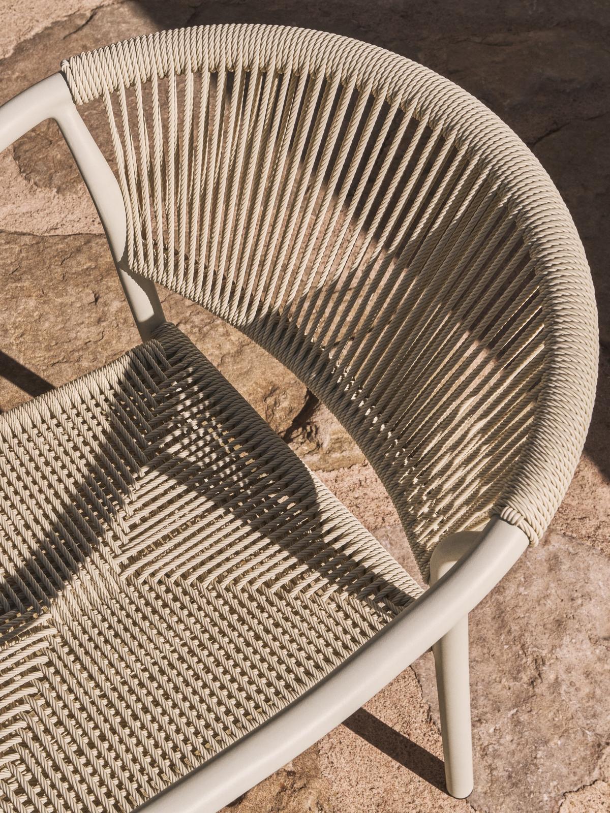 De Livadia stoel in ecru van Kave Home straalt rust uit. Dankzij de lichte kleur brengt deze stoel een frisse en uitnodigende sfeer naar elk terras of elke tuin. De afgeronde lijnen en het open vlechtwerk in de rugleuning geven het ontwerp een luchtig karakter.